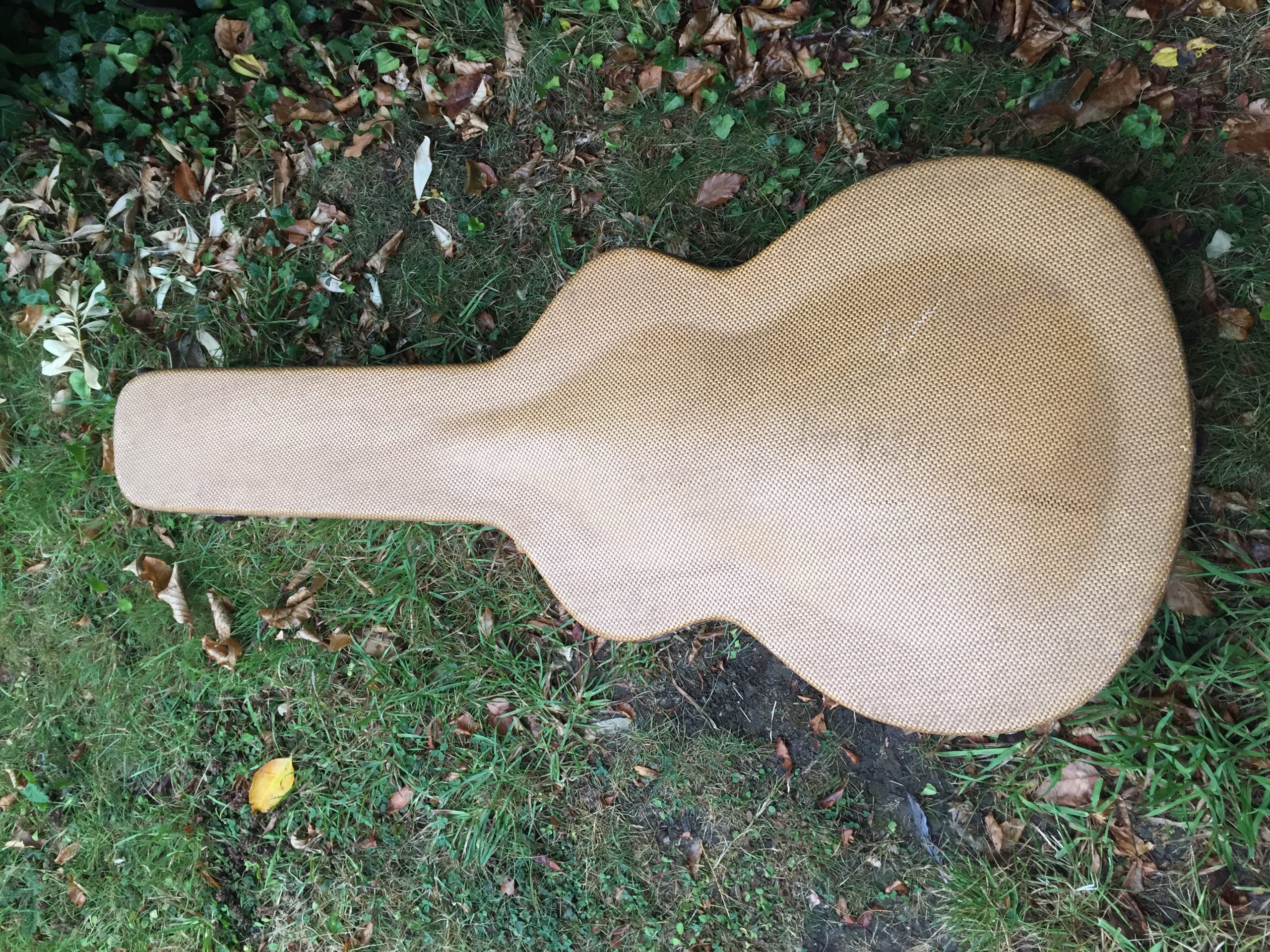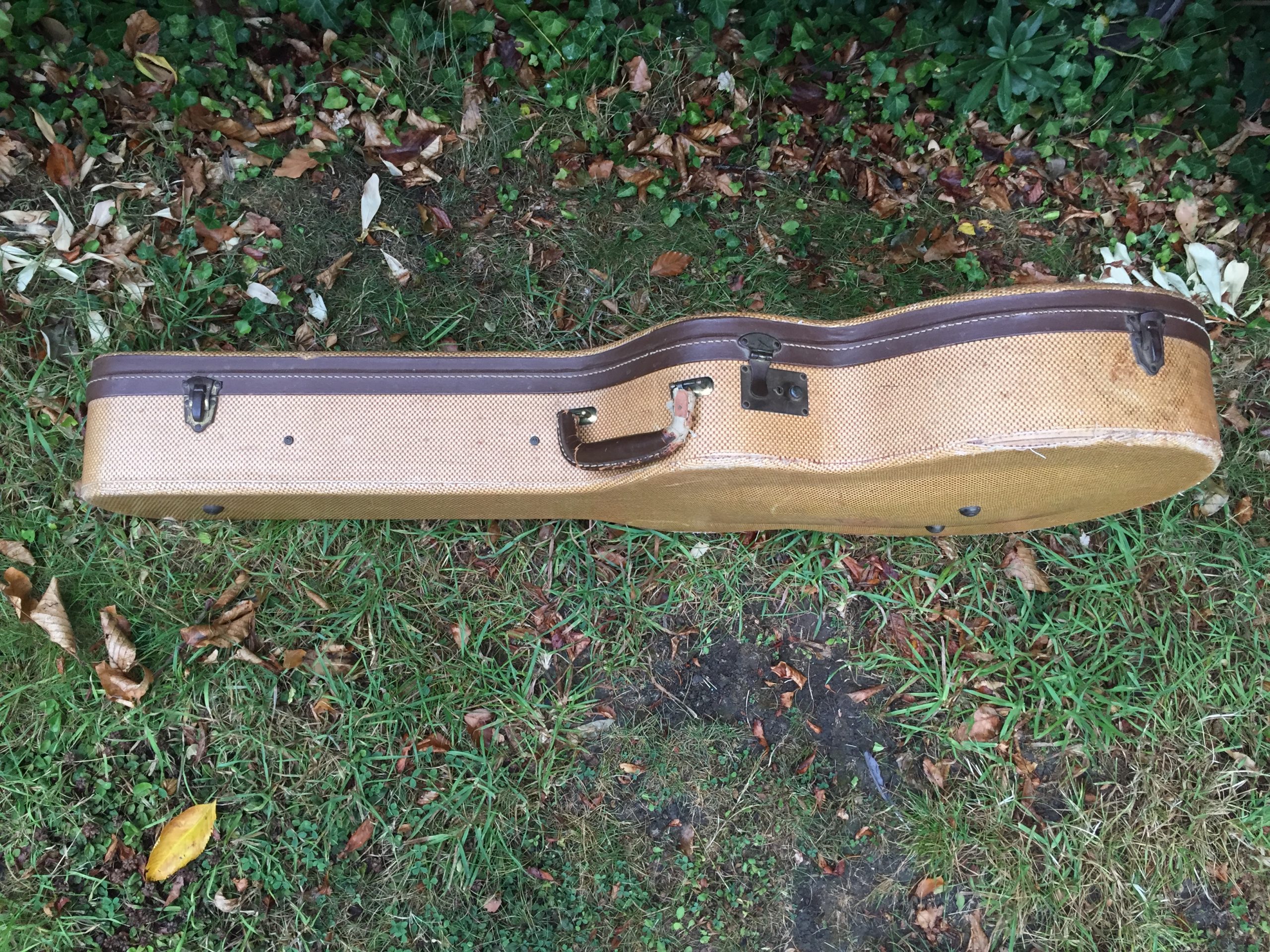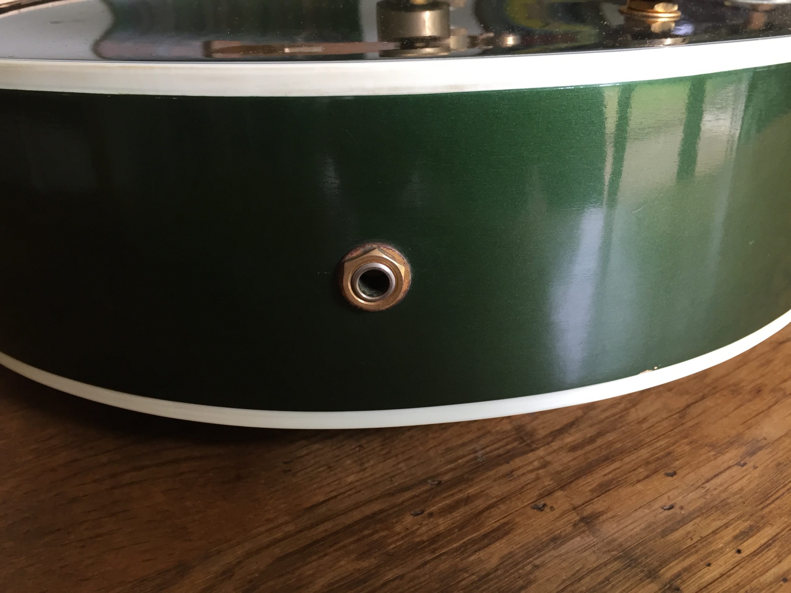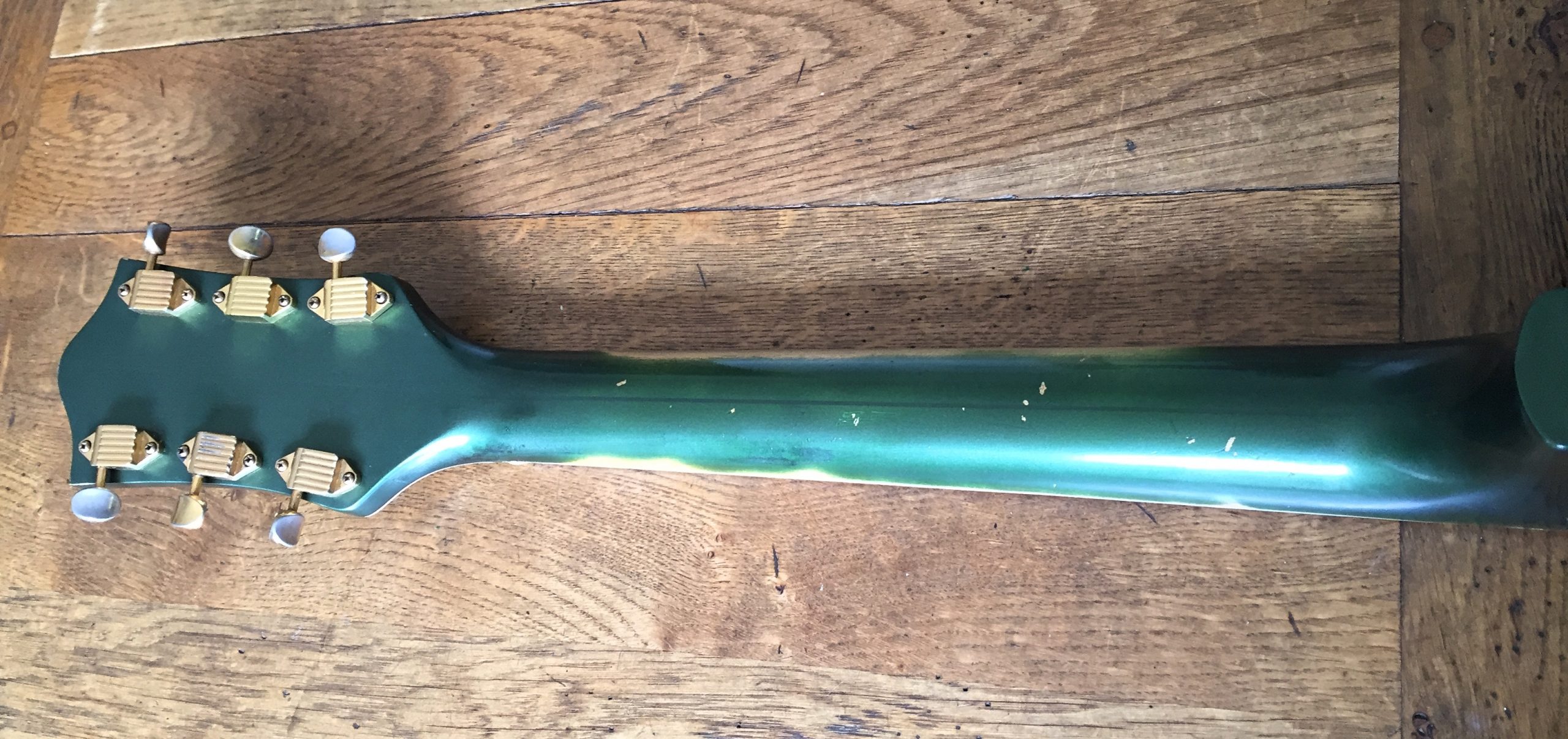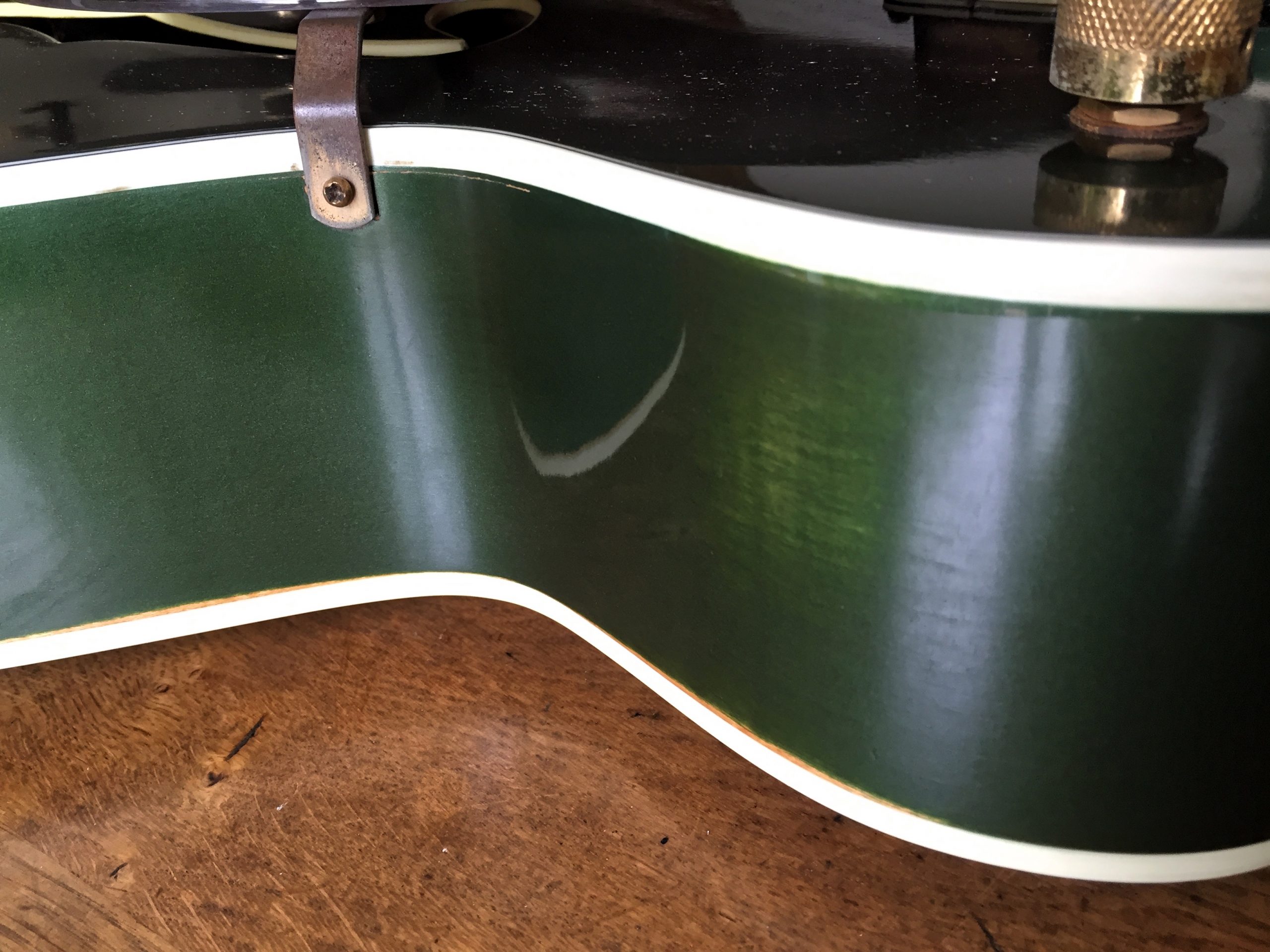 Here we have a most beautiful debut year 1954 Gretsch 6196 Cadillac Green Country Club from the #132xx batch. It has all the early features such as a 3 1/4 ” body depth that reduces to 2 3/4″ in 1955, “Waffle” back Kluson tuners, “Bullet” truss rod cover and the part anodised part gold plate “G” tailpiece with smooth plain gold control knobs. The guitar has an accurate reproduction tortoise shell guard as the original celluloid has long decomposed as they all do. The guitar has its gold Melita bridge which in itself is a thing of beauty and the two Dynasonic pickups are strong and clear in output. The guitar has a great neck angle and i can see no evidence of any past reset nor any needed. Until relatively recently this was a cherished one owner guitar that was clearly played mostly in the seated position with most of the age related play wear to the back of the neck. The frets and fingerboard are also in fine condition and the guitar is ready to give its next 66 years service. Even the case tweed is nice and crisp and matches the guitar for preservation. The Country Club shares the same basic construction foot print as Gretsch’s top of the line White Falcon and as such have a unique tone given by their maple hollow bodied 17″ wide body and Dearmond set up. A great guitar for the player or collector looking for that great 1950’s Gretsch sound! With the coolest of the coolest colour.