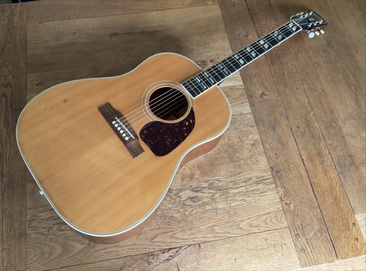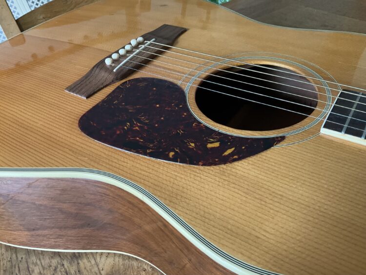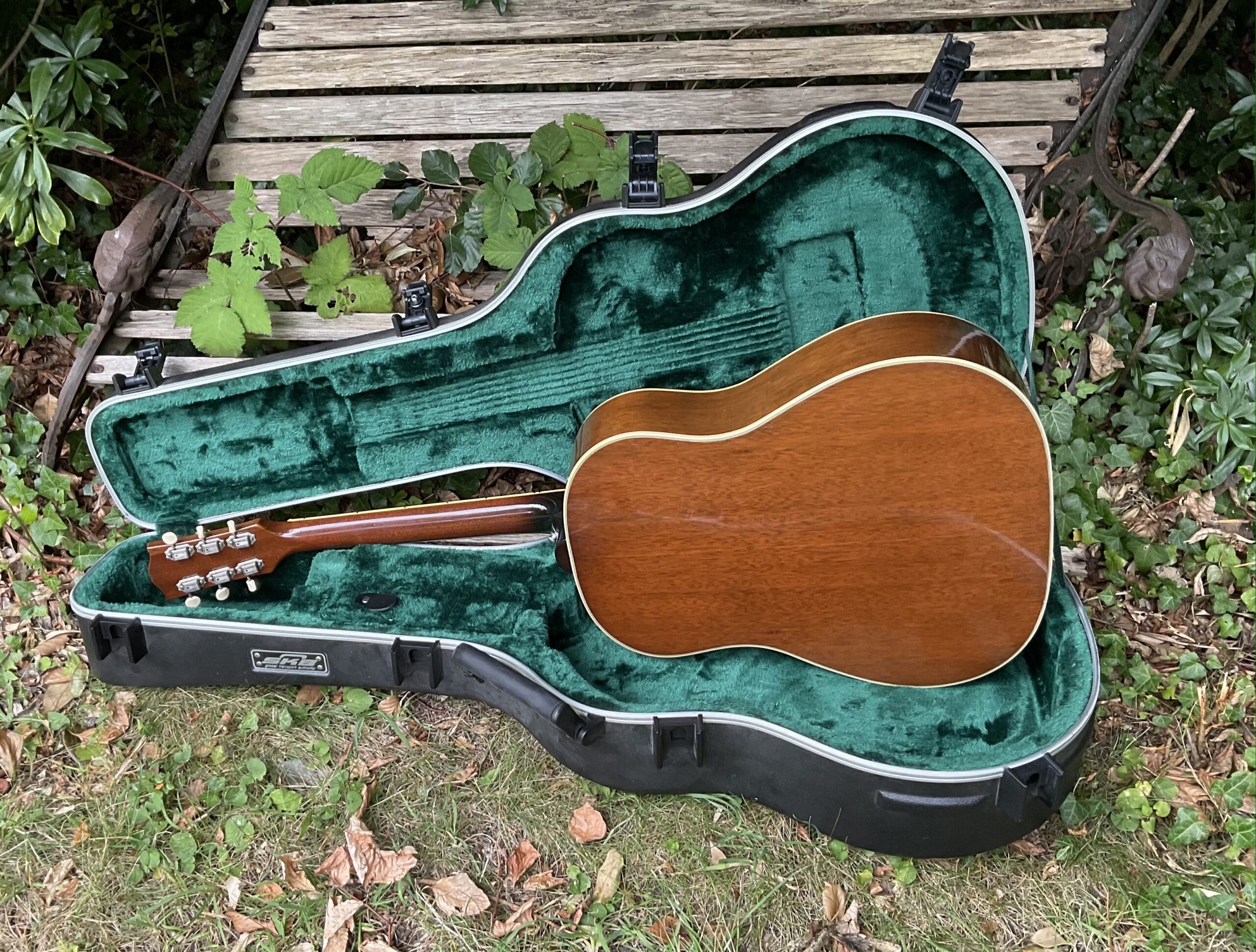 Probably one of the last Southern Jumbos ordered in natural finish before the model was replaced with the “Country Western” which came standard in natural to satisfy the increasing demand. Same guitar, different label. This one has had its bridge changed in the past which looks to be shaved down to accommodate a lower playing action, although the guitar plays well in the cowboy positions its probably looking at a neck reset in the not too distant future. The tuning pegs although correct are mid 1960’s versions probably replaced due to crumbling buttons. The guitar has a fantastic wide grained Sitka? Top, tear drop pick guard, spruce top and mahogany back and sides, its in very good shape for its years but does carry a few scars. This model is always an attractive desirable model on account of the split parallelogram inlays and bound neck. This would have been a special ordered guitar which was only available from 1954 through to the introduction of the CW in late 1955, therefor quite a hard and rare guitar to find