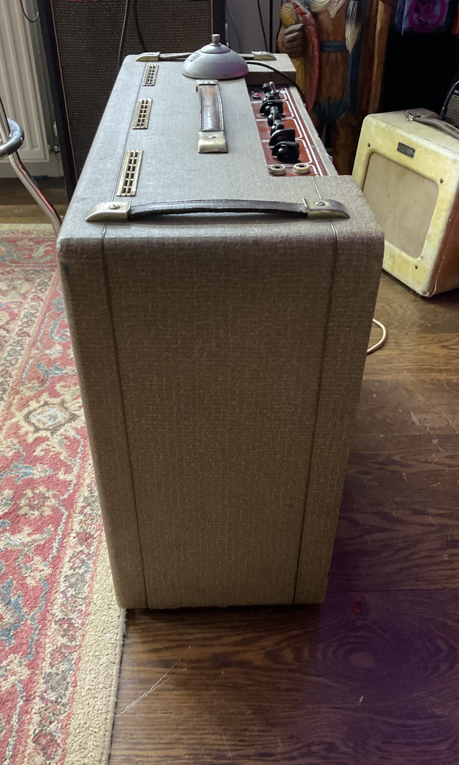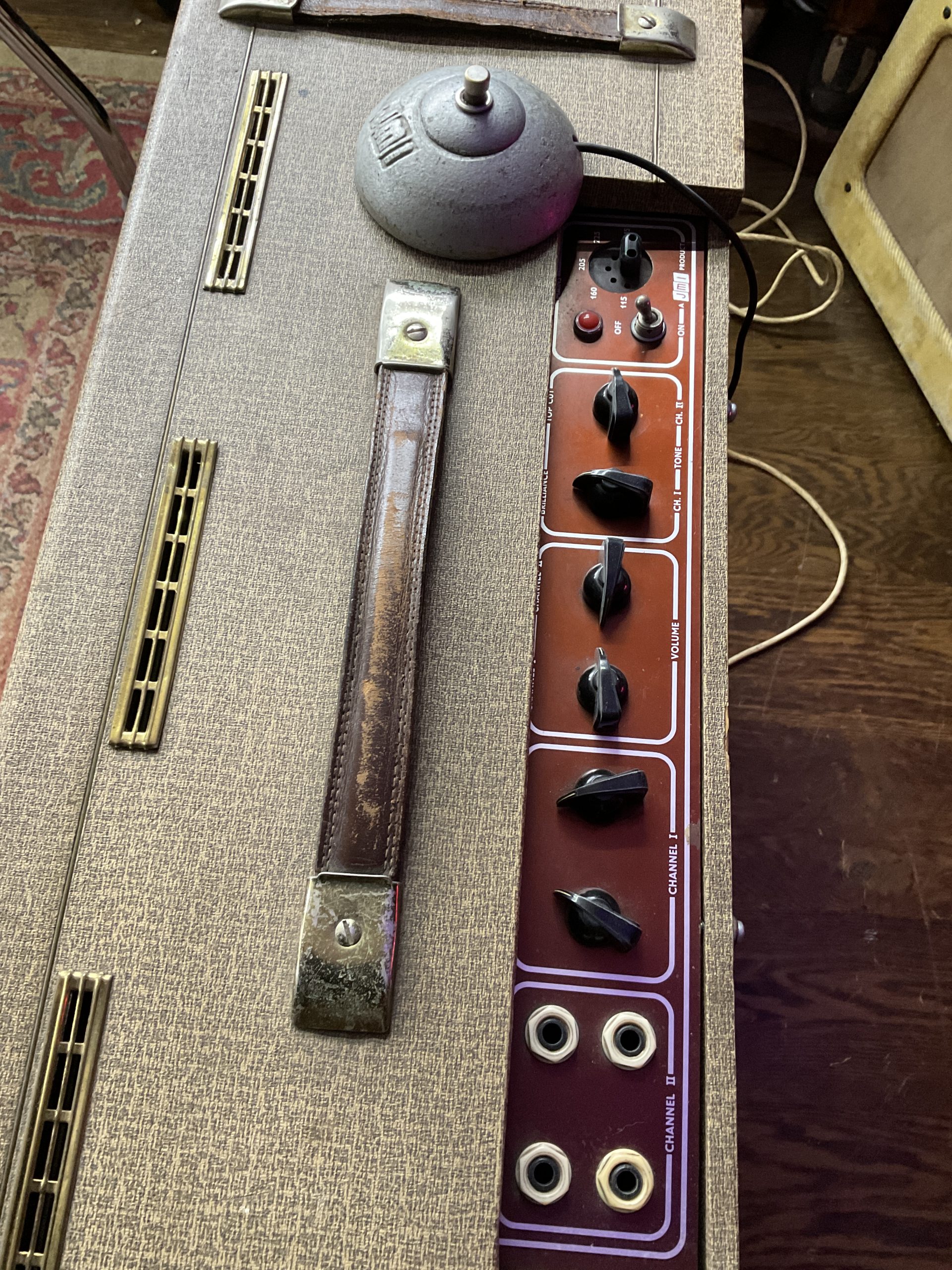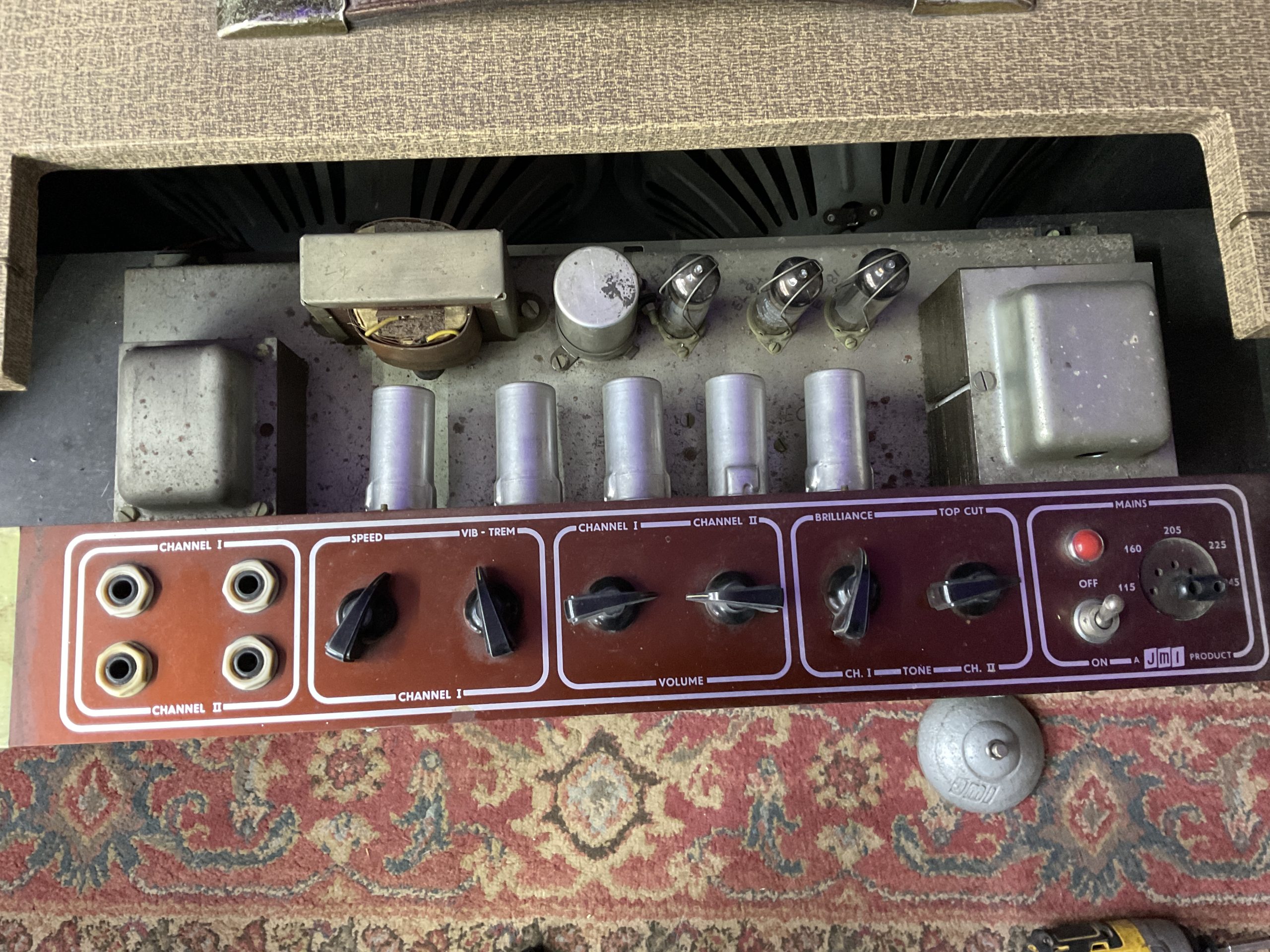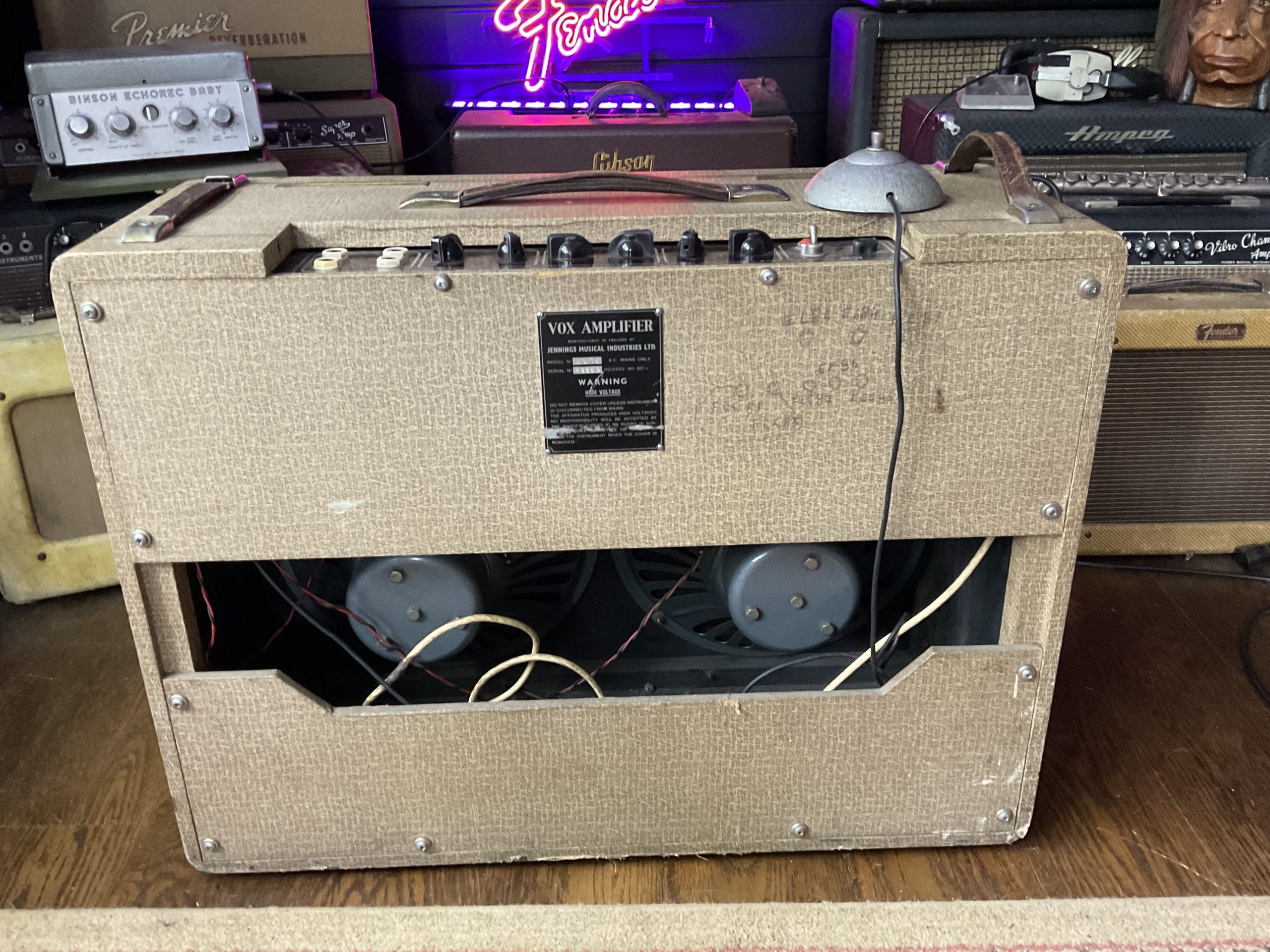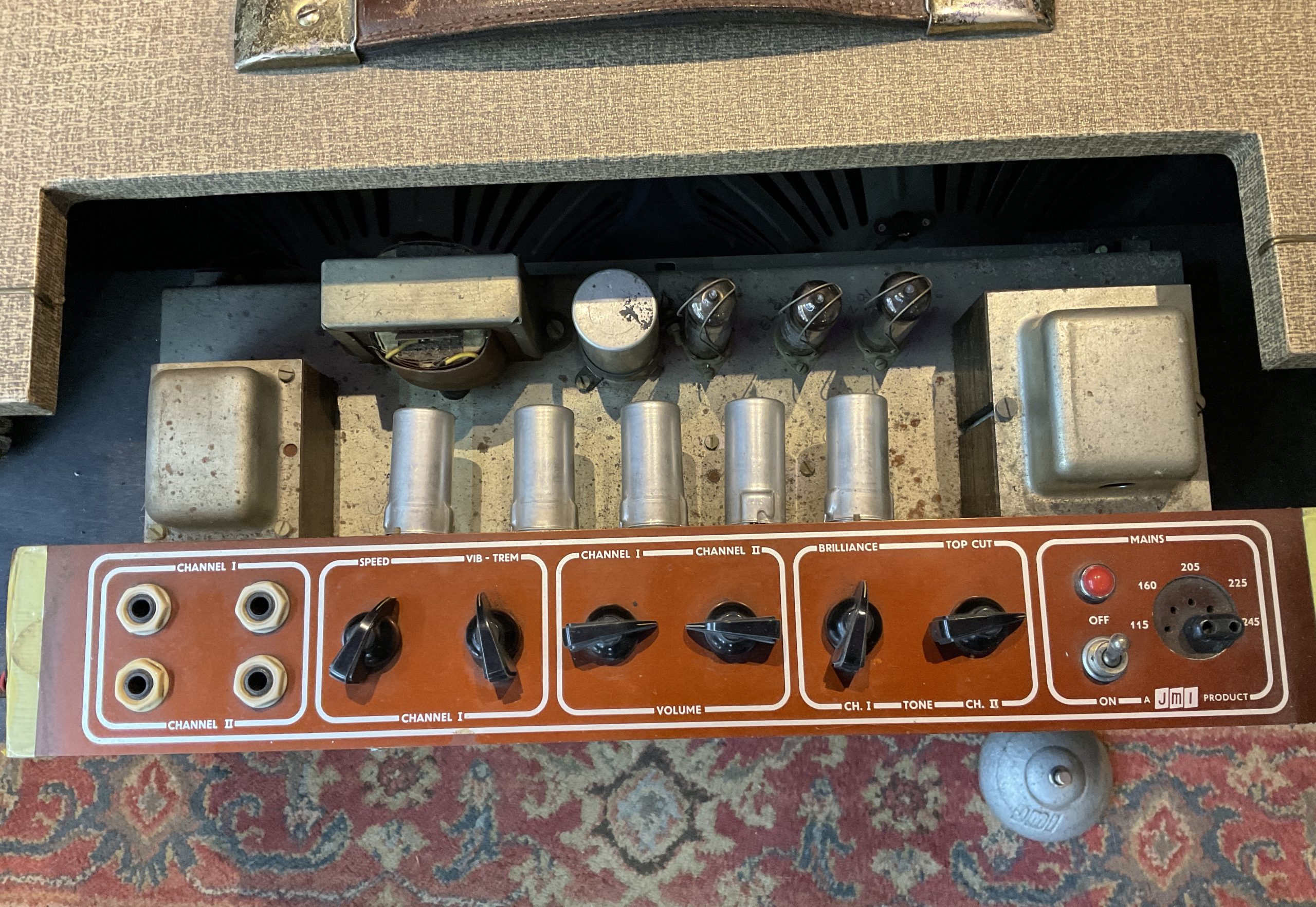Here we have a fine example of the legendary and rare fawn Vox AC 15 Twin as famously used by John Lennon in the early Cavern/Hamburg days and used to record The Beatles first album “Please Please Me” Its an incredible find and looks to be virtually untouched including the original fan framed Goodmans speakers also found in the Lennon amp. Its thought only 30 of these AC15’s were built in this format and we found this one resting in the north of England so likely from the same music shop Hessy’s of Liverpool as the Lennon twin. Condition wise it can only be described as excellent with just aged related patina. All the leather handles survive along with the brass vents, plus the original foot switch is present. The circuit looks to be untouched and in my view considering how fabulous this amplifier sounds doesn’t need to be, its only original once! The original Mullard power and rectifier valves with the rest being a mixture of replacements, i guess original Mullards could be sourced if it bothered but as it sounds so good we’ll leave that to the next owner. There is some pencil valve code markings on the back cover which i’m sure can be removed if a bother. The fawn rexine is in great shape along with the speaker cloth which shows some small wear to the bottom edge.