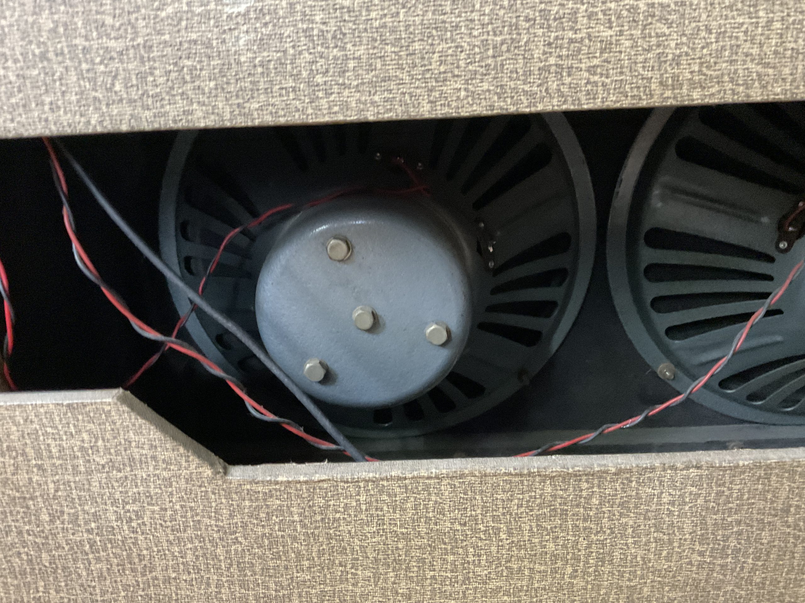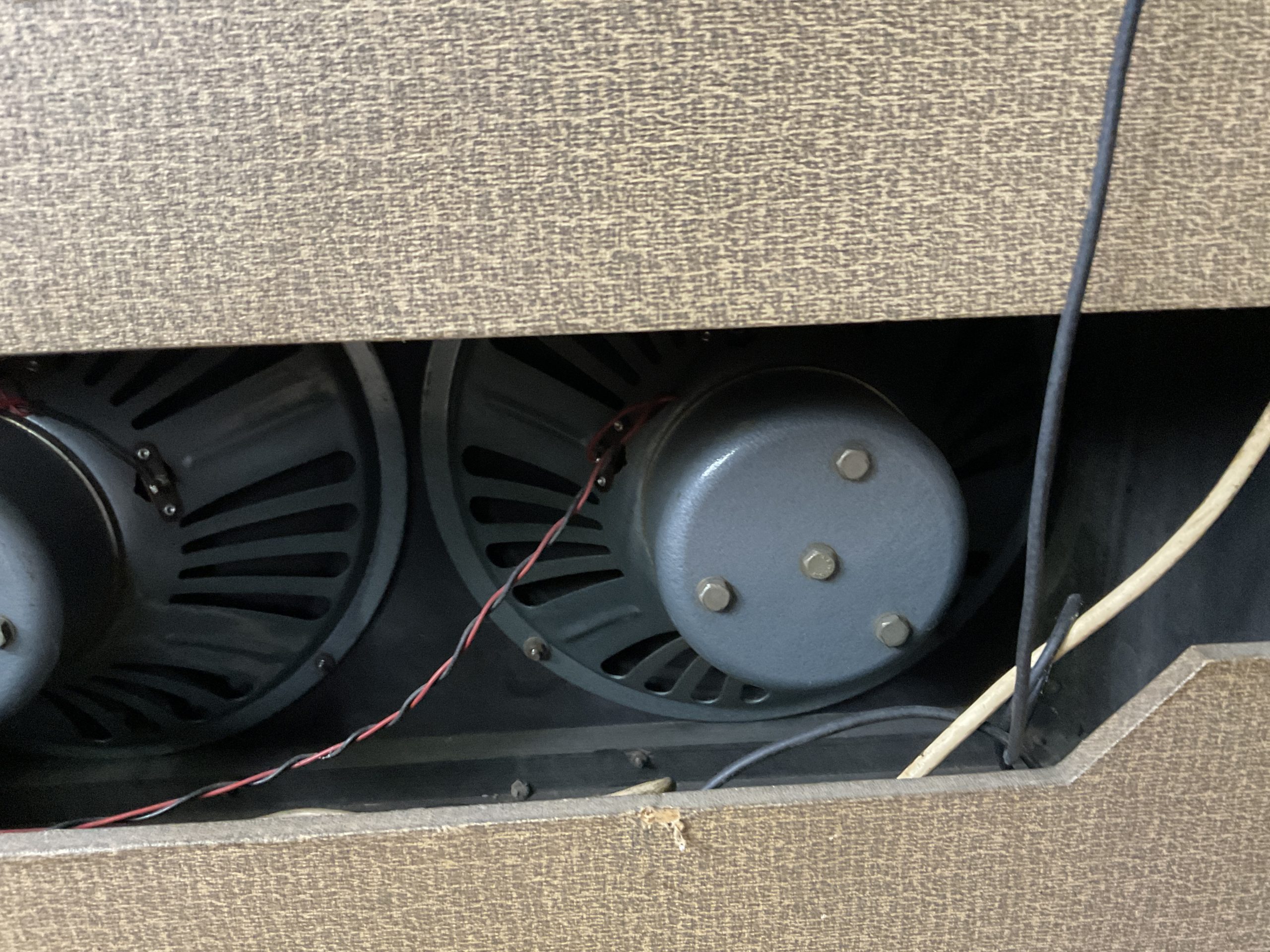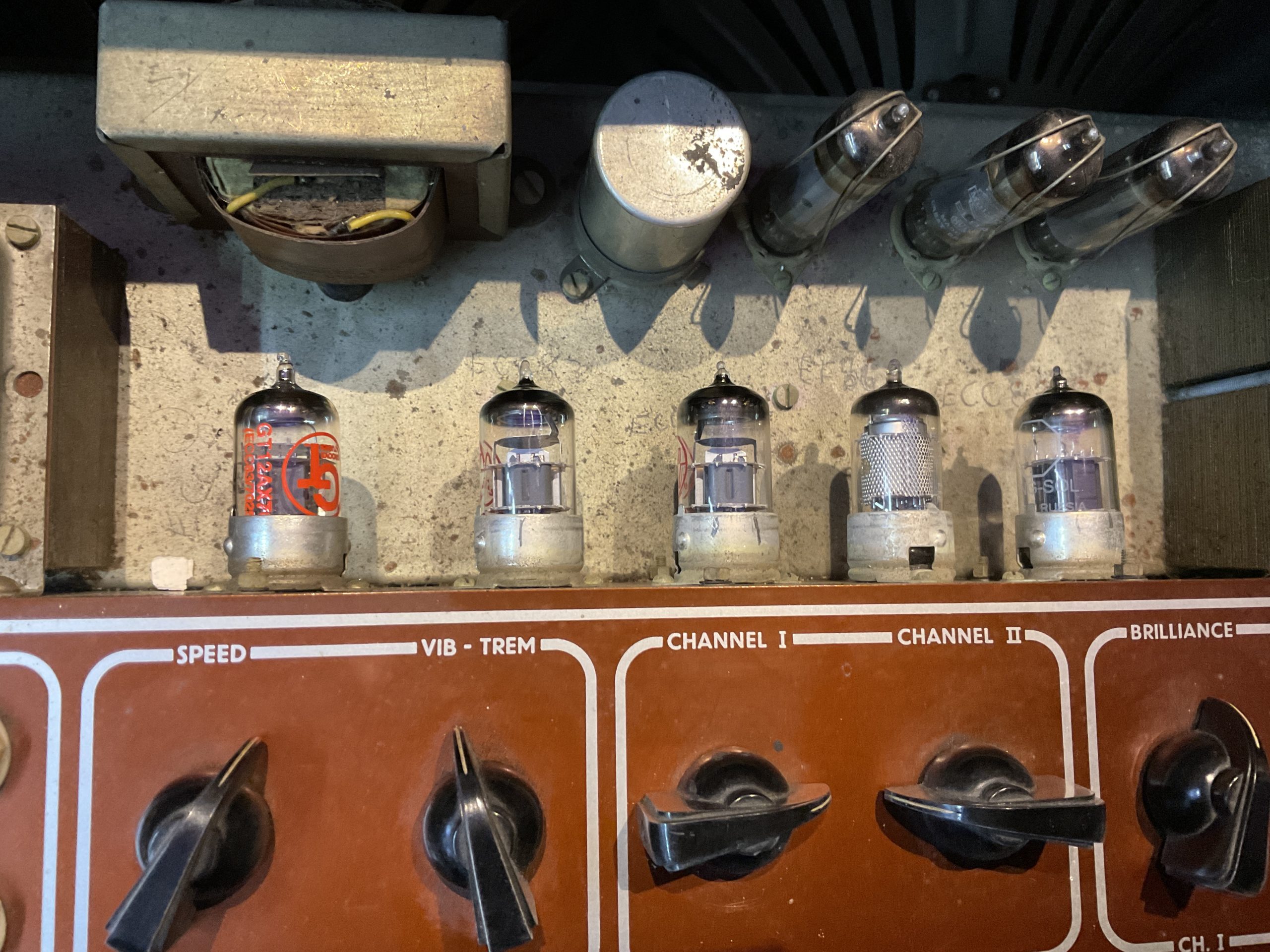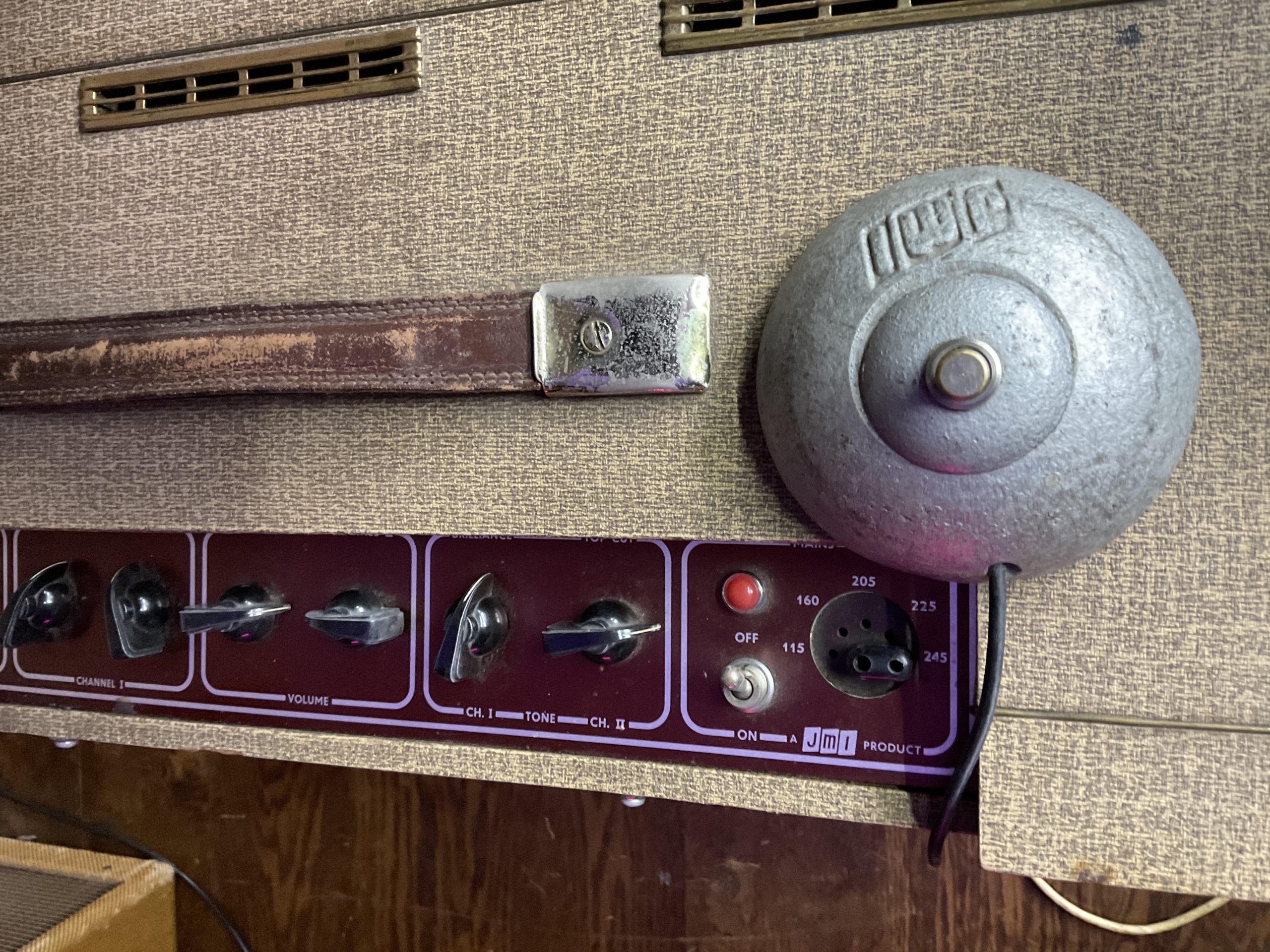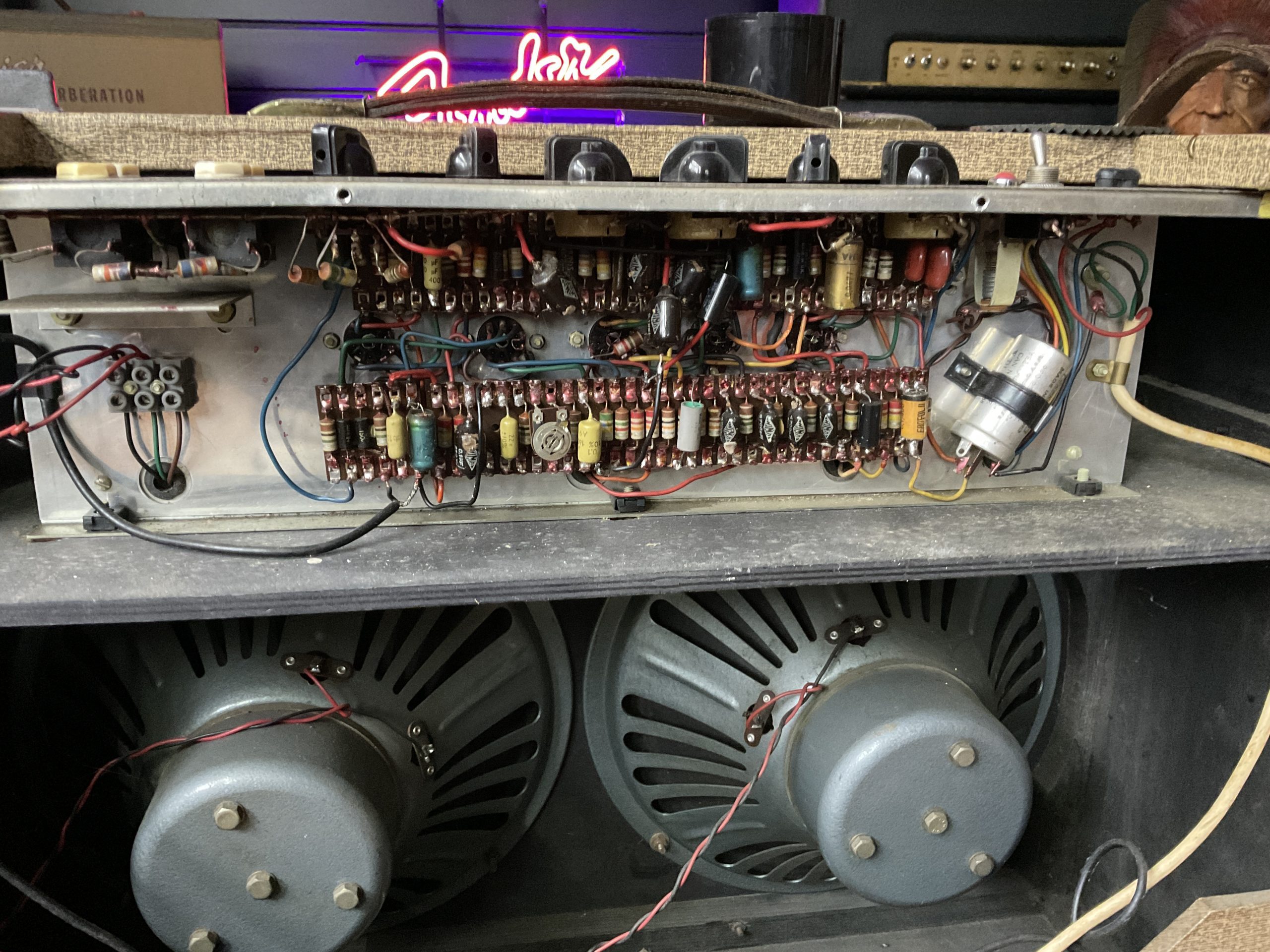 Here we have a fine example of the legendary and rare fawn Vox AC 15 Twin as famously used by John Lennon in the early Cavern/Hamburg days and used to record The Beatles first album “Please Please Me” Its an incredible find and looks to be virtually untouched including the original fan framed Goodmans speakers also found in the Lennon amp. Its thought only 30 of these AC15’s were built in this format and we found this one resting in the north of England so likely from the same music shop Hessy’s of Liverpool as the Lennon twin. Condition wise it can only be described as excellent with just aged related patina. All the leather handles survive along with the brass vents, plus the original foot switch is present. The circuit looks to be untouched and in my view considering how fabulous this amplifier sounds doesn’t need to be, its only original once! The original Mullard power and rectifier valves with the rest being a mixture of replacements, i guess original Mullards could be sourced if it bothered but as it sounds so good we’ll leave that to the next owner. There is some pencil valve code markings on the back cover which i’m sure can be removed if a bother. The fawn rexine is in great shape along with the speaker cloth which shows some small wear to the bottom edge.