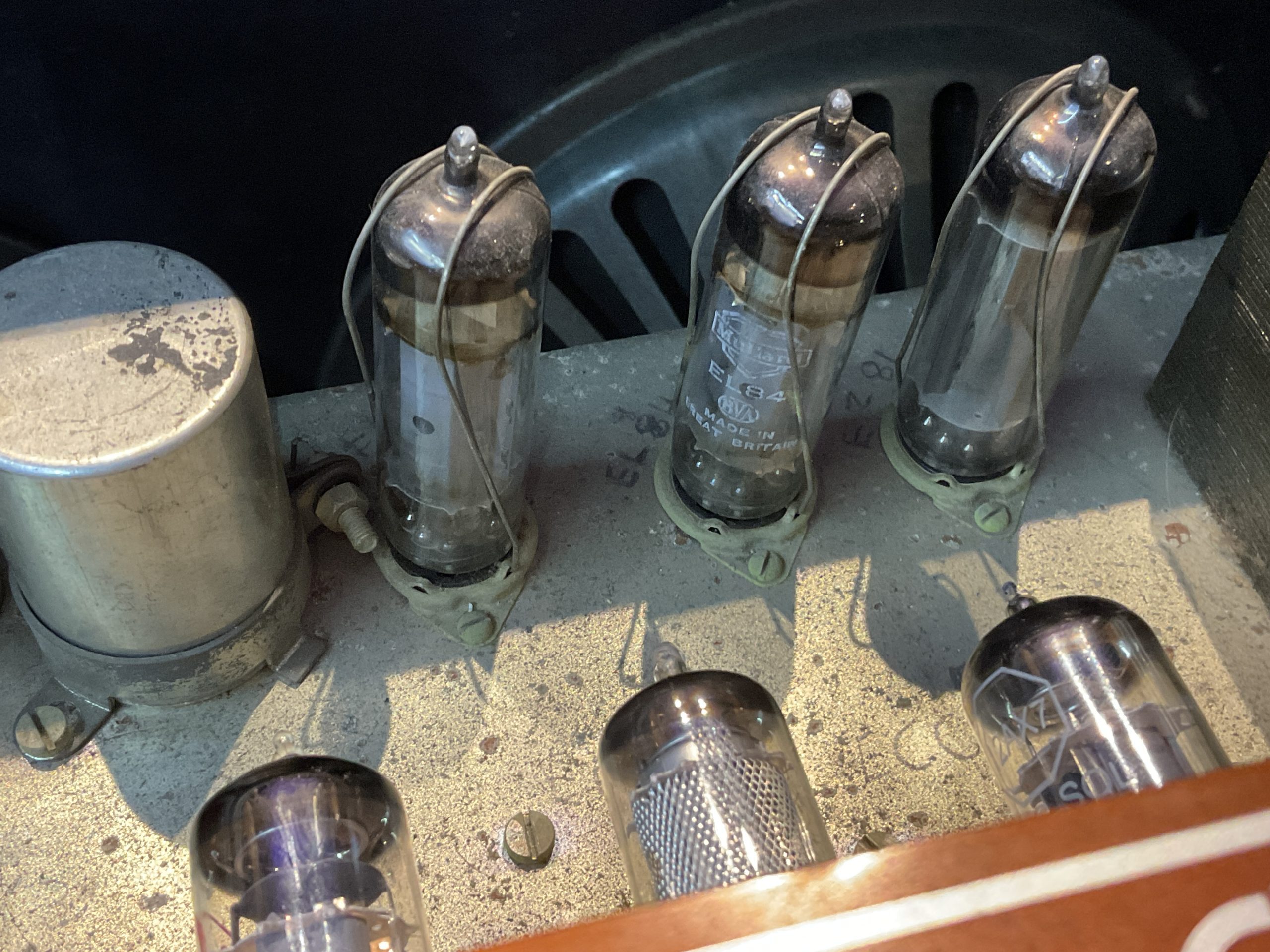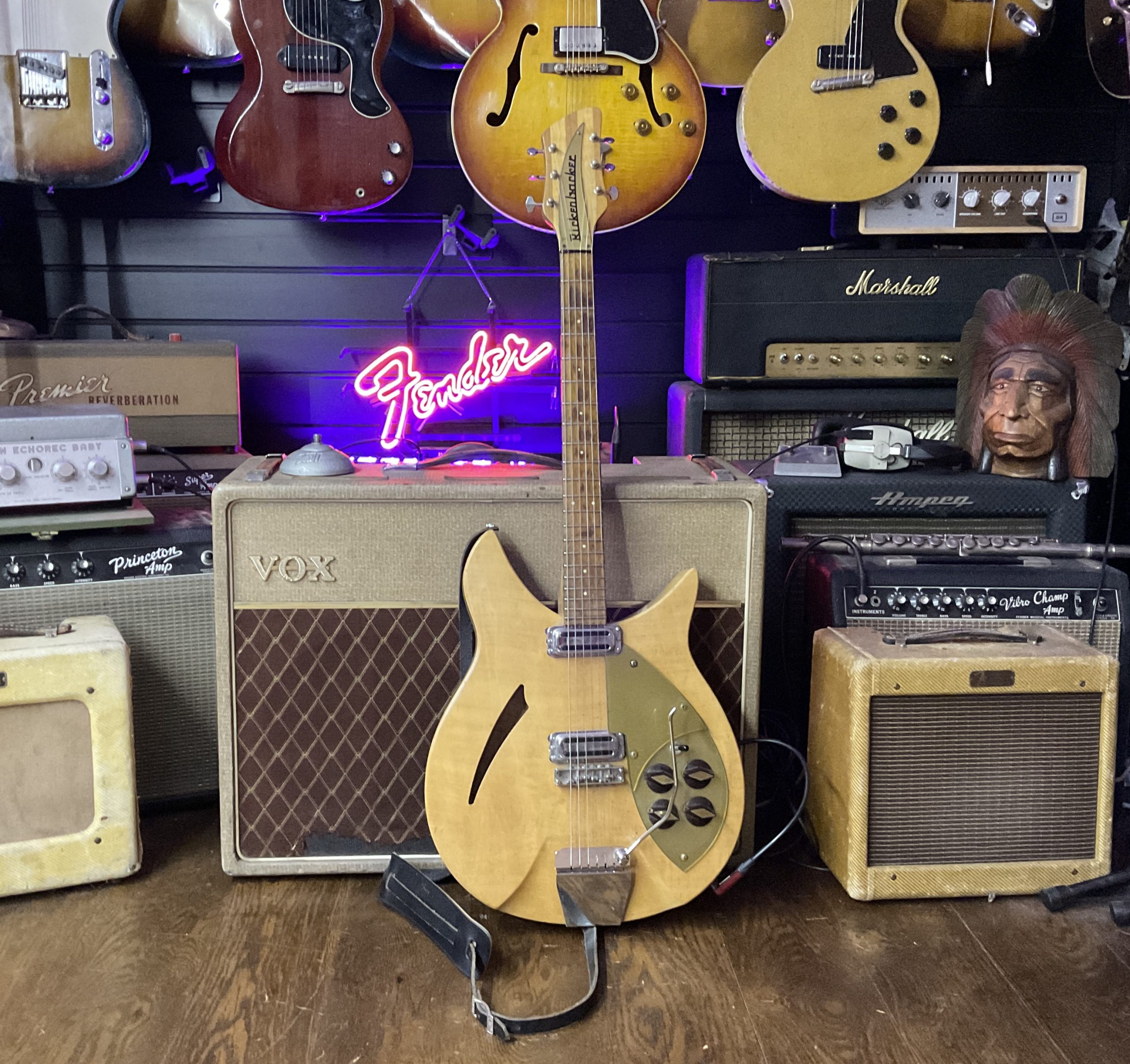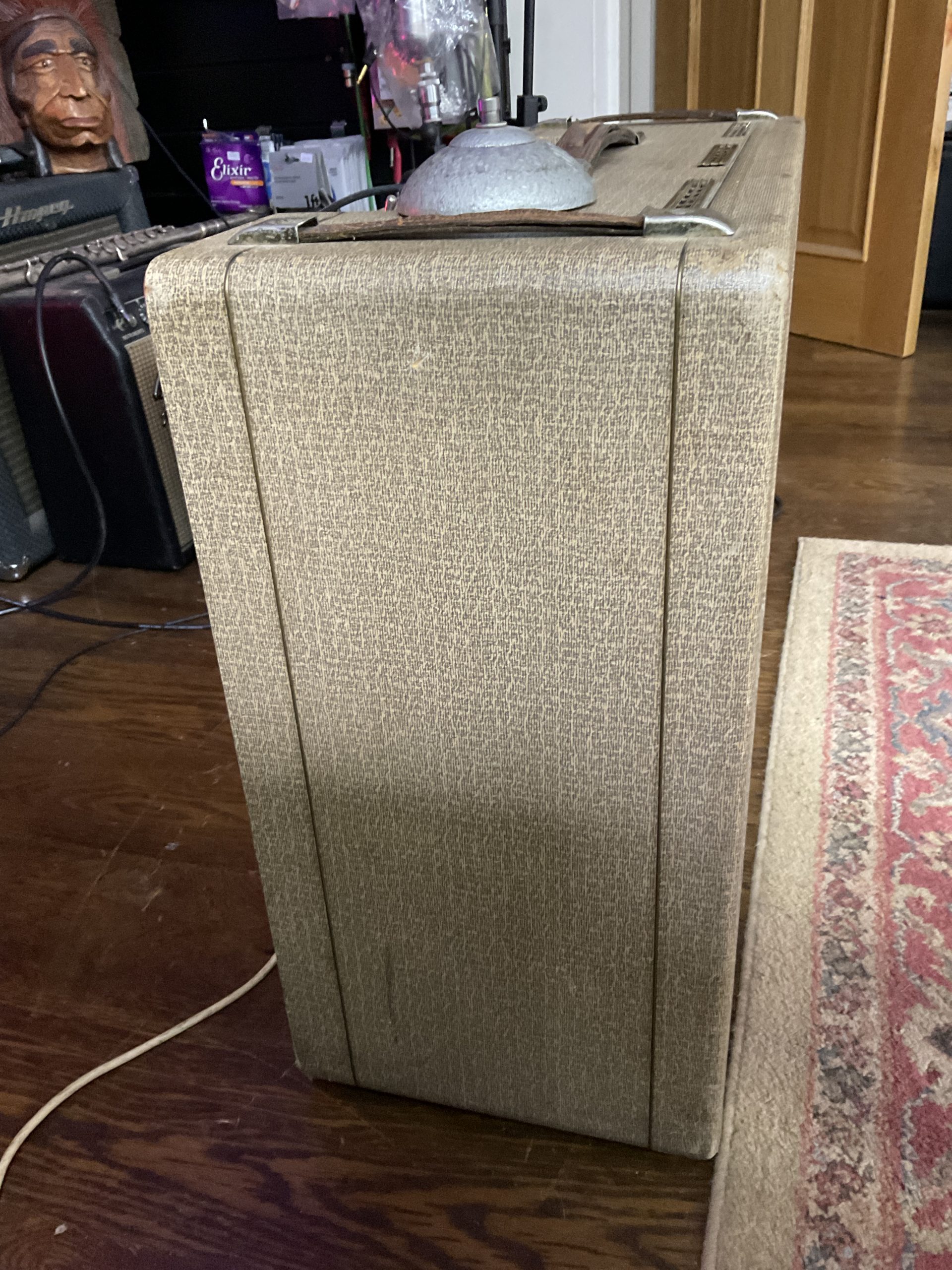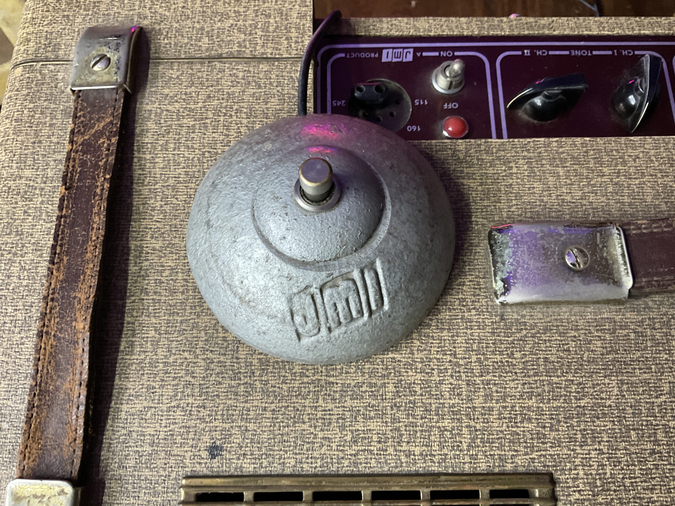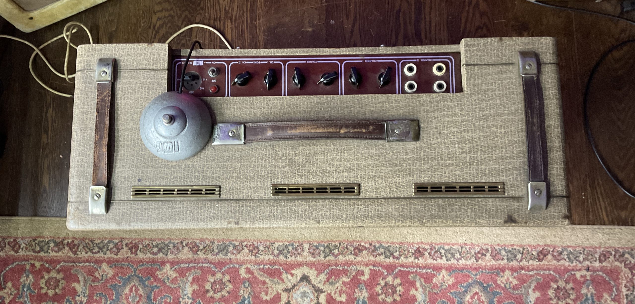 Here we have a fine example of the legendary and rare fawn Vox AC 15 Twin as famously used by John Lennon in the early Cavern/Hamburg days and used to record The Beatles first album “Please Please Me” Its an incredible find and looks to be virtually untouched including the original fan framed Goodmans speakers also found in the Lennon amp. Its thought only 30 of these AC15’s were built in this format and we found this one resting in the north of England so likely from the same music shop Hessy’s of Liverpool as the Lennon twin. Condition wise it can only be described as excellent with just aged related patina. All the leather handles survive along with the brass vents, plus the original foot switch is present. The circuit looks to be untouched and in my view considering how fabulous this amplifier sounds doesn’t need to be, its only original once! The original Mullard power and rectifier valves with the rest being a mixture of replacements, i guess original Mullards could be sourced if it bothered but as it sounds so good we’ll leave that to the next owner. There is some pencil valve code markings on the back cover which i’m sure can be removed if a bother. The fawn rexine is in great shape along with the speaker cloth which shows some small wear to the bottom edge.