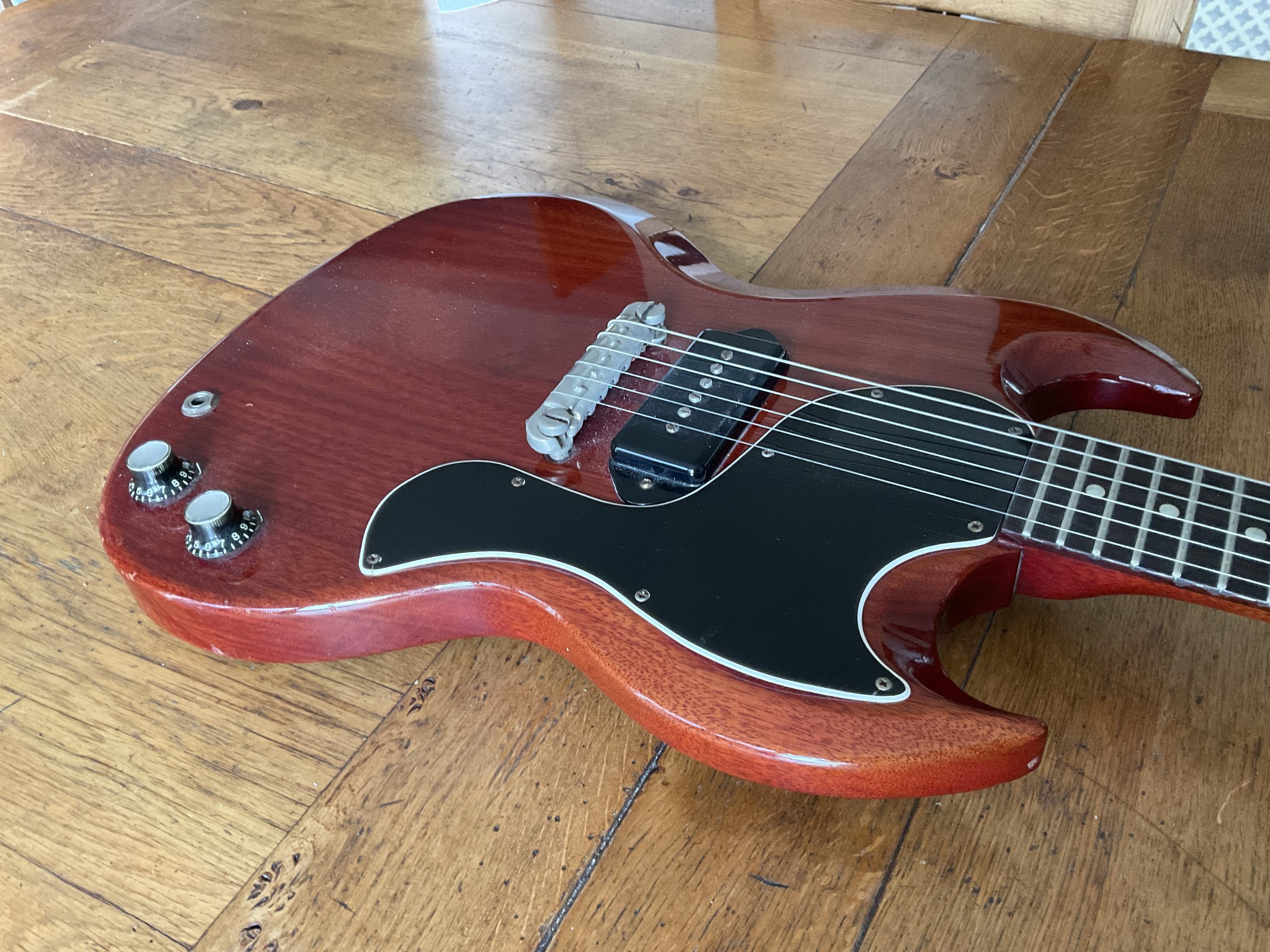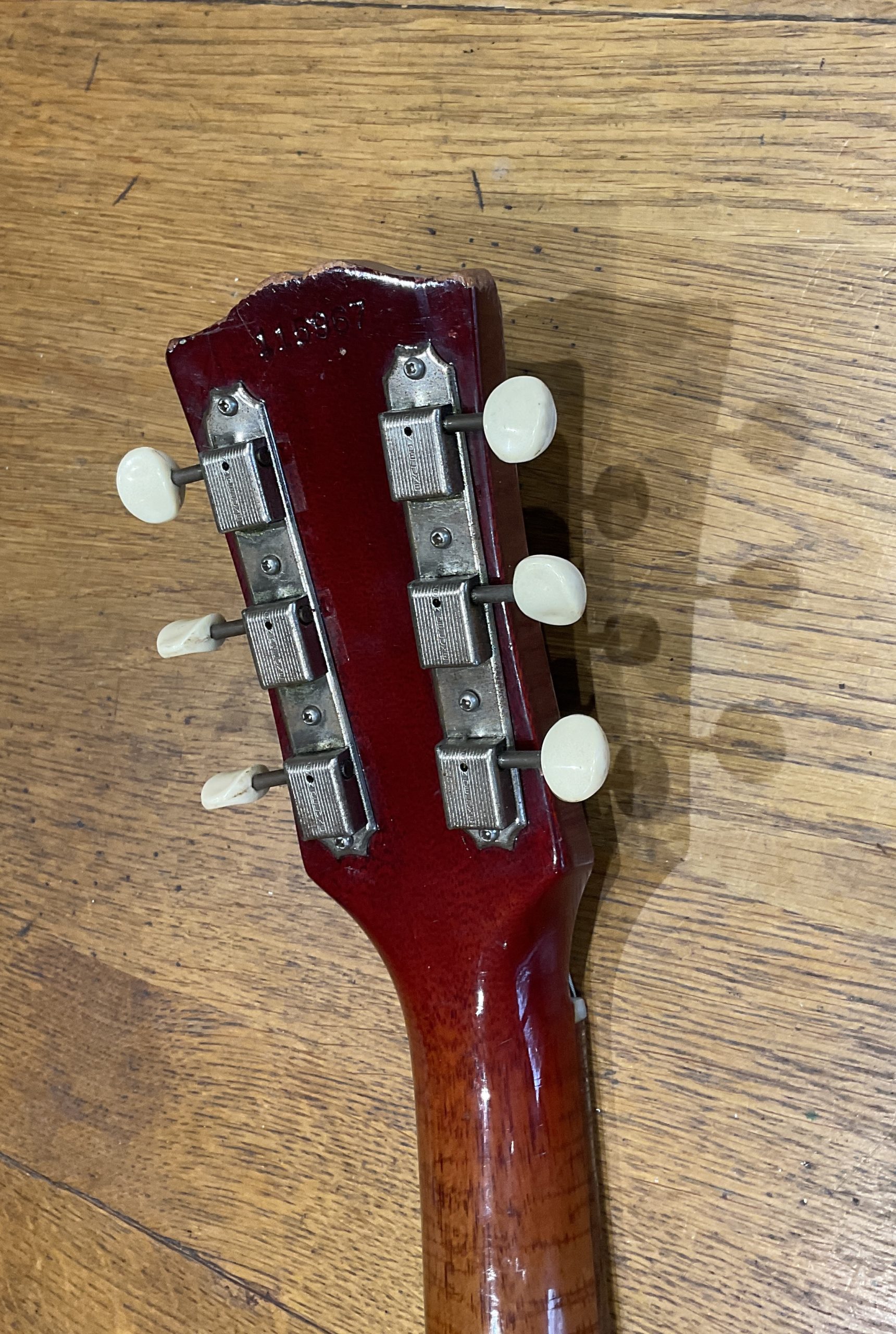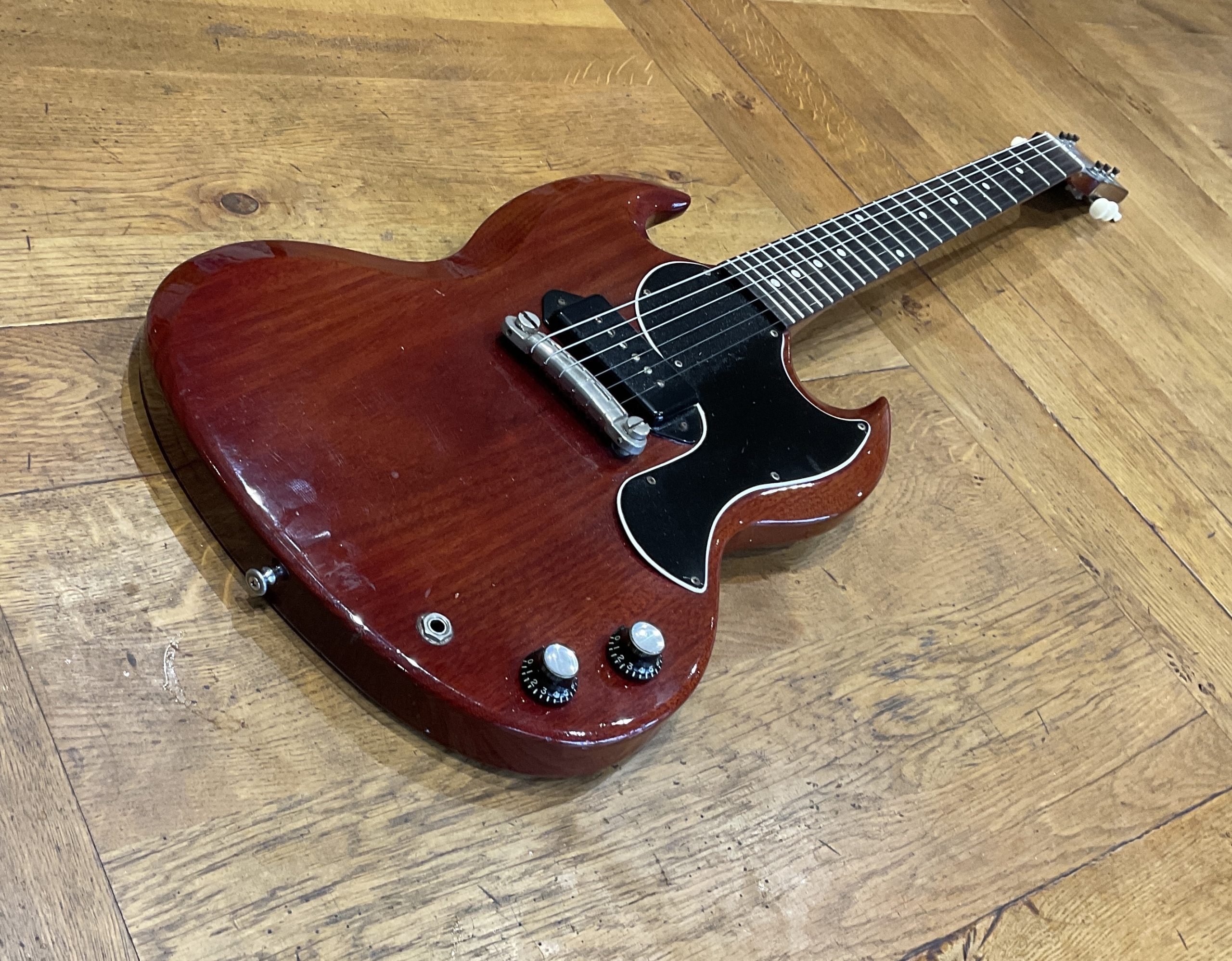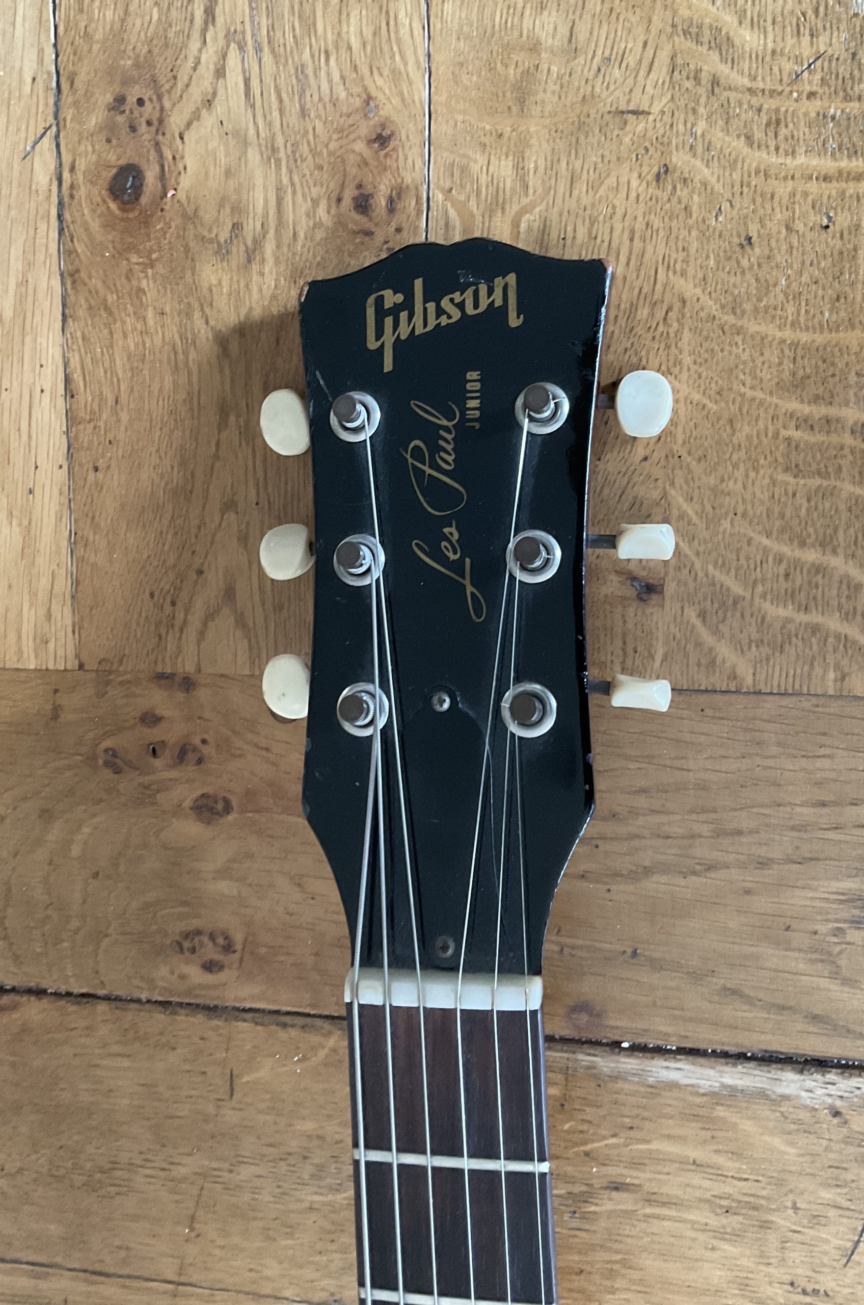 Sometimes simple is best and thats certainly the case here with this fine specimen of a Les Paul Junior, it must be one of the last examples to still carry the “Les Paul” silk screen logo before Paul ended his endorsement of the Les Paul series of guitars. It weighs in at 6 lbs 8 oz and has that awesome full neck profile that we all love from the 63 64 period. There are no breaks or repairs and the finish still has its deep cherry finish with the exception of the the rear of the neck which is more golden through play wear. The frets are unmarked and the neck straight as an arrow and plays extremely well as a result. The single P90 pickup reads 6.1 k Ohms on my meter and all solder joints are untouched. Its a fabulous instrument to play with a lively resonant response that never gets old. Comes in a 1990s Gibson SG case