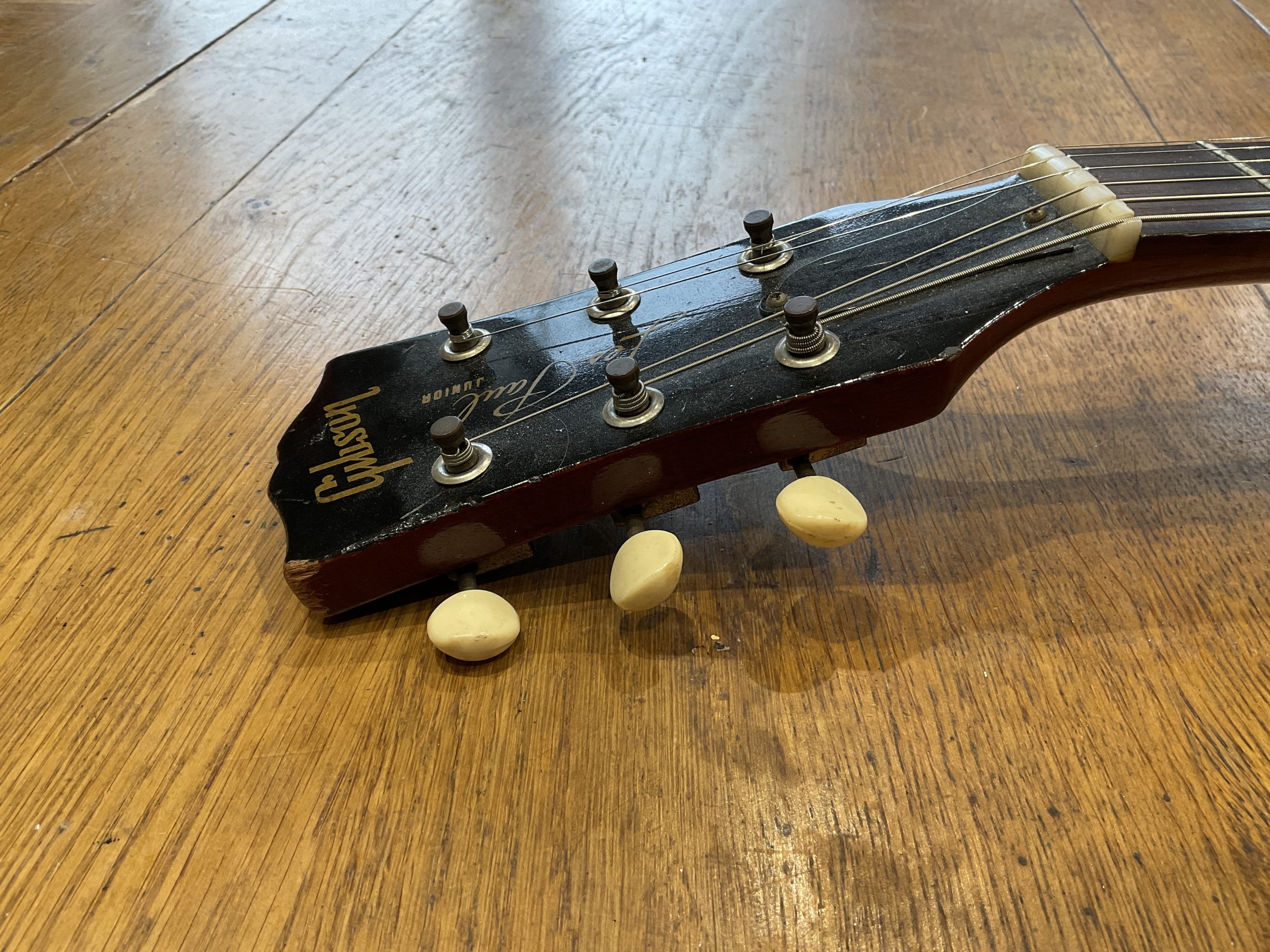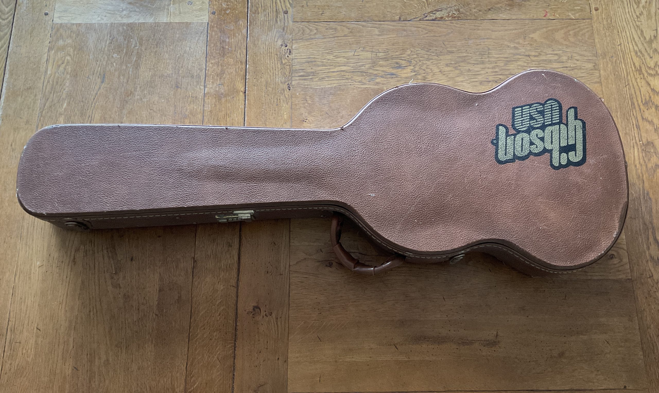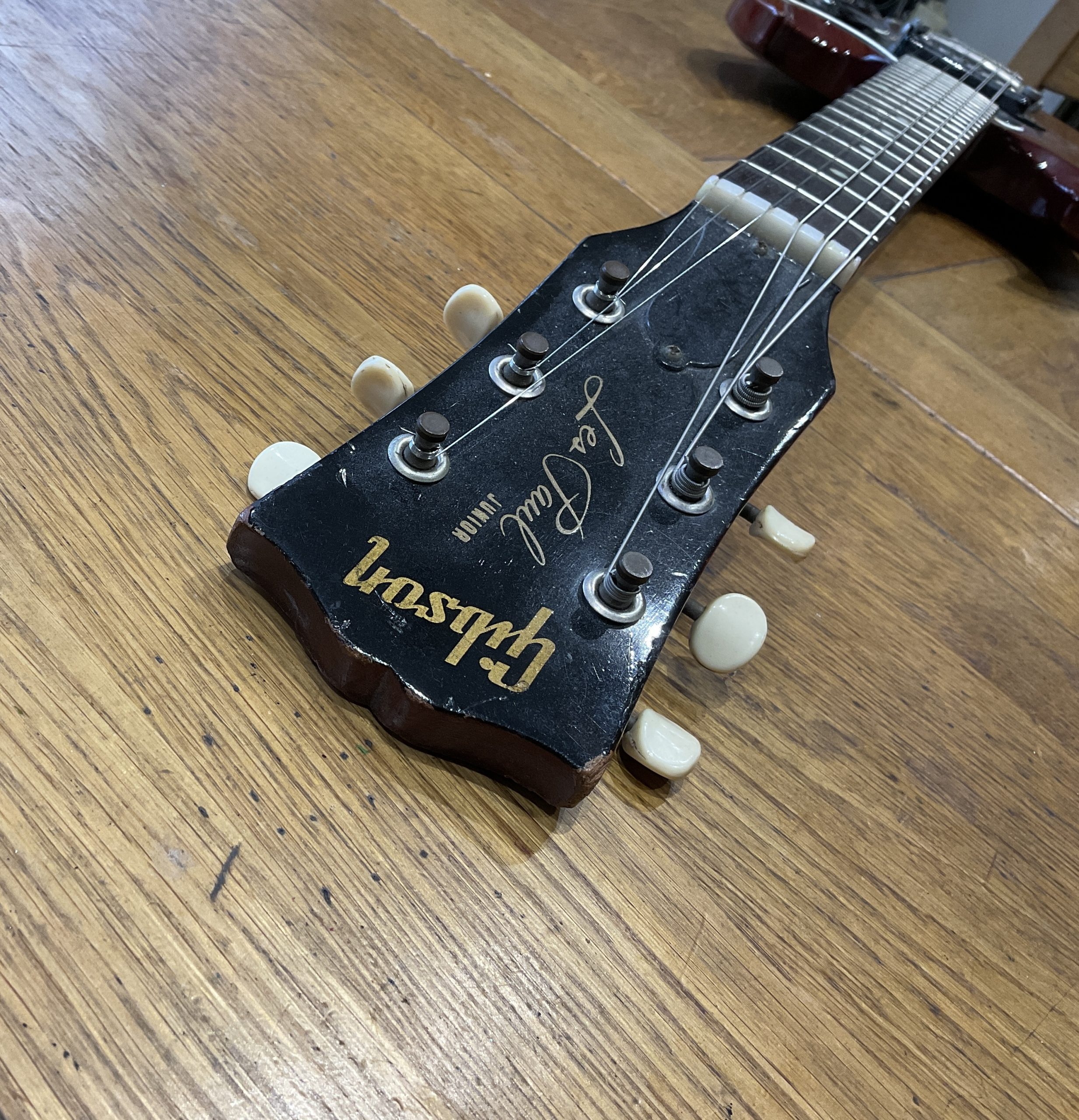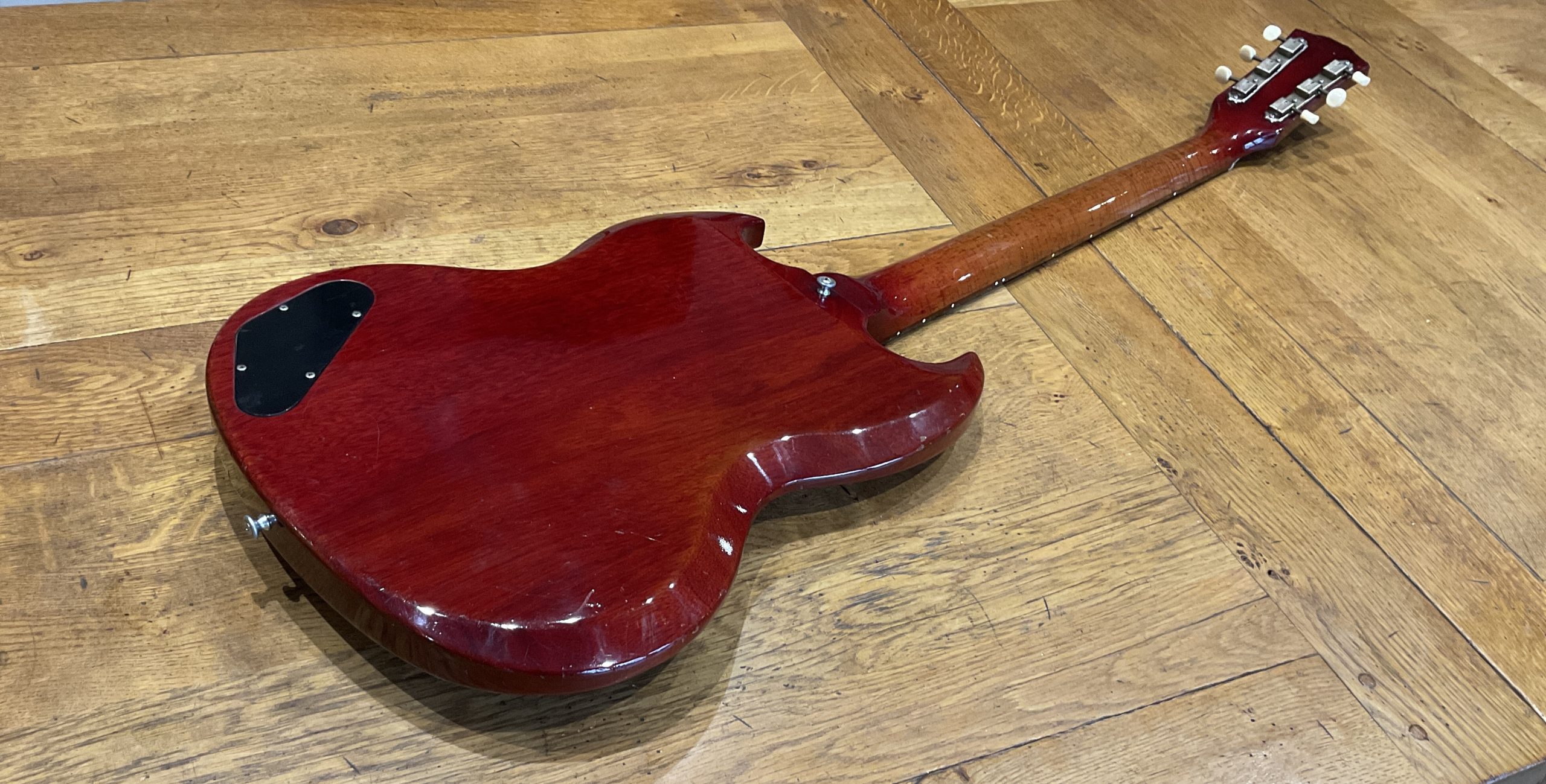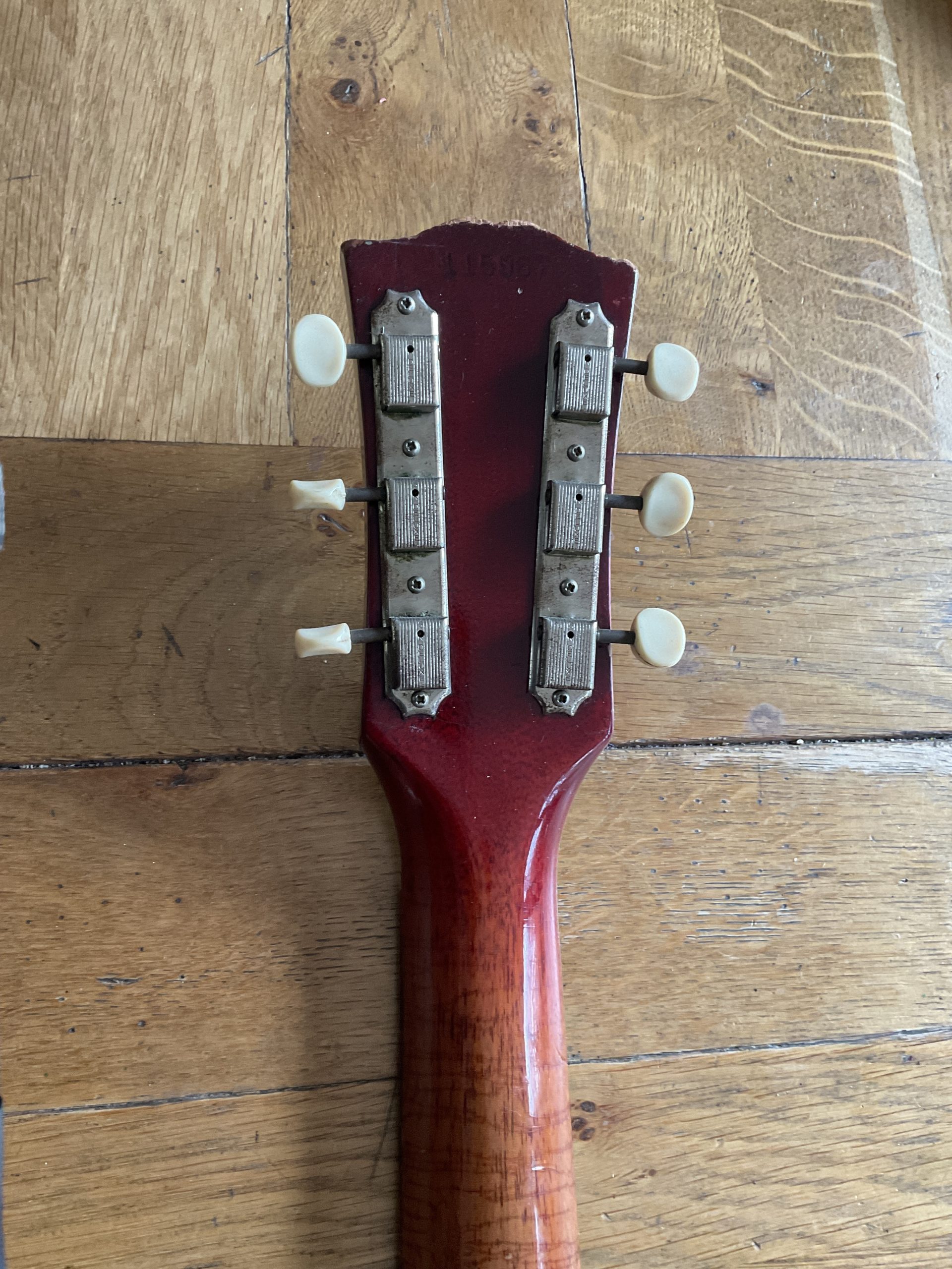 Sometimes simple is best and thats certainly the case here with this fine specimen of a Les Paul Junior, it must be one of the last examples to still carry the “Les Paul” silk screen logo before Paul ended his endorsement of the Les Paul series of guitars. It weighs in at 6 lbs 8 oz and has that awesome full neck profile that we all love from the 63 64 period. There are no breaks or repairs and the finish still has its deep cherry finish with the exception of the the rear of the neck which is more golden through play wear. The frets are unmarked and the neck straight as an arrow and plays extremely well as a result. The single P90 pickup reads 6.1 k Ohms on my meter and all solder joints are untouched. Its a fabulous instrument to play with a lively resonant response that never gets old. Comes in a 1990s Gibson SG case