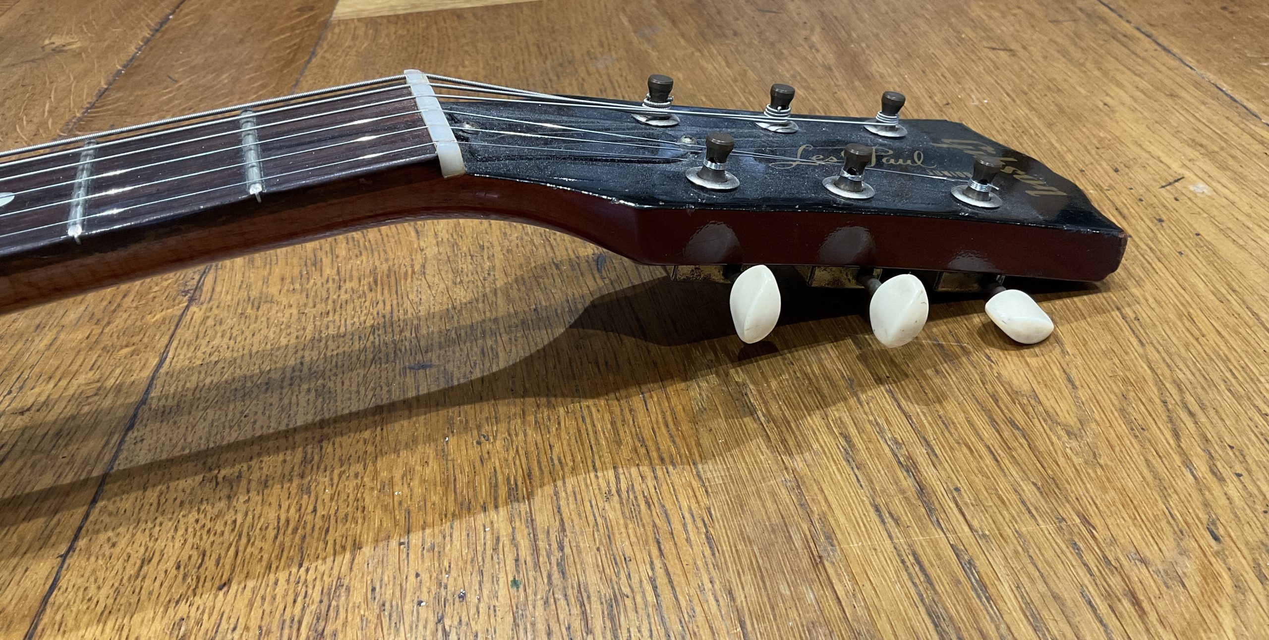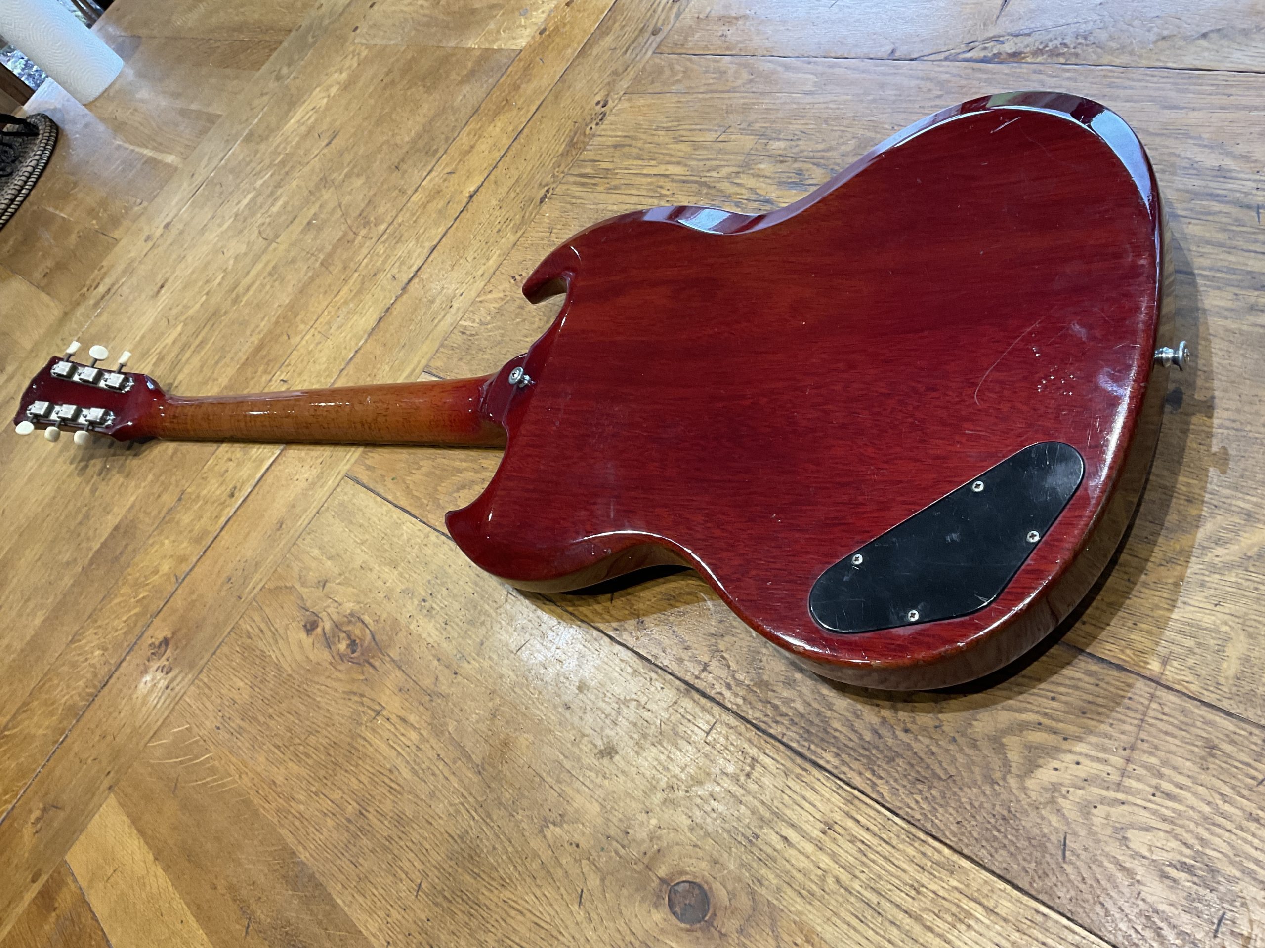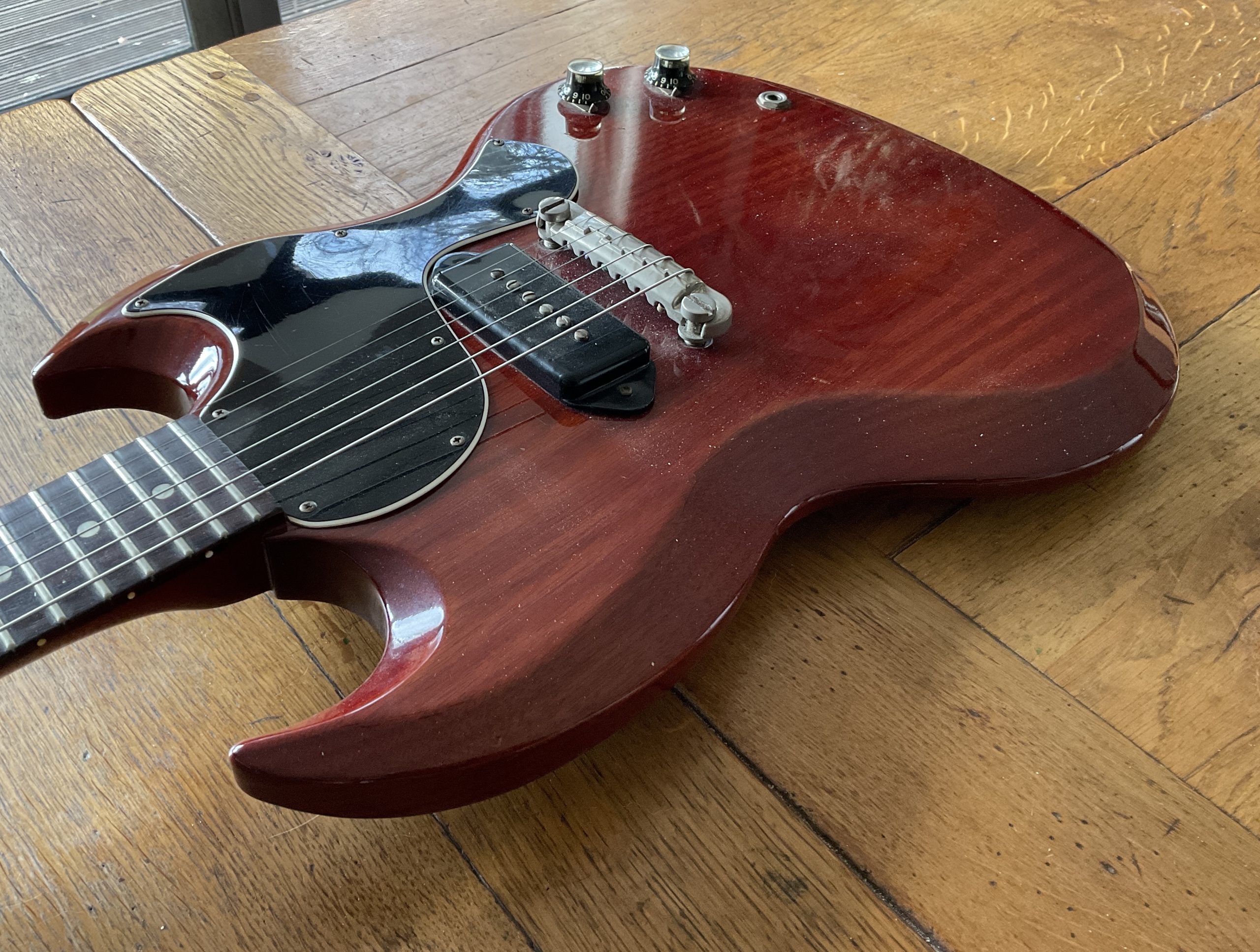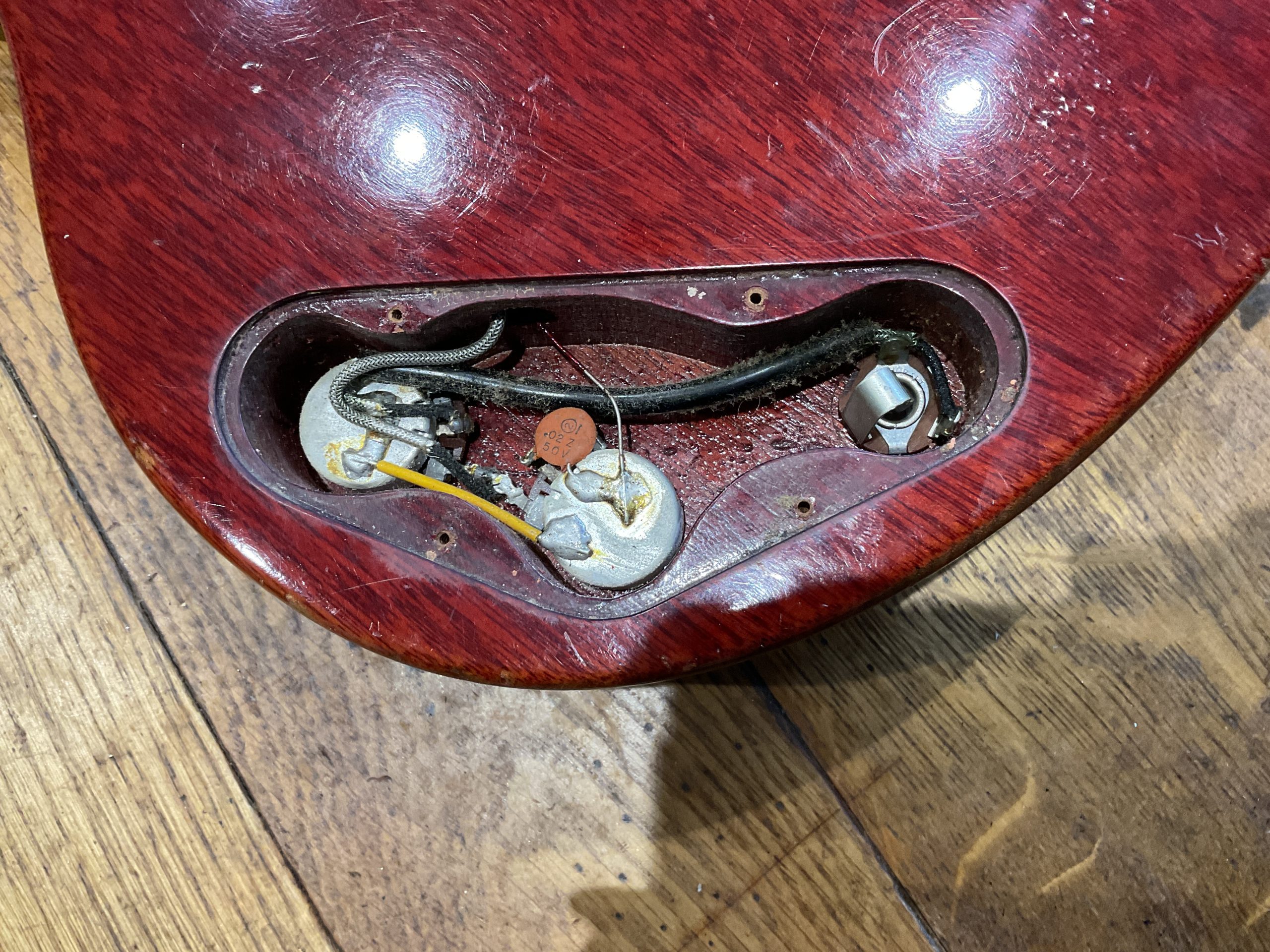 Sometimes simple is best and thats certainly the case here with this fine specimen of a Les Paul Junior, it must be one of the last examples to still carry the “Les Paul” silk screen logo before Paul ended his endorsement of the Les Paul series of guitars. It weighs in at 6 lbs 8 oz and has that awesome full neck profile that we all love from the 63 64 period. There are no breaks or repairs and the finish still has its deep cherry finish with the exception of the the rear of the neck which is more golden through play wear. The frets are unmarked and the neck straight as an arrow and plays extremely well as a result. The single P90 pickup reads 6.1 k Ohms on my meter and all solder joints are untouched. Its a fabulous instrument to play with a lively resonant response that never gets old. Comes in a 1990s Gibson SG case