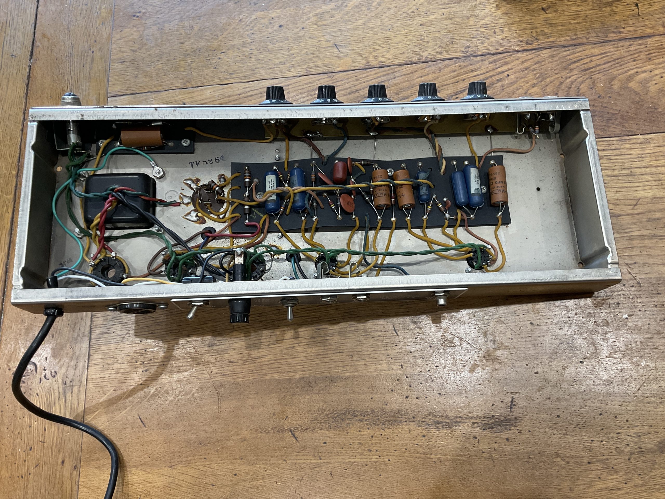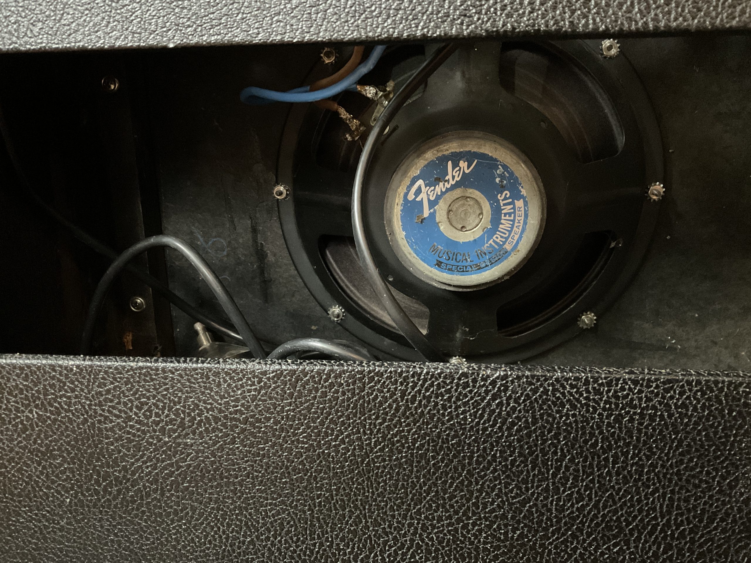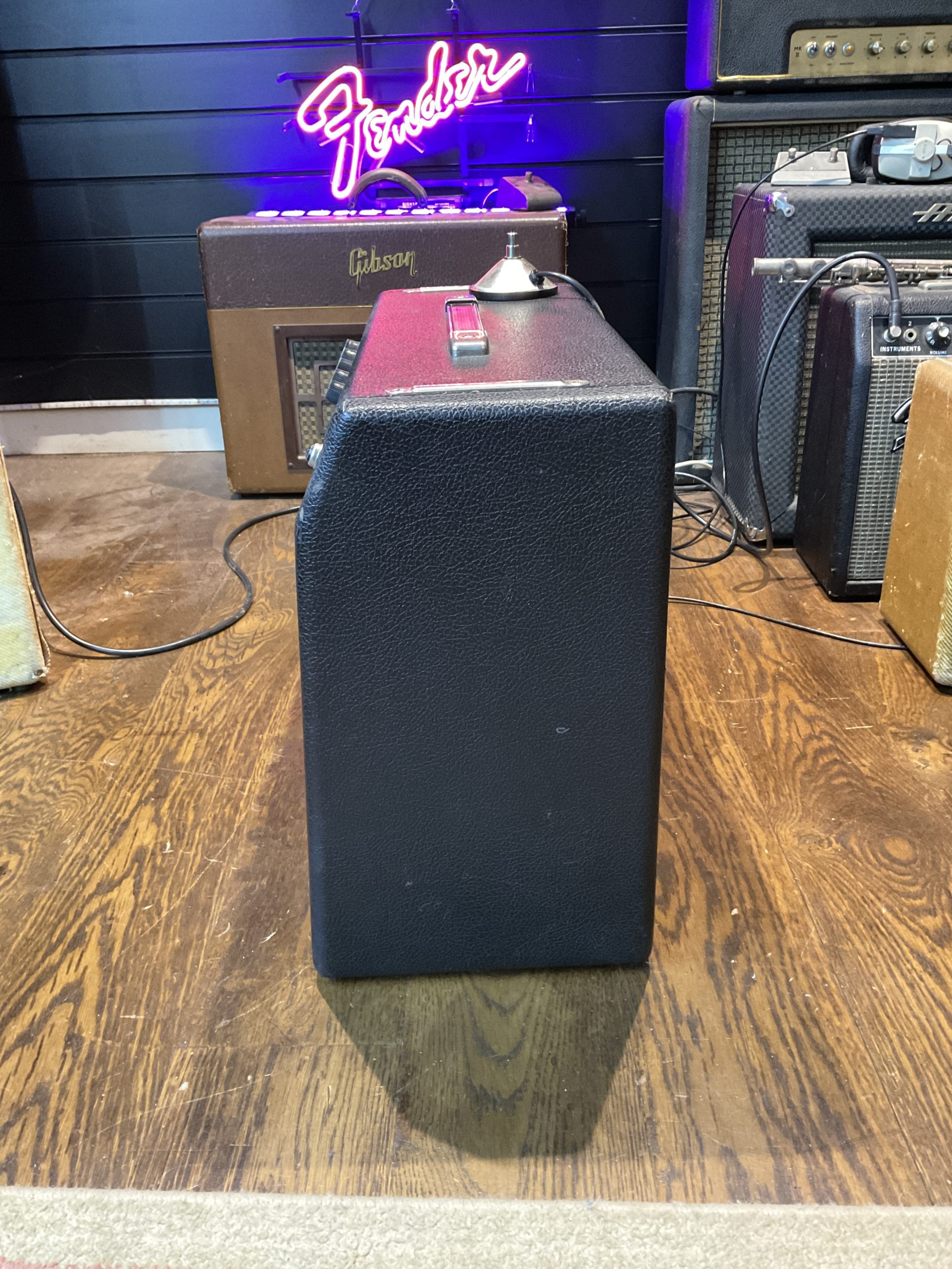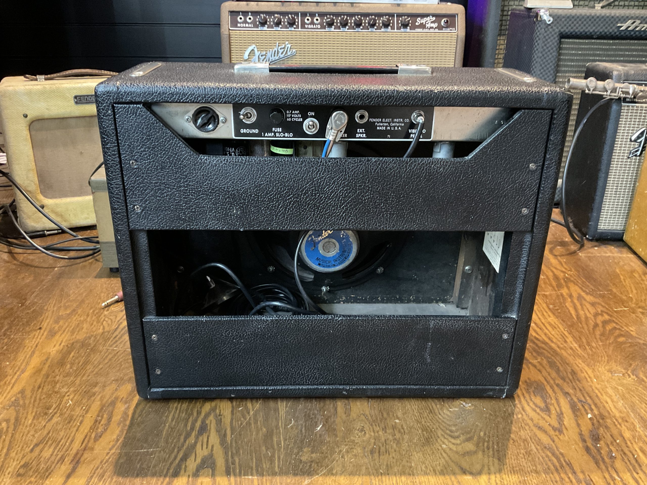 Here we have a fine example of an early black face Fender Princeton manufactured by the factory marks and pot codes to December 1964 (50th week) its year of introduction. It looks to be very original with the exception of an up to date earthed 3 prong cord and death cap isolation. Its running original spec RCA 6V6GT power valves and RCA 12 AX7’s with a Fender rectifier valve. With its original speaker, it really is a lovely sounding amplifier from Fender’s golden era. The tremolo foot switch is a genuine Fender replacement and the speaker to amp cable has been uprated. Serviced and ready to go, its a USA 110v example so will need a step down transformer