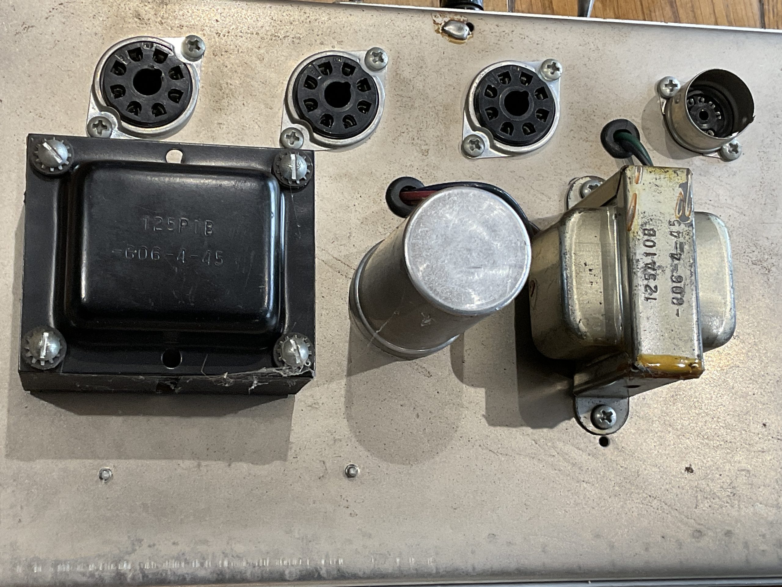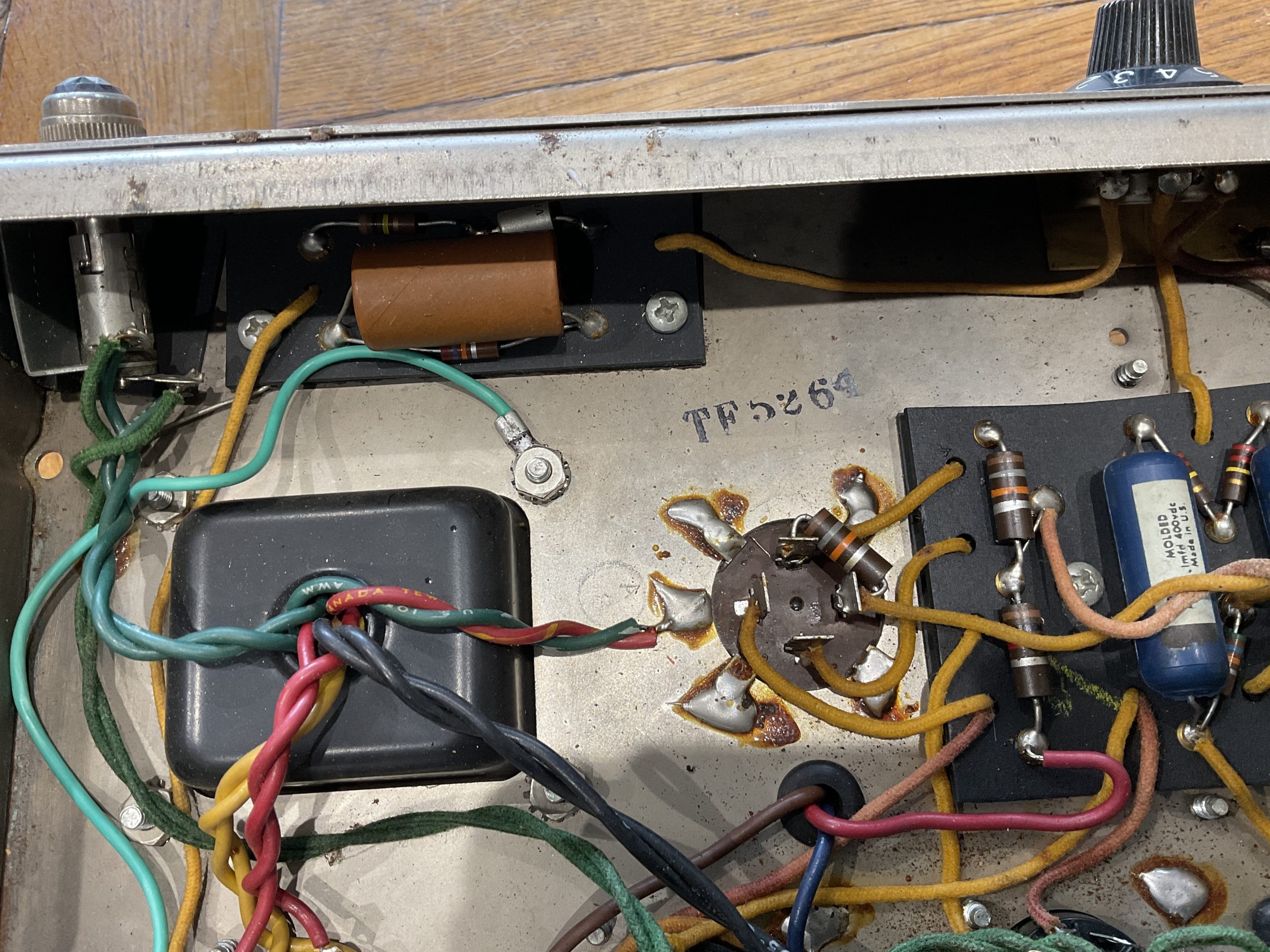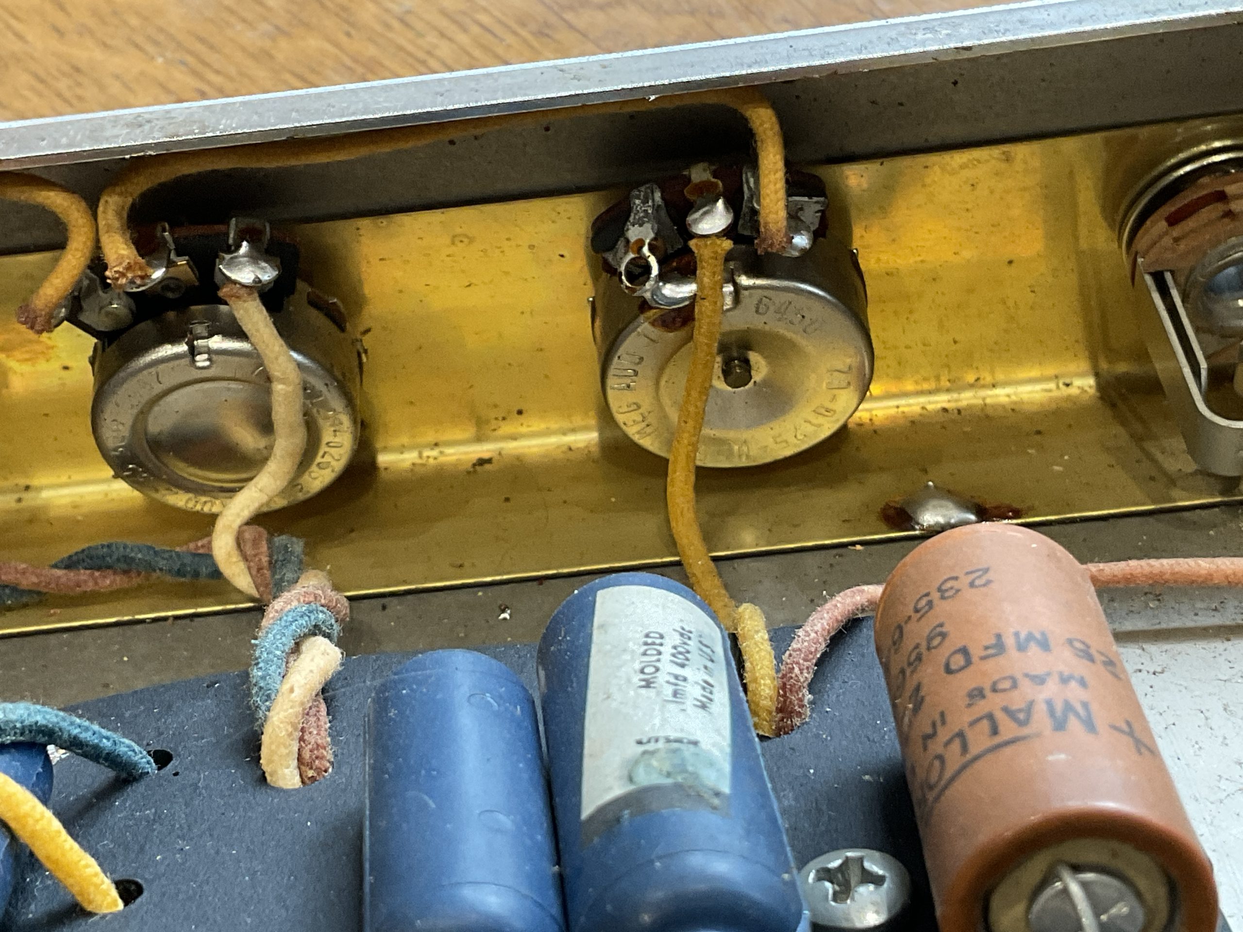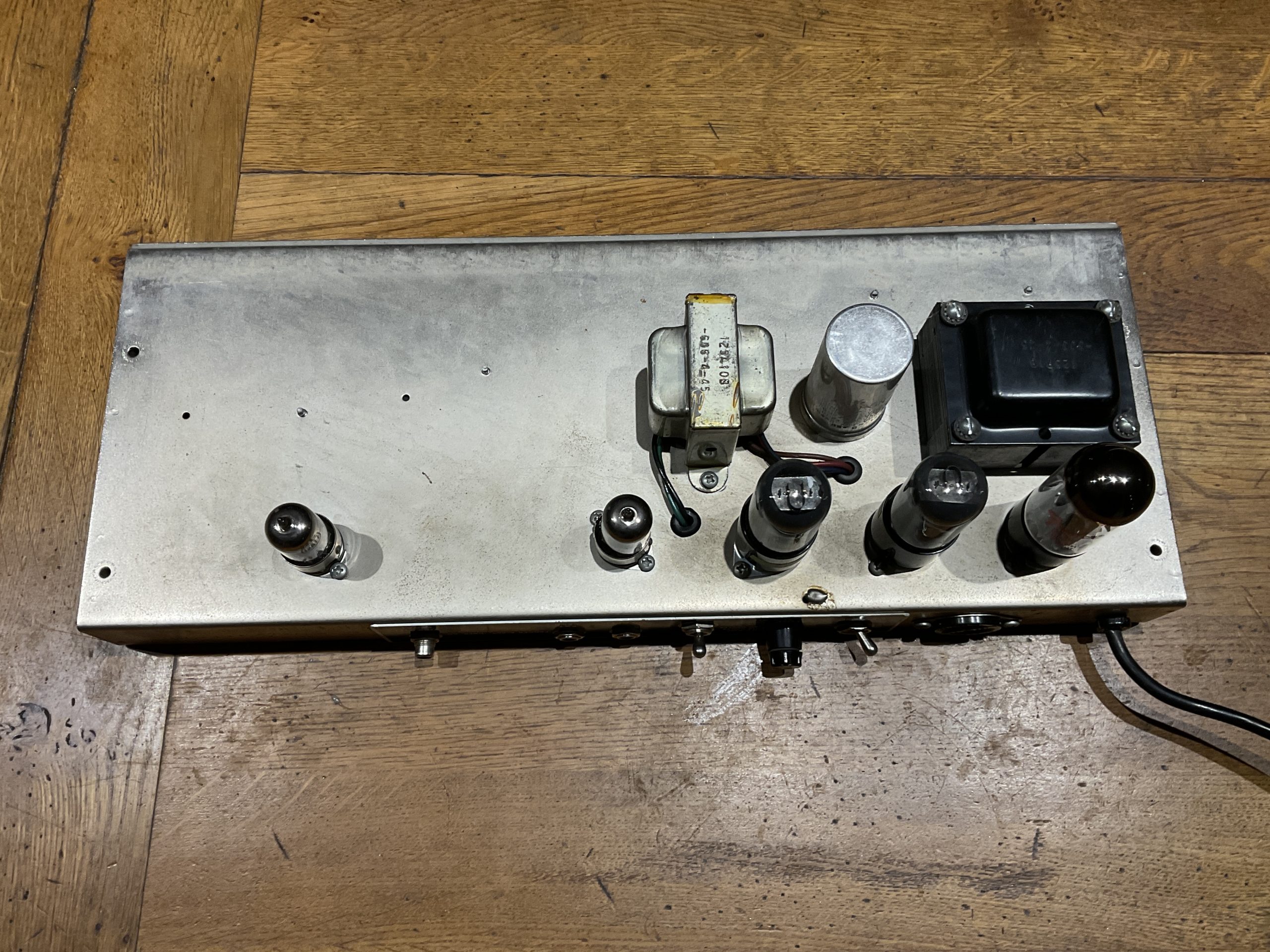 Here we have a fine example of an early black face Fender Princeton manufactured by the factory marks and pot codes to December 1964 (50th week) its year of introduction. It looks to be very original with the exception of an up to date earthed 3 prong cord and death cap isolation. Its running original spec RCA 6V6GT power valves and RCA 12 AX7’s with a Fender rectifier valve. With its original speaker, it really is a lovely sounding amplifier from Fender’s golden era. The tremolo foot switch is a genuine Fender replacement and the speaker to amp cable has been uprated. Serviced and ready to go, its a USA 110v example so will need a step down transformer