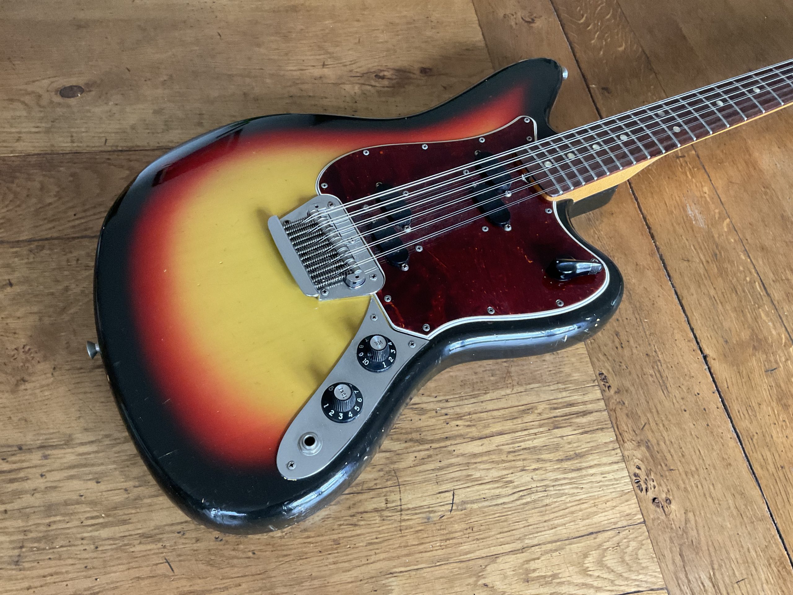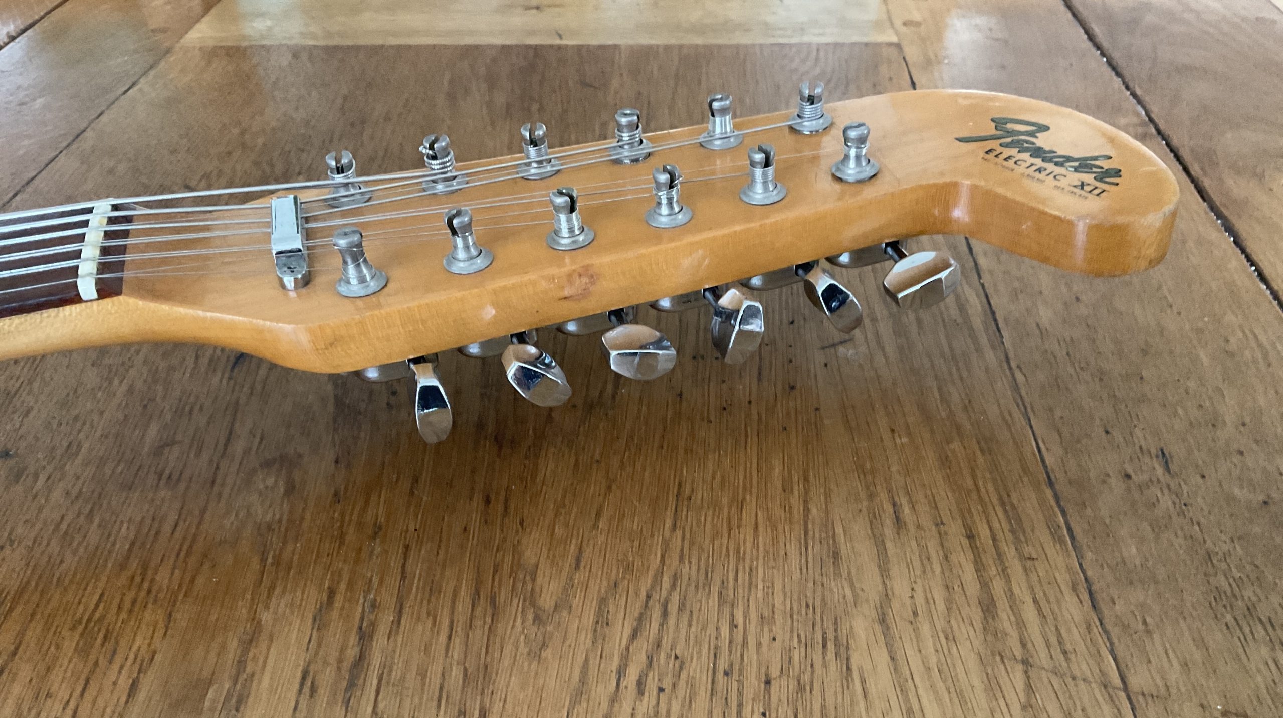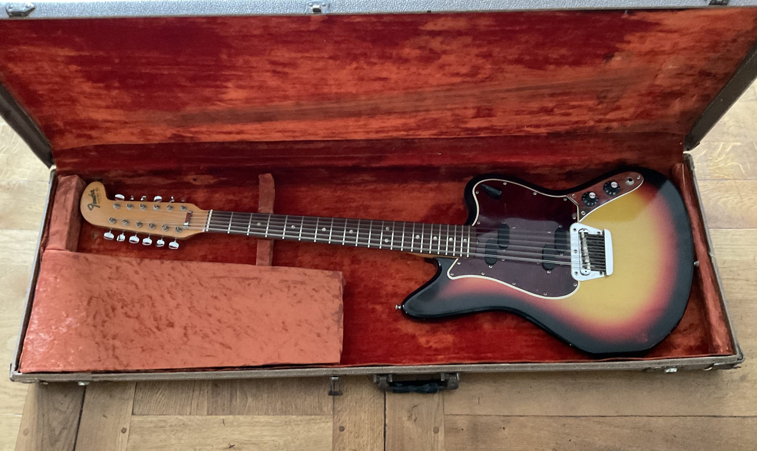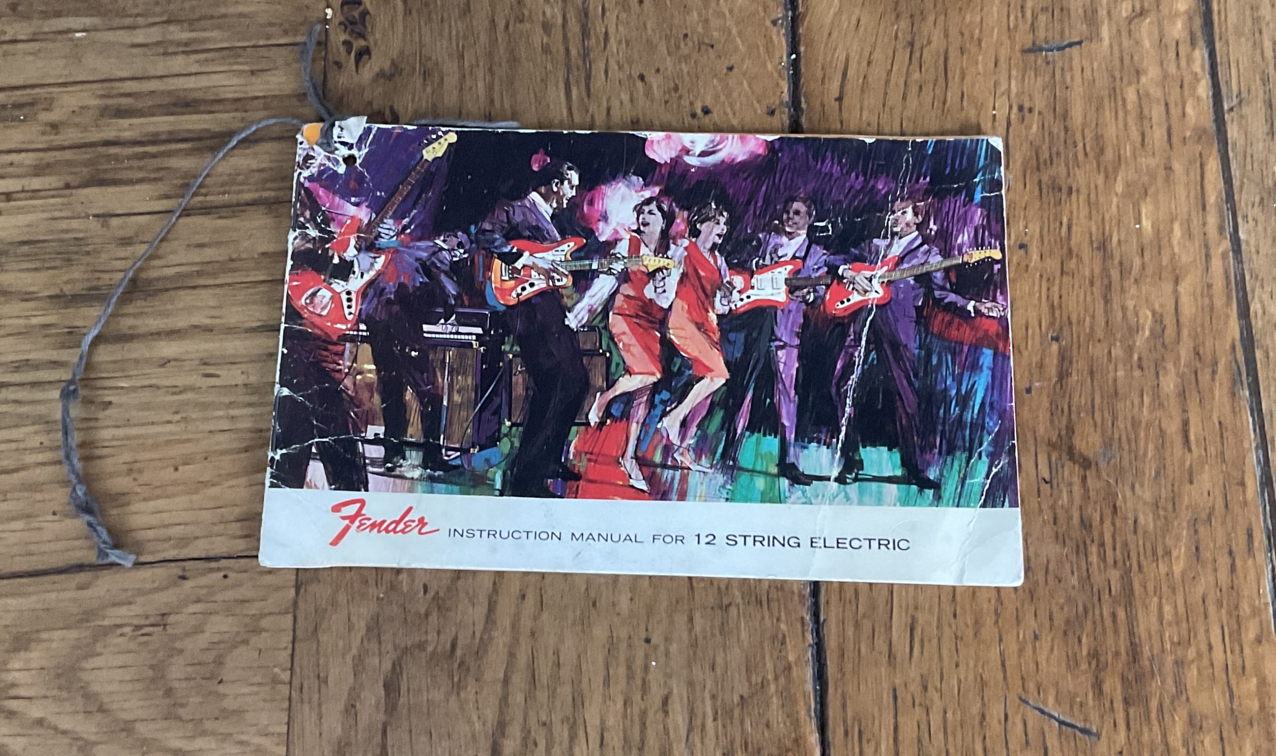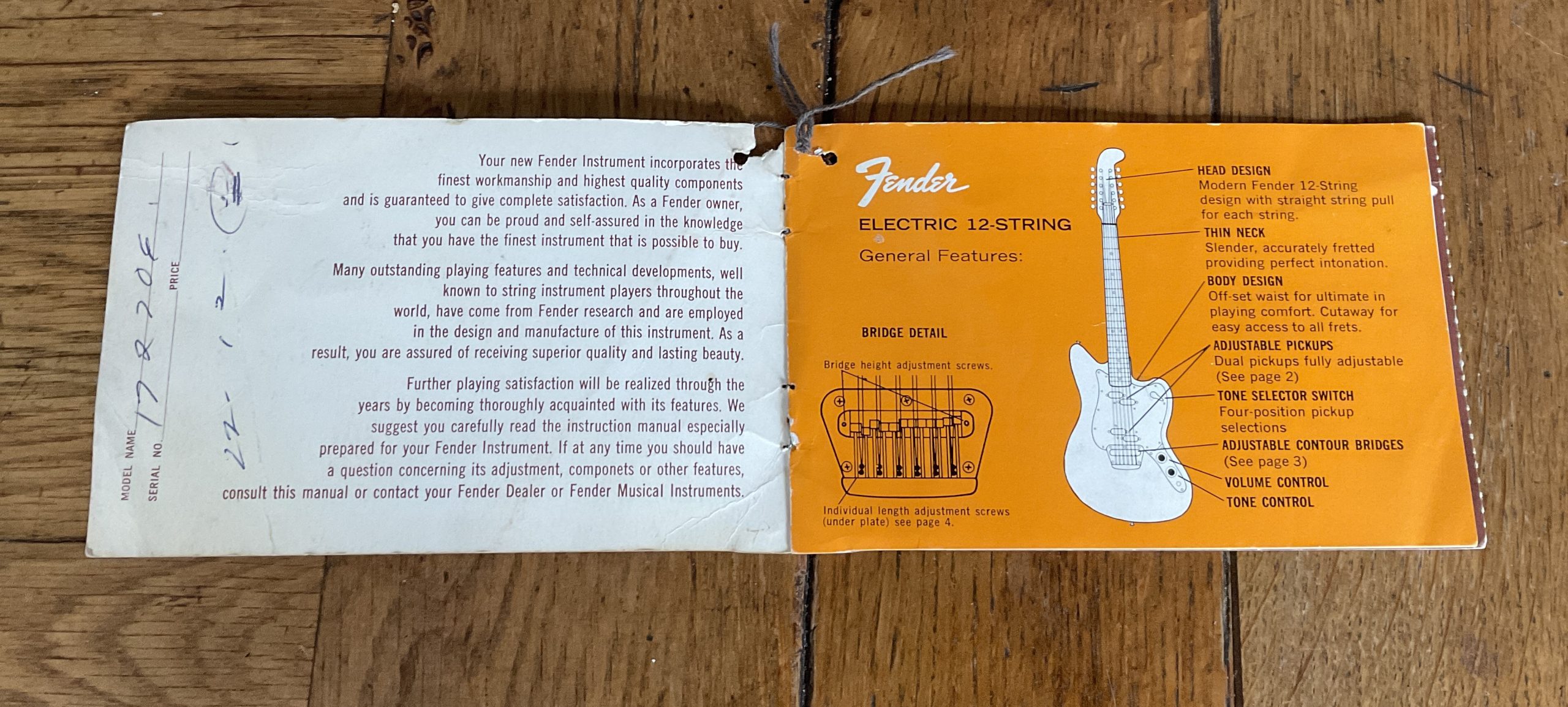 Here we have a fine example of Fender’s legendary electric 12 string, its neck is dated February 66 and its potentiometers 17th week of 1966. Its a dot neck guitar with an unbound fingerboard. It weighs 8 lbs 5 oz and its neck pickup reads 9.5 k ohms and the bridge 9.2 k ohms. It’s also stamped “special” under the neck plate like many from this era seem to be as the model is fairly new to the Fender line up being introduced in mid 1965 and many early guitar’s featured at trade shows to promote the new instrument. The guitar plays perfectly with a nice low action easily explaining why these 12’s were a firm studio favourite. It also comes with its original handbook with matching serial number which is not often seen. The case is a Fender pre CBS brown tolex case and whilst not being in the best condition with some repairs and a missing latch, holds the guitar comfortably and does the job.