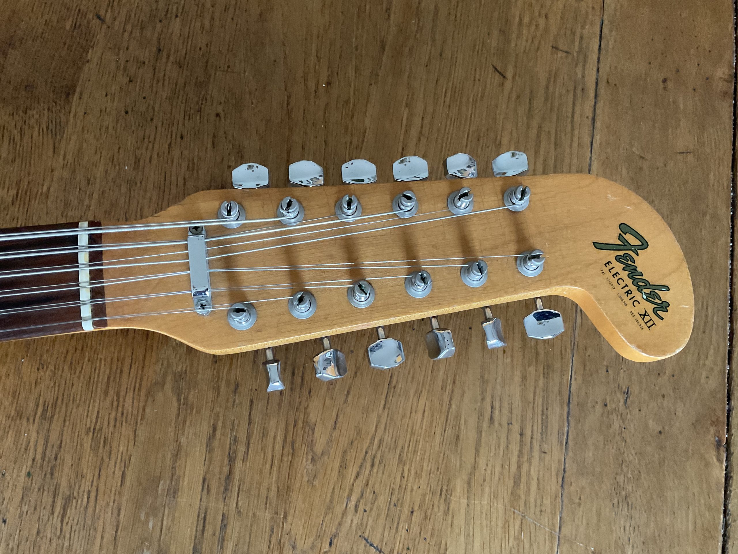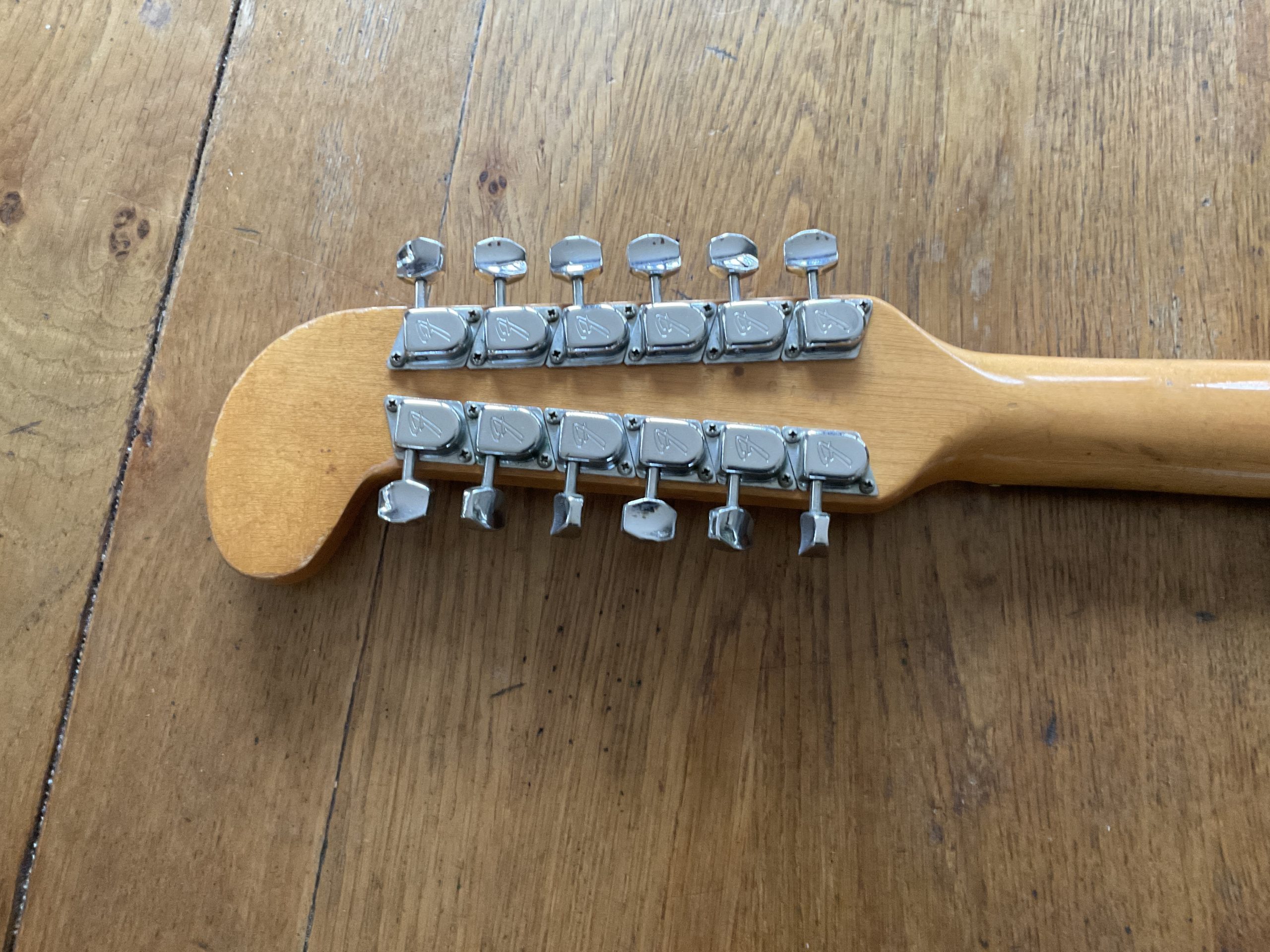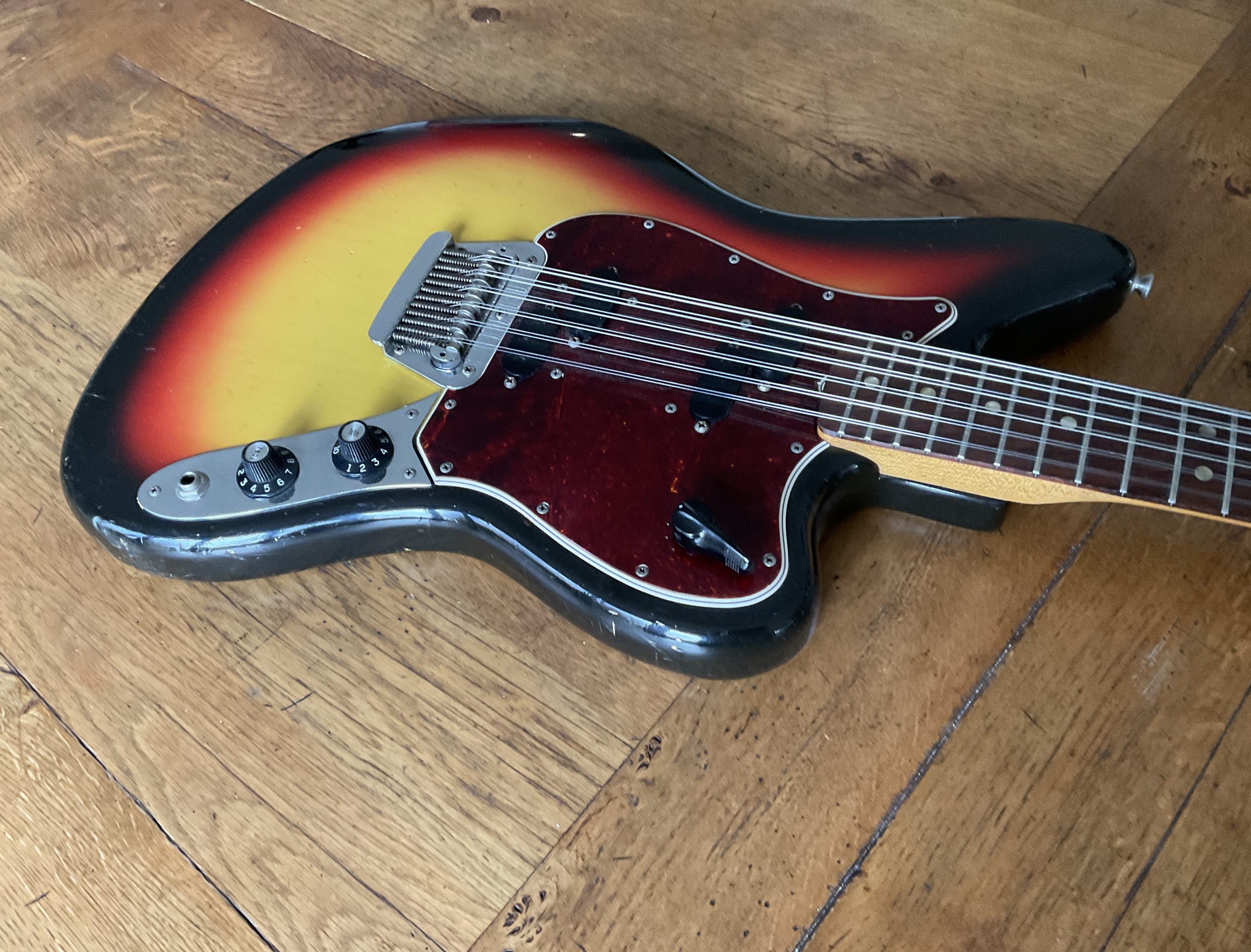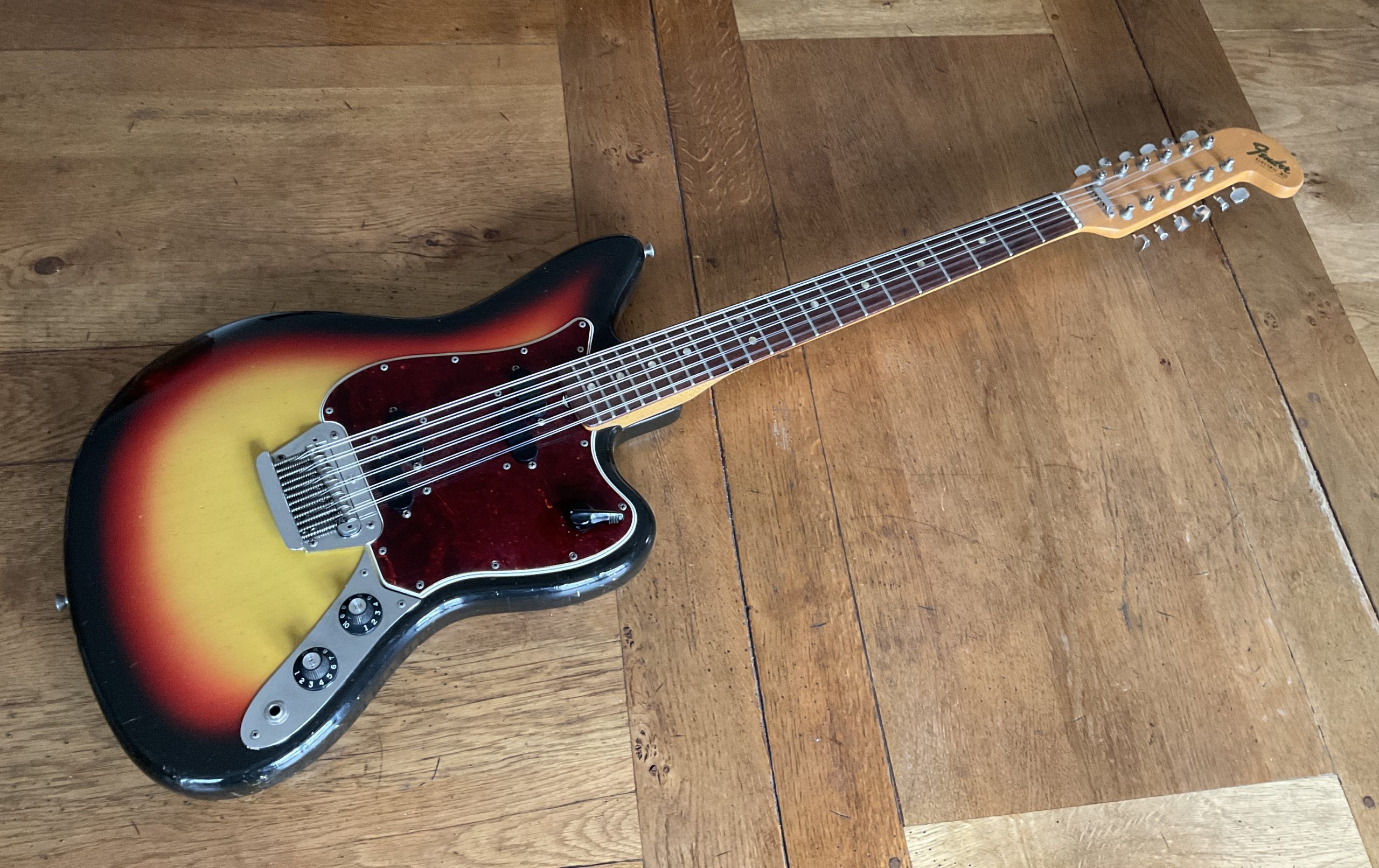 Here we have a fine example of Fender’s legendary electric 12 string, its neck is dated February 66 and its potentiometers 17th week of 1966. Its a dot neck guitar with an unbound fingerboard. It weighs 8 lbs 5 oz and its neck pickup reads 9.5 k ohms and the bridge 9.2 k ohms. It’s also stamped “special” under the neck plate like many from this era seem to be as the model is fairly new to the Fender line up being introduced in mid 1965 and many early guitar’s featured at trade shows to promote the new instrument. The guitar plays perfectly with a nice low action easily explaining why these 12’s were a firm studio favourite. It also comes with its original handbook with matching serial number which is not often seen. The case is a Fender pre CBS brown tolex case and whilst not being in the best condition with some repairs and a missing latch, holds the guitar comfortably and does the job.