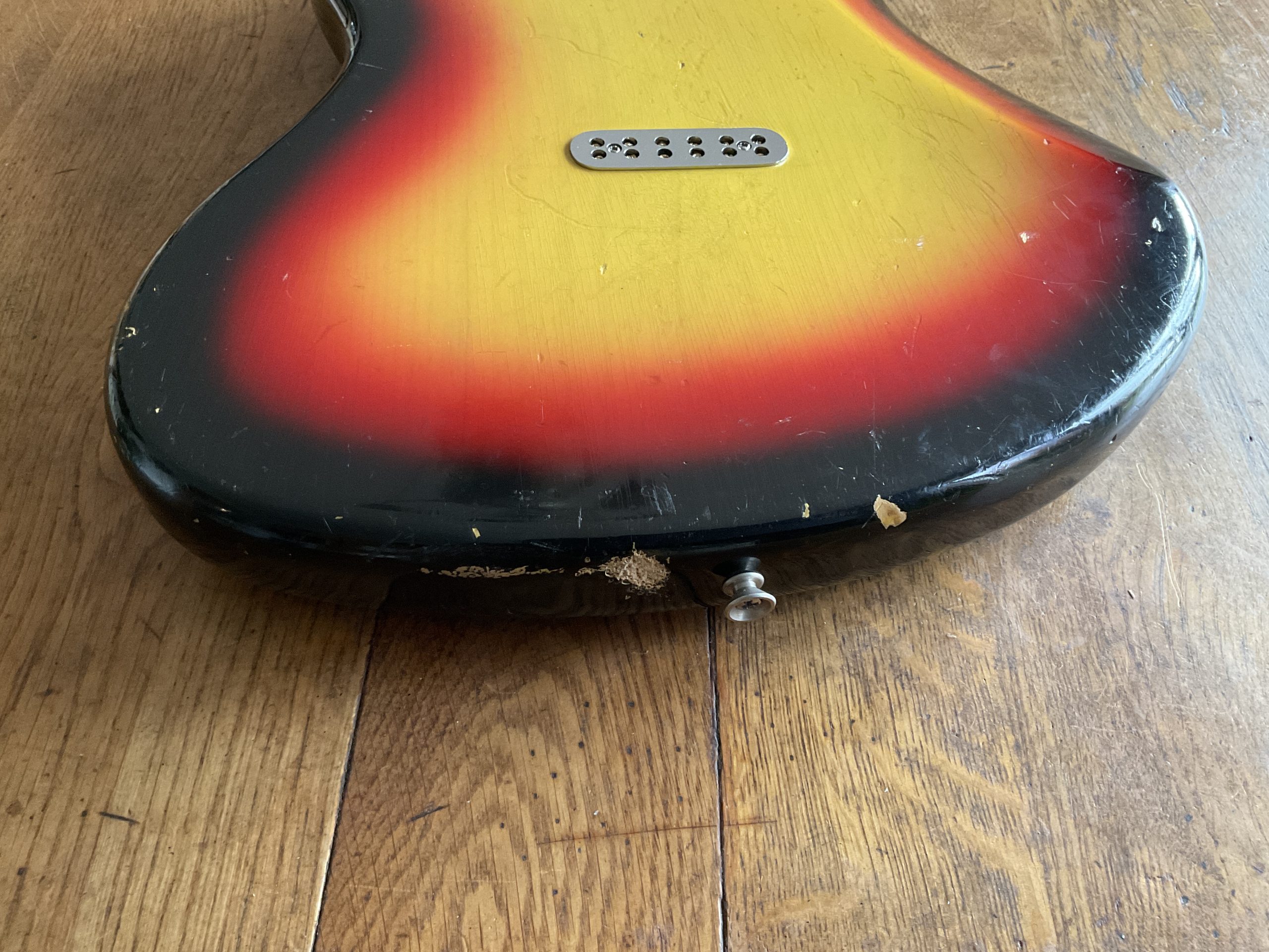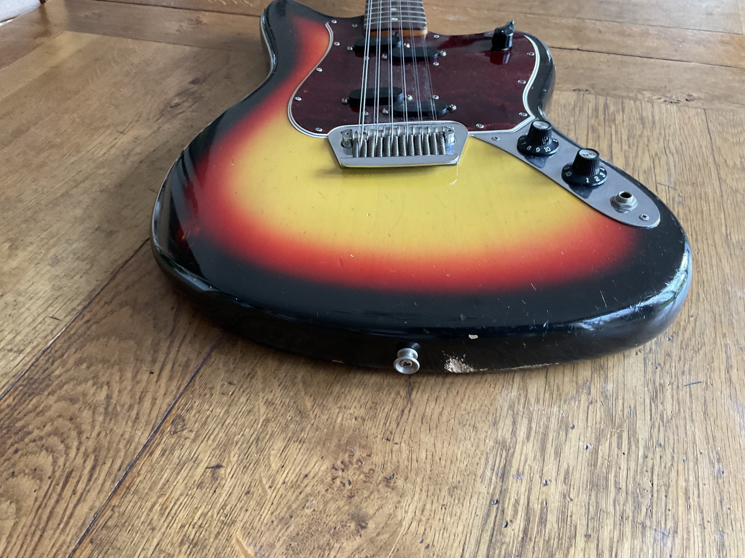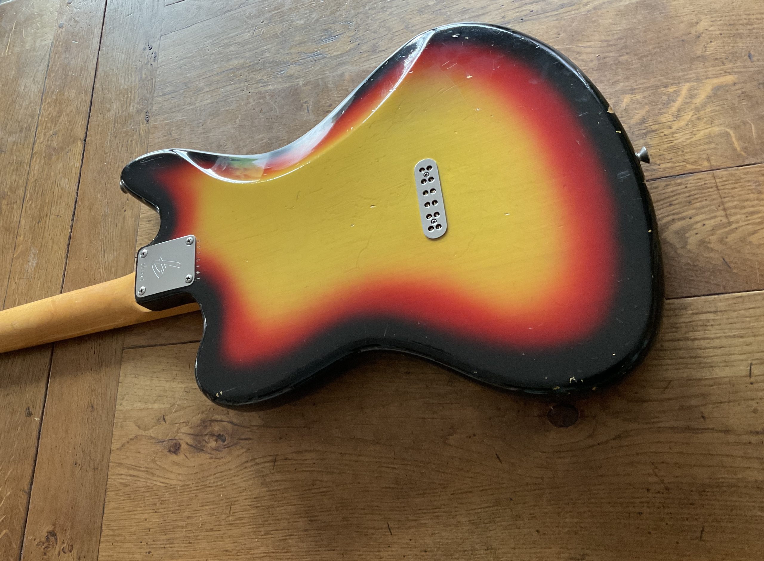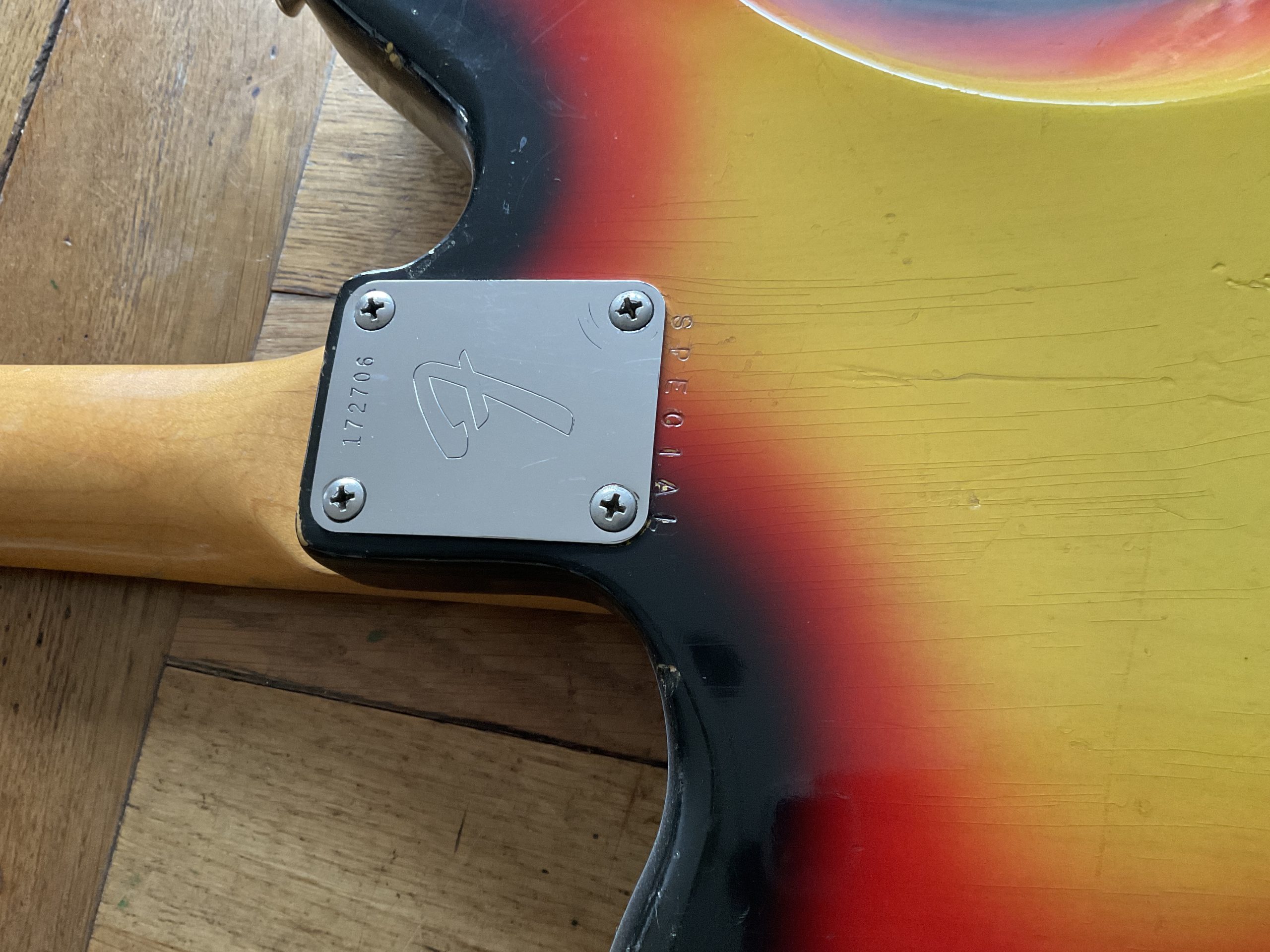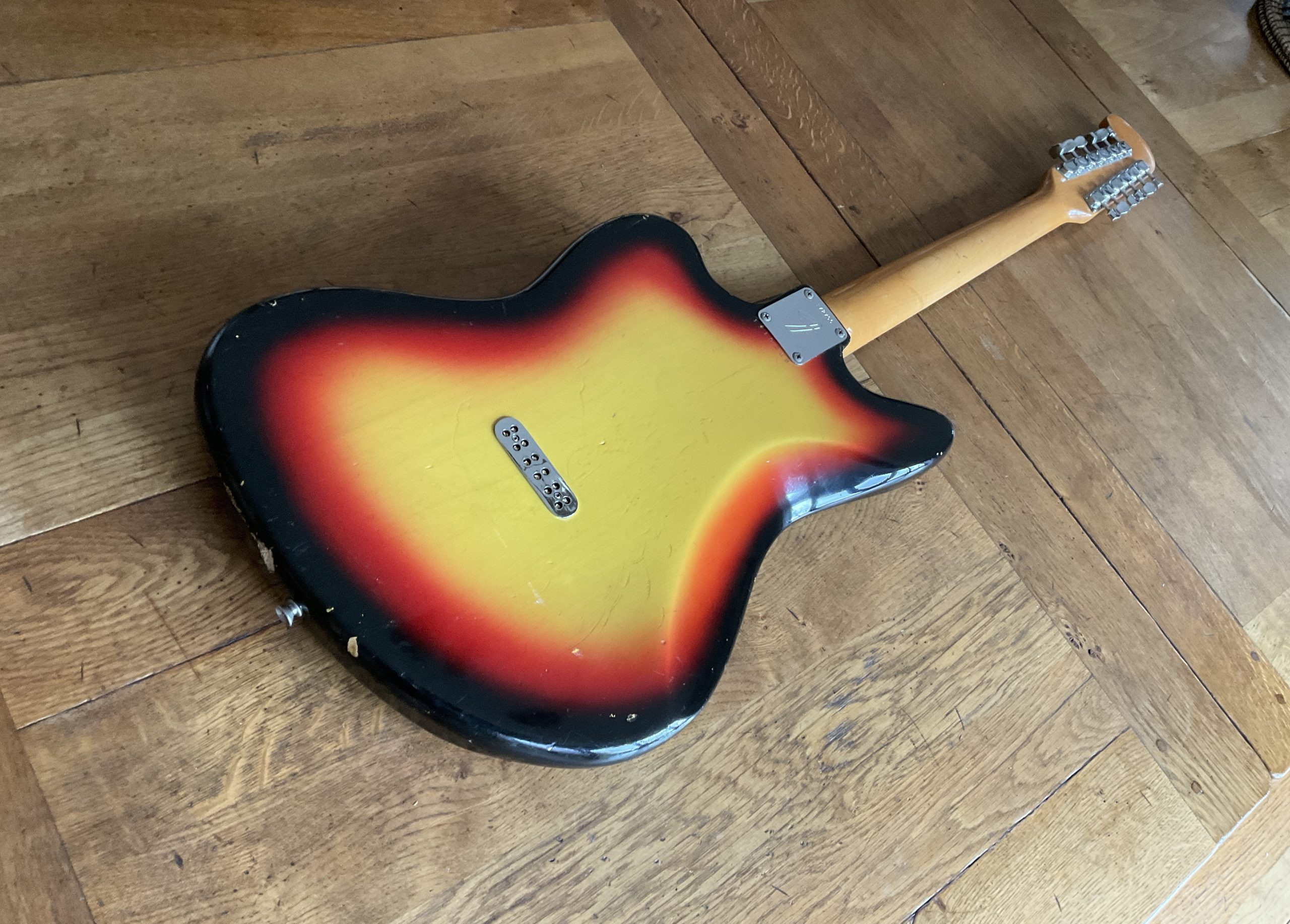 Here we have a fine example of Fender’s legendary electric 12 string, its neck is dated February 66 and its potentiometers 17th week of 1966. Its a dot neck guitar with an unbound fingerboard. It weighs 8 lbs 5 oz and its neck pickup reads 9.5 k ohms and the bridge 9.2 k ohms. It’s also stamped “special” under the neck plate like many from this era seem to be as the model is fairly new to the Fender line up being introduced in mid 1965 and many early guitar’s featured at trade shows to promote the new instrument. The guitar plays perfectly with a nice low action easily explaining why these 12’s were a firm studio favourite. It also comes with its original handbook with matching serial number which is not often seen. The case is a Fender pre CBS brown tolex case and whilst not being in the best condition with some repairs and a missing latch, holds the guitar comfortably and does the job.