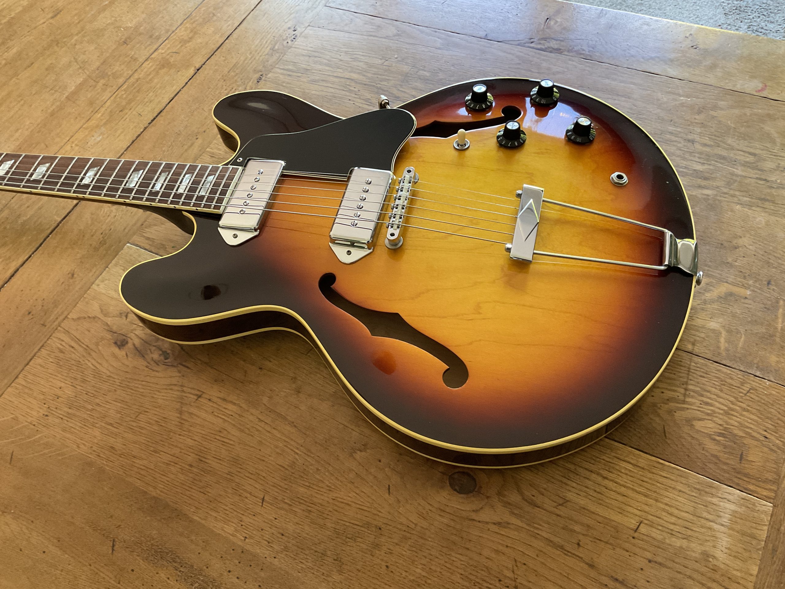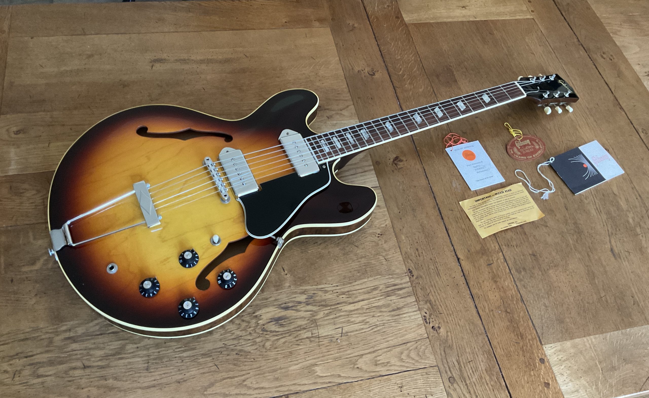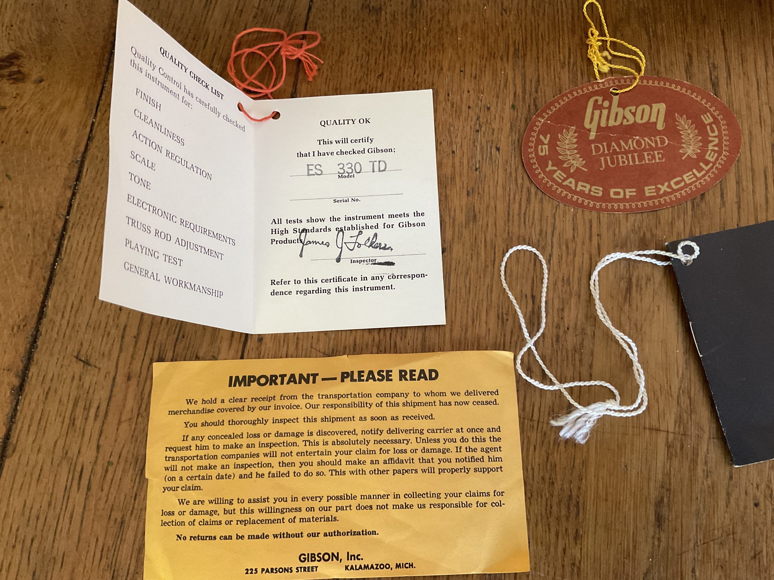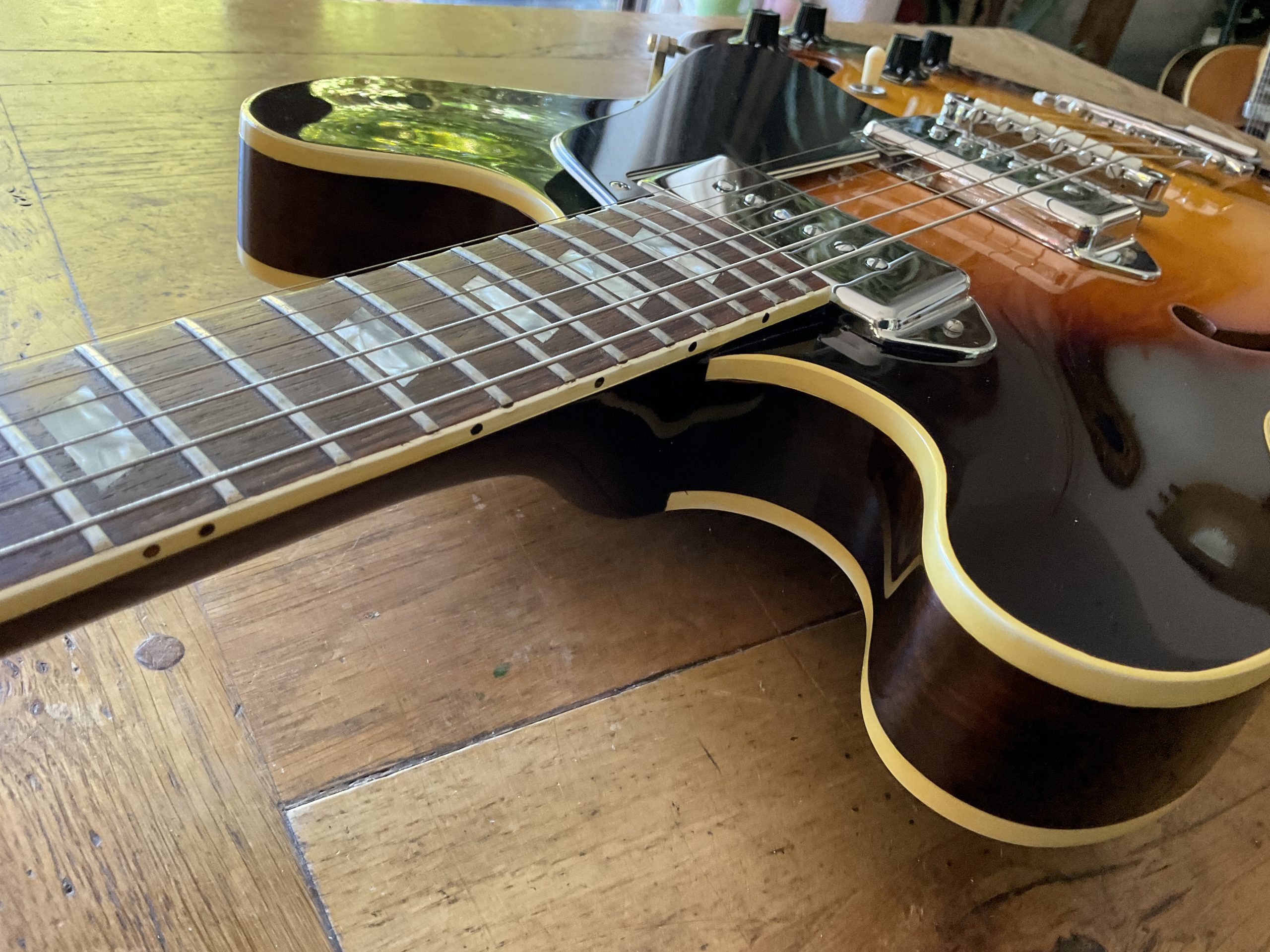 weighing in at just a hair over 6 lbs is this unbelievably clean 1969 Gibson ES 330  complete with its case and hang tags, a true investment collector grade guitar if i ever saw one. I hate the term “mint” as someone will find something somewhere, but apart from the lightest of handling marks it can be described as mint condition. This guitar now has the long ES 335 style neck that joins the body at the 17th fret and the more astute among you will notice that it sports Epiphone Casino trapezoid inlays. This is the second ES 330 i have had with this style of inlay, so perhaps a special order or more likely a mixup or shortage of block inlays at the factory on that day. Either way its very cool to have. The sunburst finish is rich and unfaded and all the chrome and plastic gleams like new. Neck pickup reads 8.2k ohms and the Bridge 7.8k ohms and the guitar sounds full and balanced. The nut measures 40mm and of course the frets and board are unmarked. One for the collector perhaps but it is a joy to play!