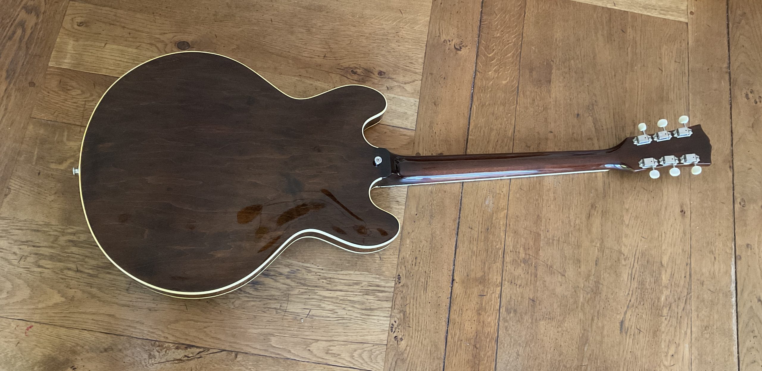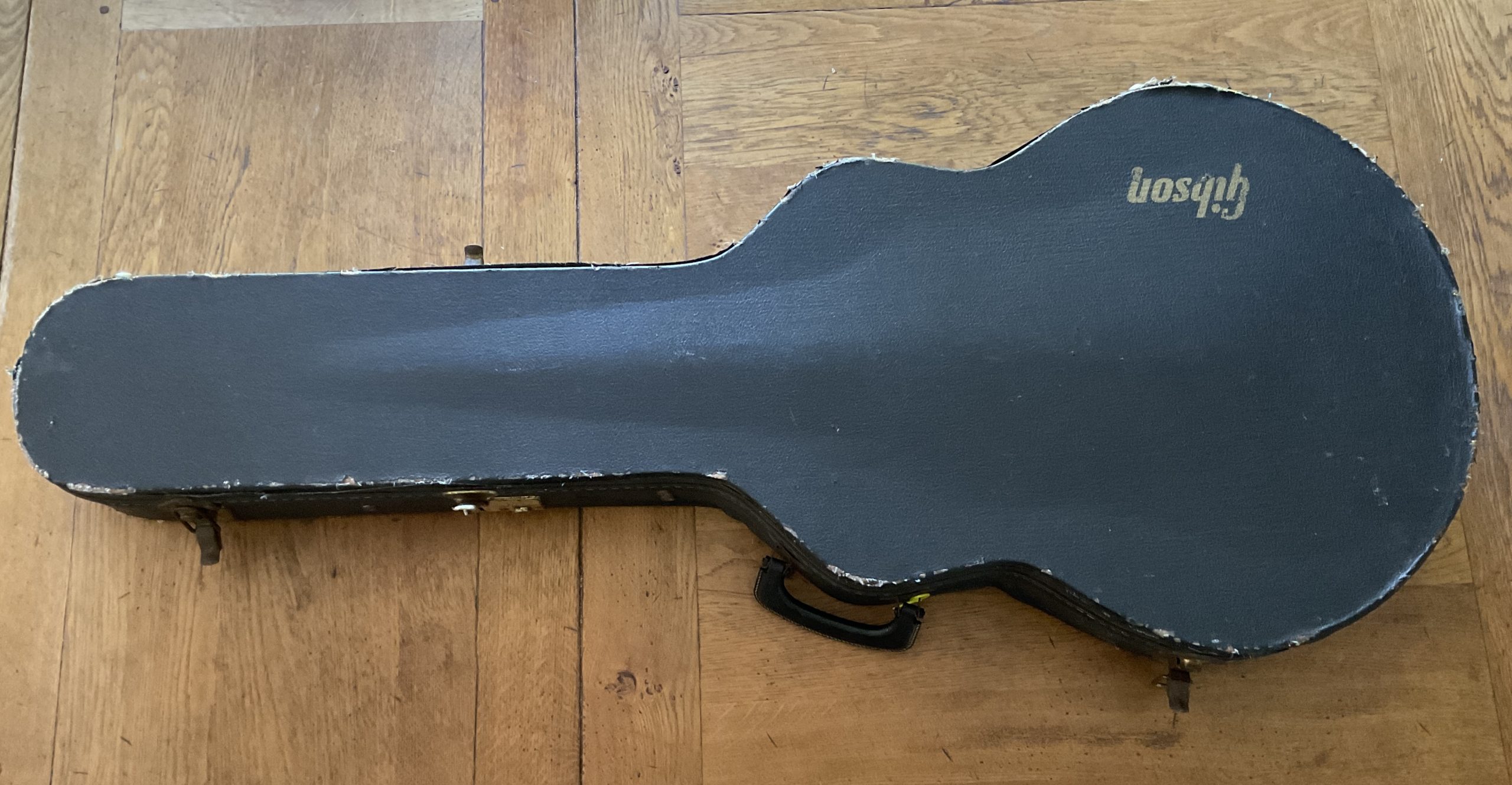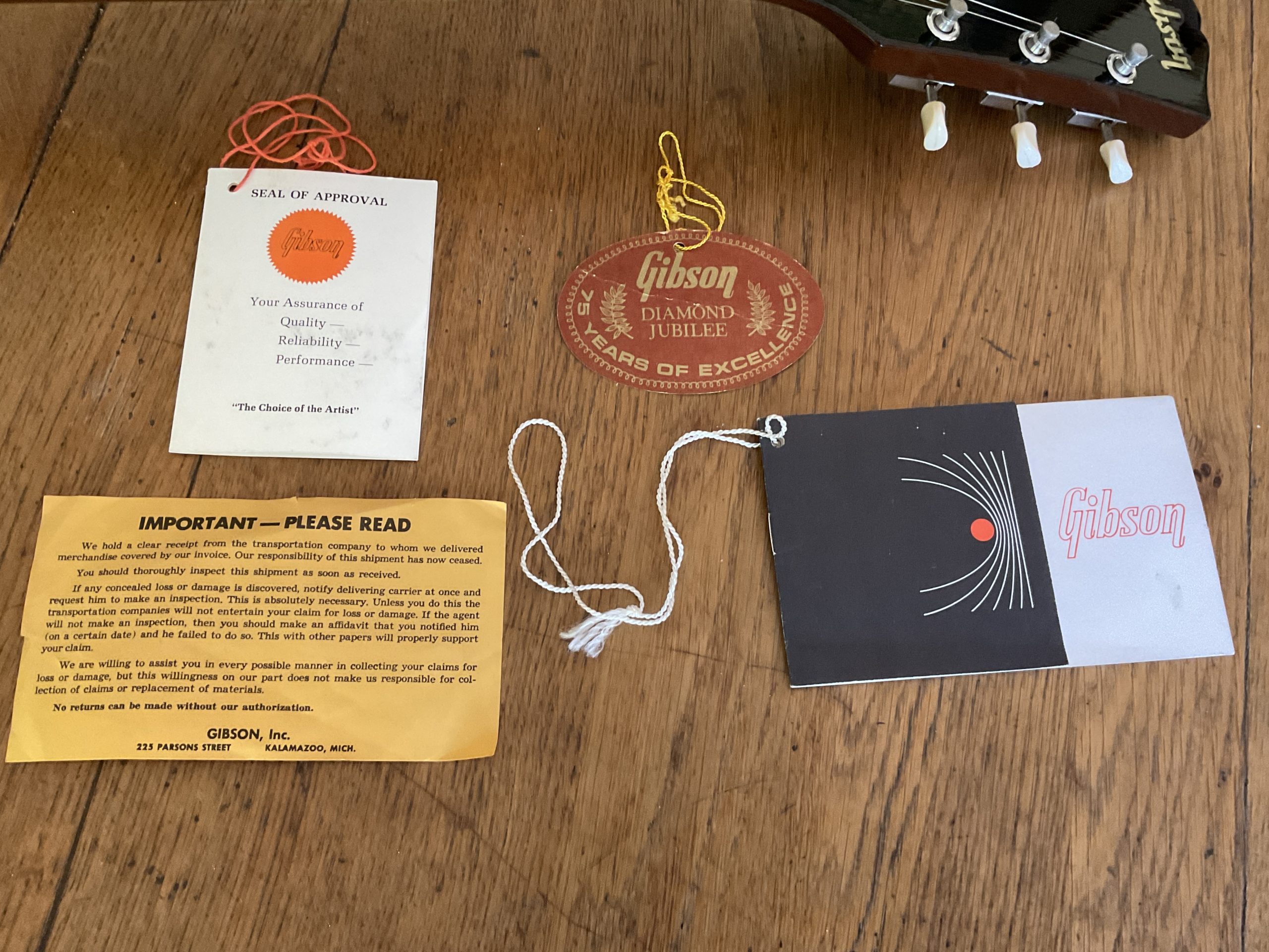 weighing in at just a hair over 6 lbs is this unbelievably clean 1969 Gibson ES 330  complete with its case and hang tags, a true investment collector grade guitar if i ever saw one. I hate the term “mint” as someone will find something somewhere, but apart from the lightest of handling marks it can be described as mint condition. This guitar now has the long ES 335 style neck that joins the body at the 17th fret and the more astute among you will notice that it sports Epiphone Casino trapezoid inlays. This is the second ES 330 i have had with this style of inlay, so perhaps a special order or more likely a mixup or shortage of block inlays at the factory on that day. Either way its very cool to have. The sunburst finish is rich and unfaded and all the chrome and plastic gleams like new. Neck pickup reads 8.2k ohms and the Bridge 7.8k ohms and the guitar sounds full and balanced. The nut measures 40mm and of course the frets and board are unmarked. One for the collector perhaps but it is a joy to play!
