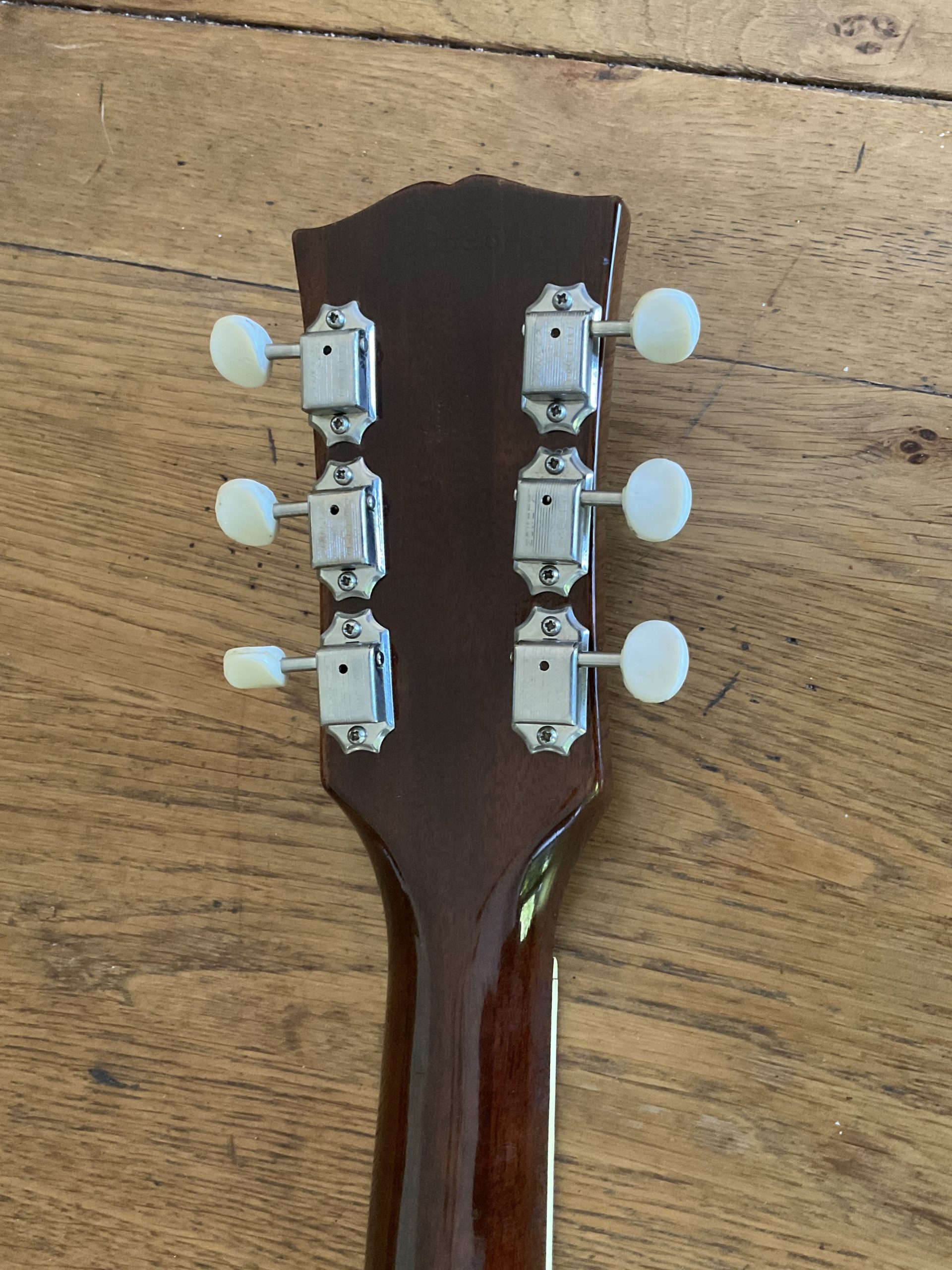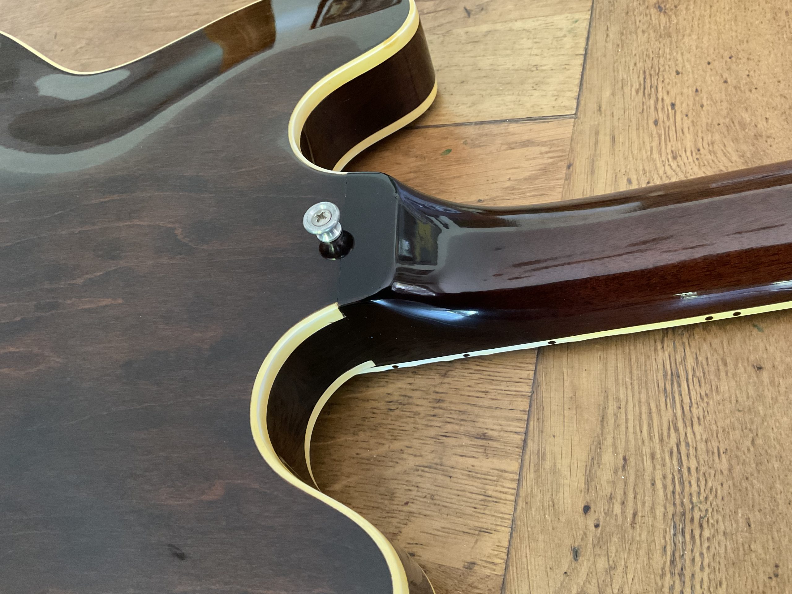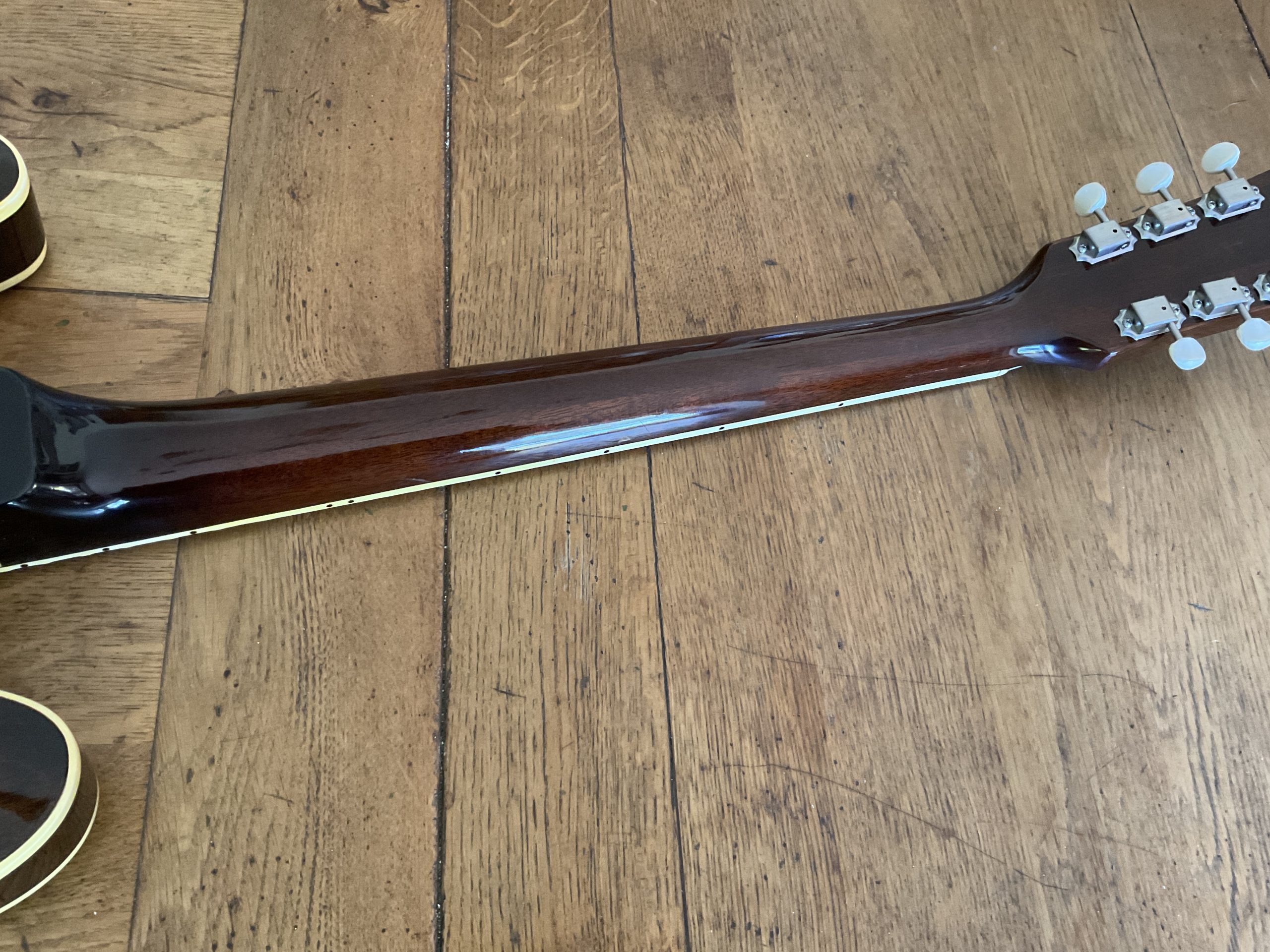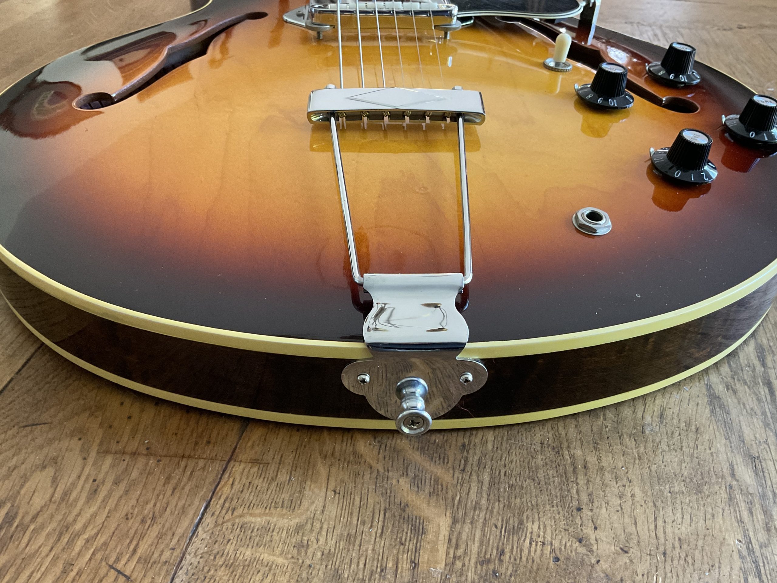 weighing in at just a hair over 6 lbs is this unbelievably clean 1969 Gibson ES 330  complete with its case and hang tags, a true investment collector grade guitar if i ever saw one. I hate the term “mint” as someone will find something somewhere, but apart from the lightest of handling marks it can be described as mint condition. This guitar now has the long ES 335 style neck that joins the body at the 17th fret and the more astute among you will notice that it sports Epiphone Casino trapezoid inlays. This is the second ES 330 i have had with this style of inlay, so perhaps a special order or more likely a mixup or shortage of block inlays at the factory on that day. Either way its very cool to have. The sunburst finish is rich and unfaded and all the chrome and plastic gleams like new. Neck pickup reads 8.2k ohms and the Bridge 7.8k ohms and the guitar sounds full and balanced. The nut measures 40mm and of course the frets and board are unmarked. One for the collector perhaps but it is a joy to play!