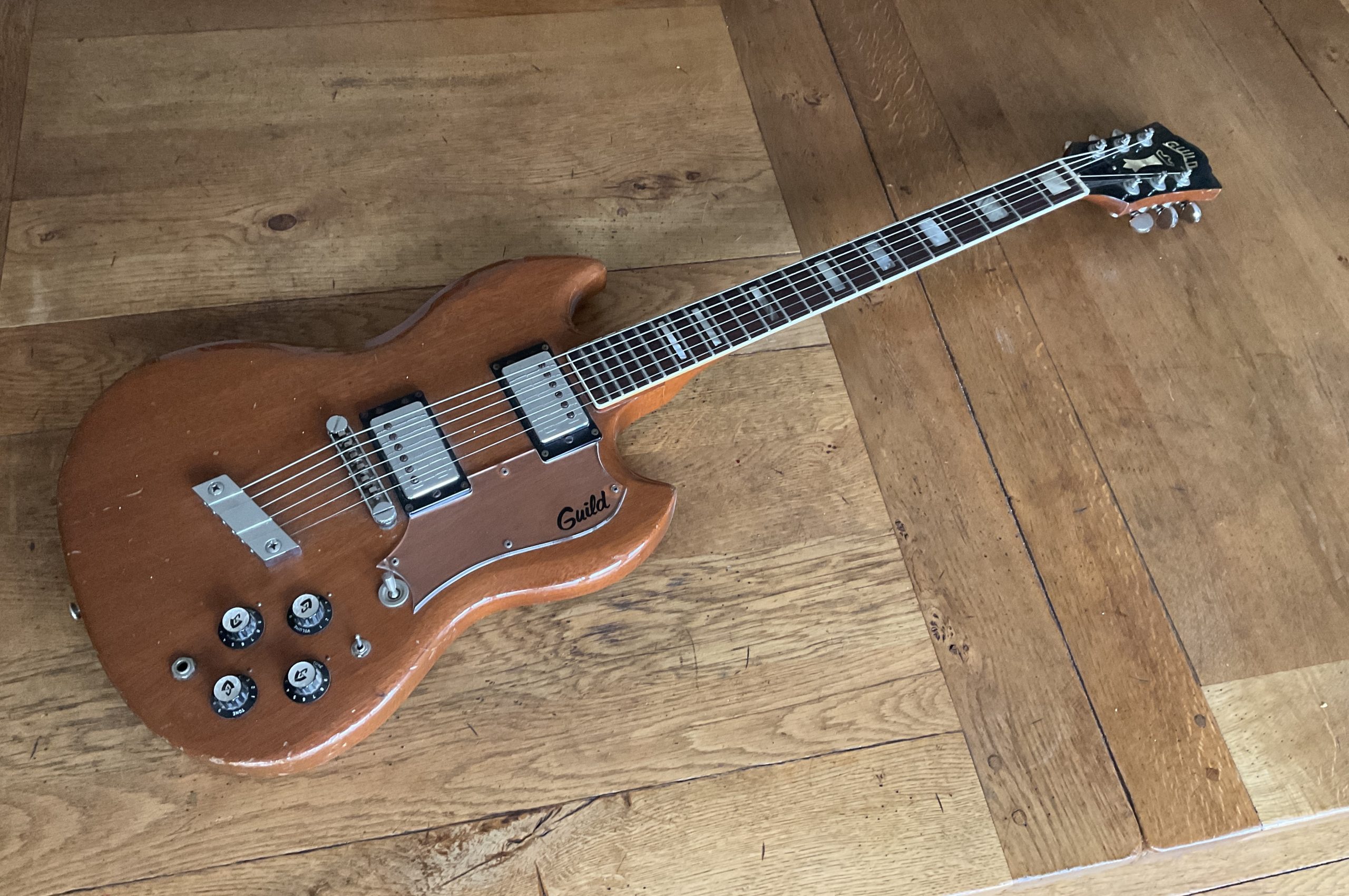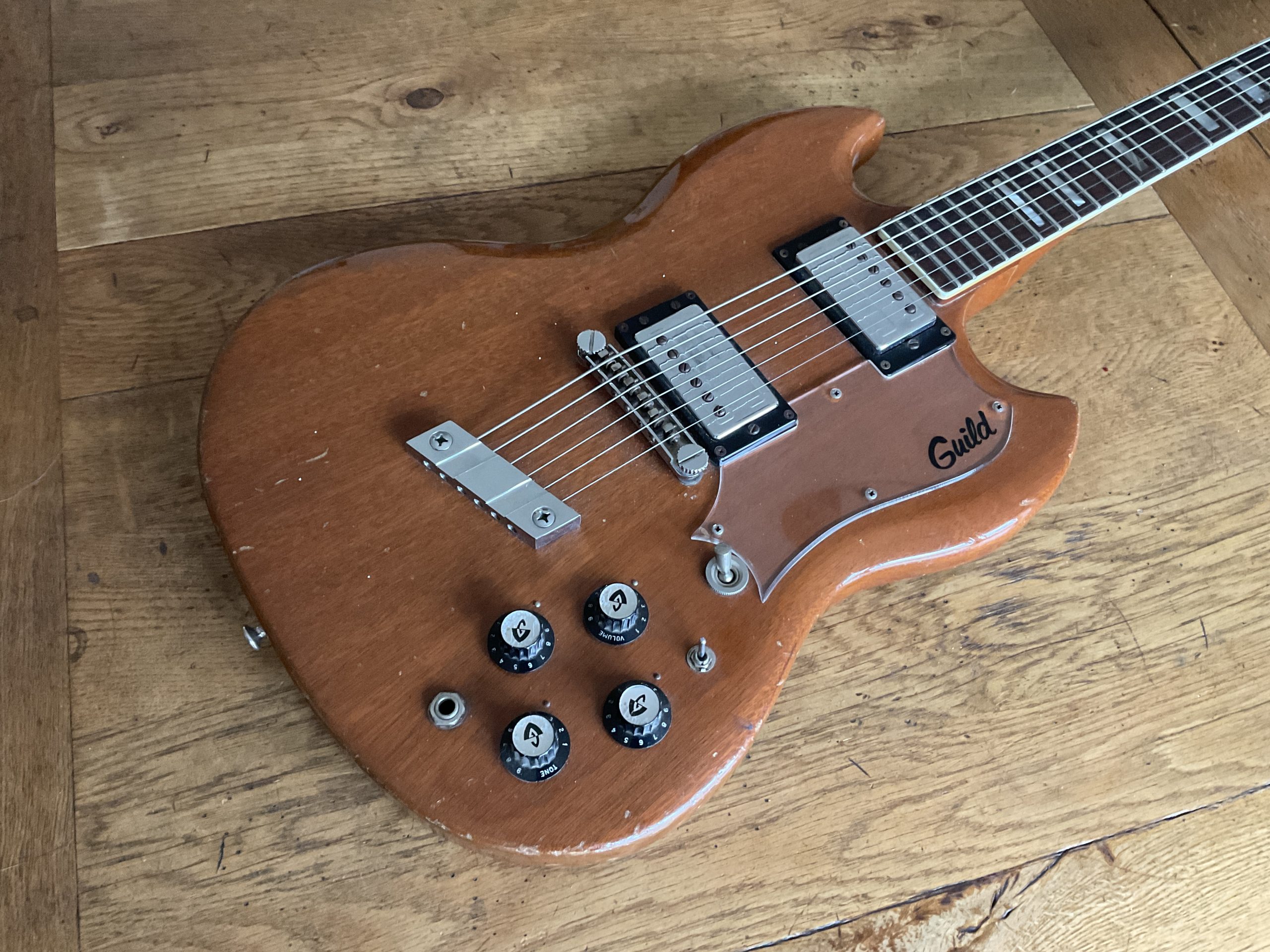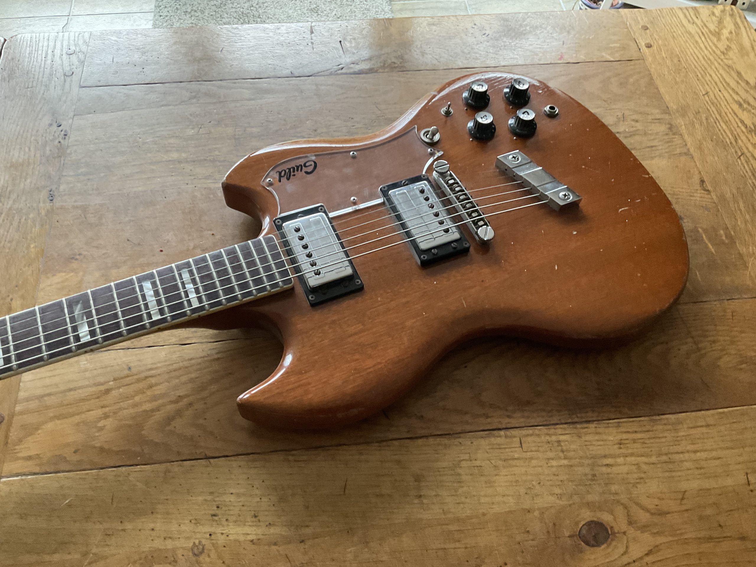 A fine example of Guilds Gibson SG beater and weighing in at just 6lb 8oz finished in natural mahogany and features 2 Guild humbucker pickups with the neck giving a resistance reading of 8.8 k ohms and the Bridge 7.8K. There is also a factory phase reverse switch giving you an out of phase tone in the middle position. The guitar is in good all original condition with just some bumps and scrapes from normal play wear over the years. The frets are also in good shape making for a nice playing guitar with a low playing action. Comes in a plastic ABS case which fits the guitar well
