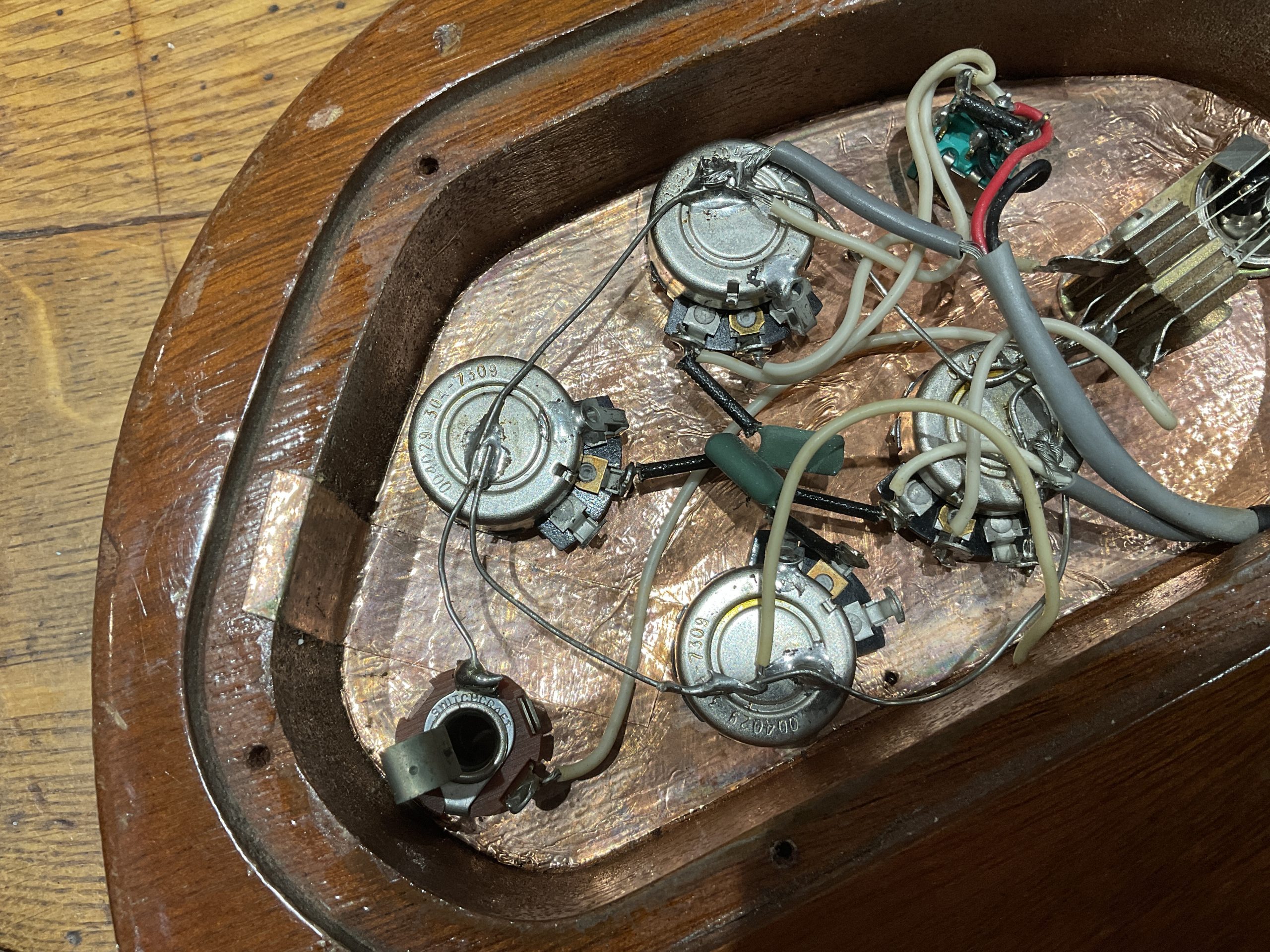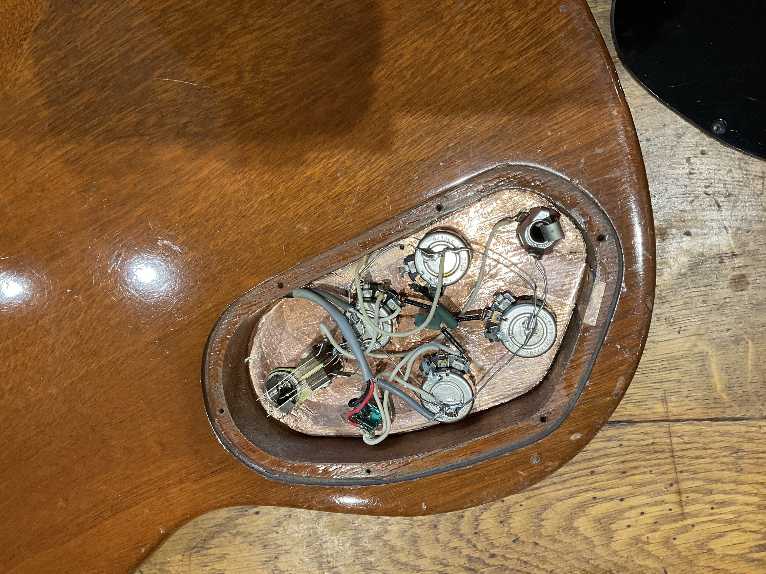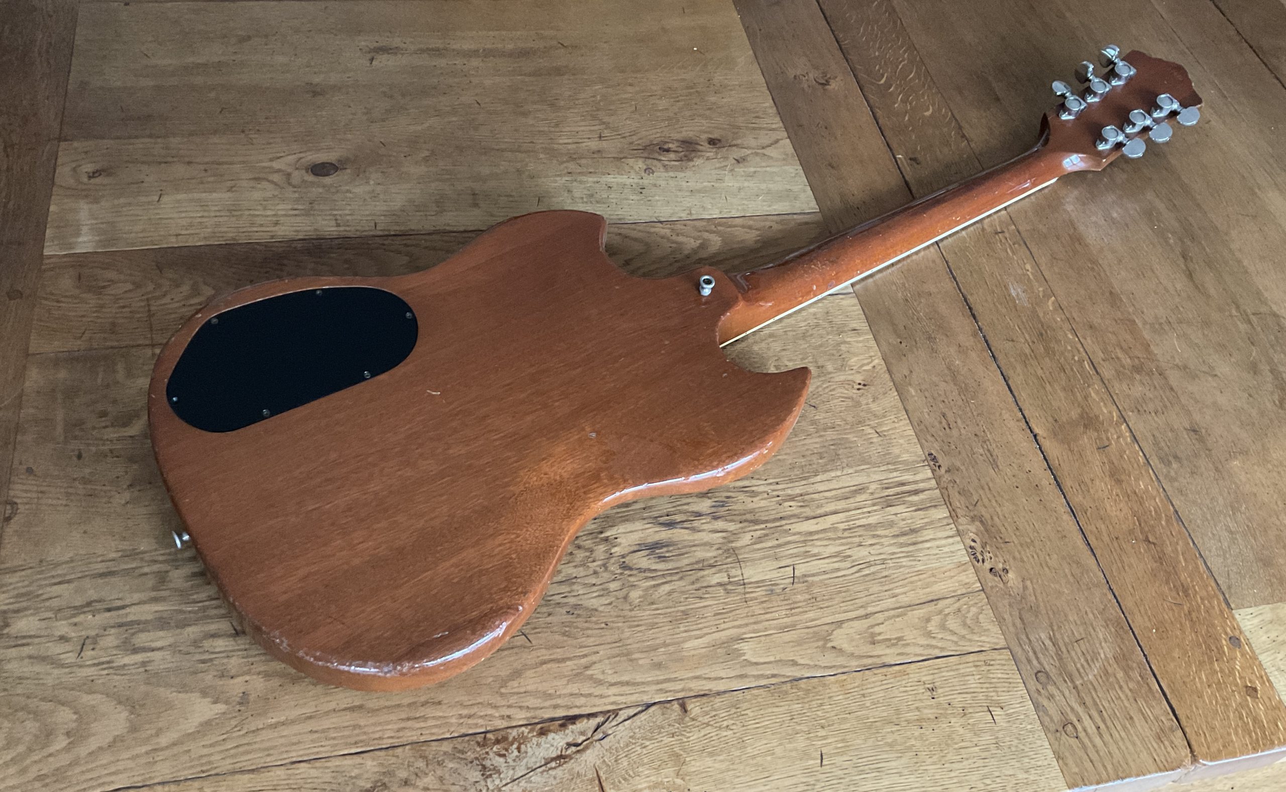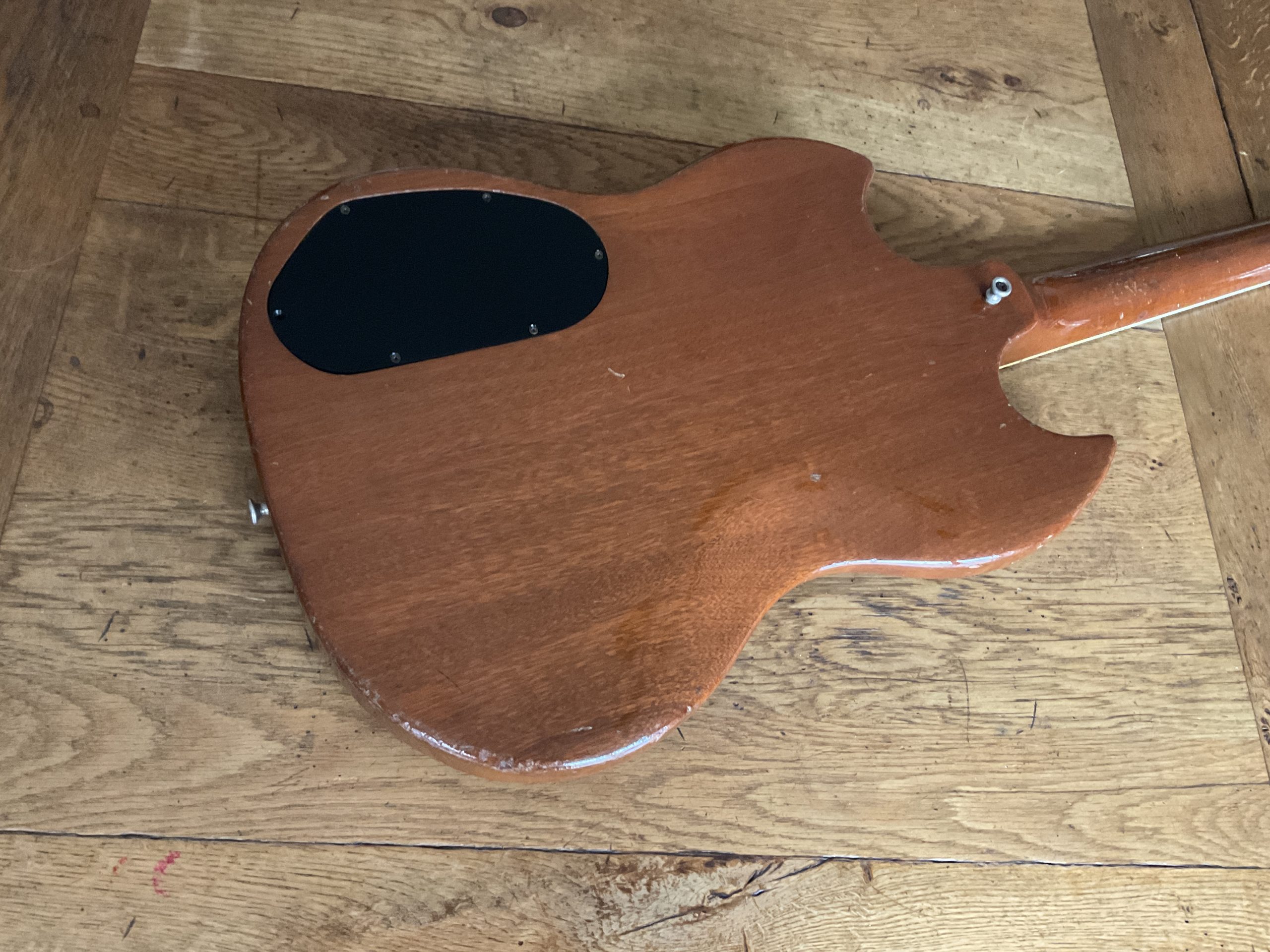 A fine example of Guilds Gibson SG beater and weighing in at just 6lb 8oz finished in natural mahogany and features 2 Guild humbucker pickups with the neck giving a resistance reading of 8.8 k ohms and the Bridge 7.8K. There is also a factory phase reverse switch giving you an out of phase tone in the middle position. The guitar is in good all original condition with just some bumps and scrapes from normal play wear over the years. The frets are also in good shape making for a nice playing guitar with a low playing action. Comes in a plastic ABS case which fits the guitar well