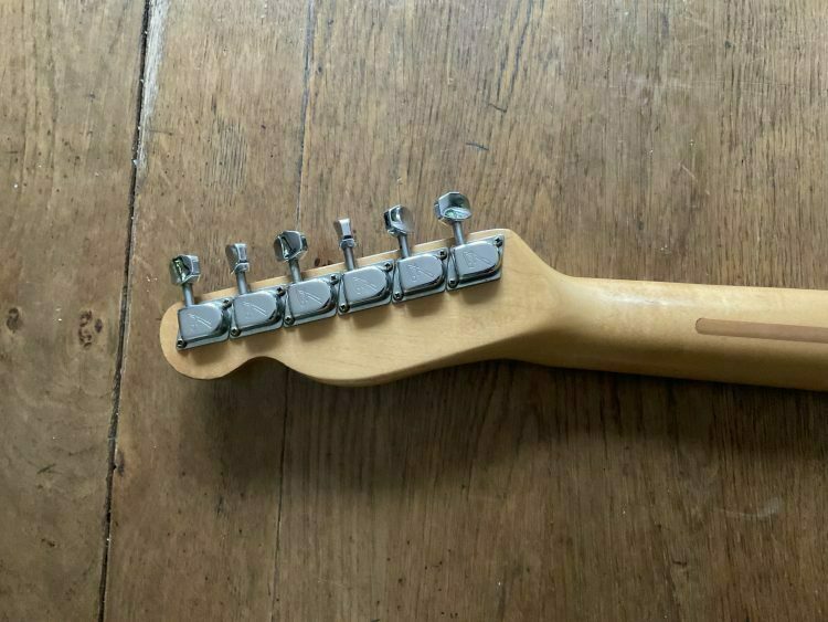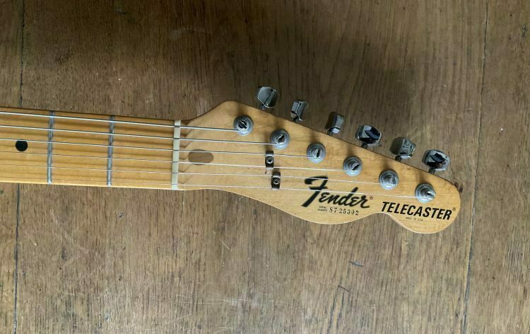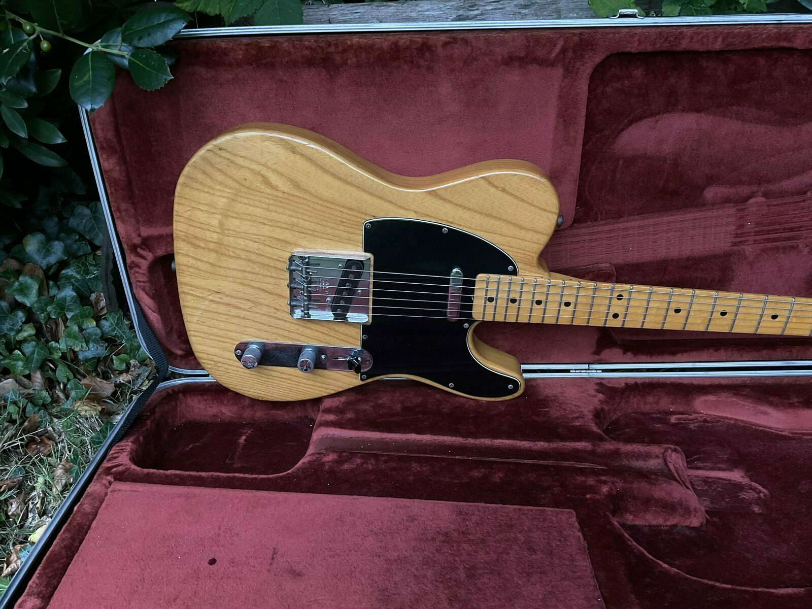 Proof that great things could happen in the Fender CBS era is this awesome Fender Telecaster in natural. Featuring a 2 piece ash body ( nearly centre seam!) and weighing in at 7 lbs 9 oz or 3.59 kg which in itself is no mean feat for the era. The electronics are untouched and the pickups measure 6.8 k neck and 6.1 k ohms bridge. Pots date the guitar to the 35th week of 1977. Needless to say it has the classic “Tele” sound suitable for every musical genre. Its had a refret in the past, and the medium wire is in perfect shape and hence the guitar plays faultlessly. The finish has aged to a lovely butter scotch hue and now nails the early “Black Guard” look. Unlike the Stratocaster the telecaster escaped many of the negative 1970’s CBS improvements that slowly eroded the Fender range through the 1970’s. With that in mind the maple neck profile is not that far off in profile to my own 54 with a comfortable C with a hint of V below the first 5 frets. The overall finish condition is in line for a guitar with normal use for its age. All in all a very nice guitar that comes in a slightly later Fender ABS case which has held a strat in the past. These CBS guitars are now beginning to catch up in the market and this represents one of the best telecasters from the era i have seen.