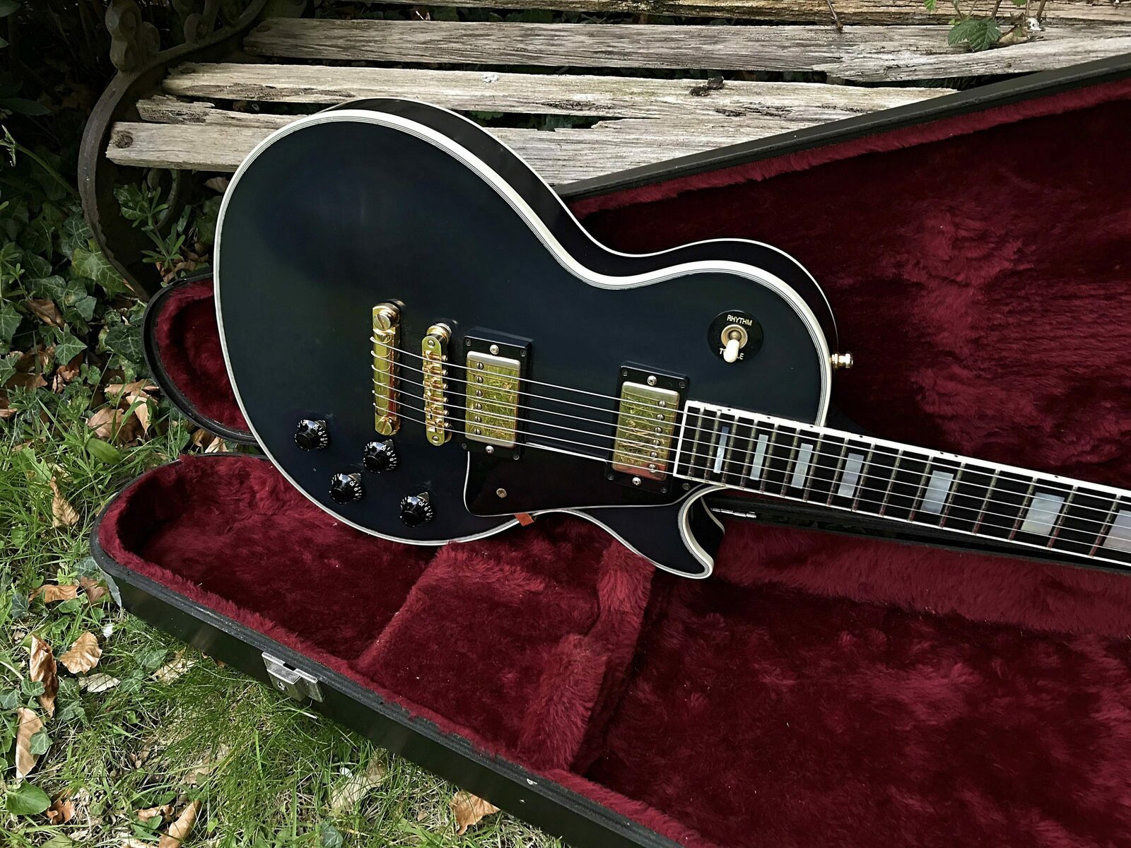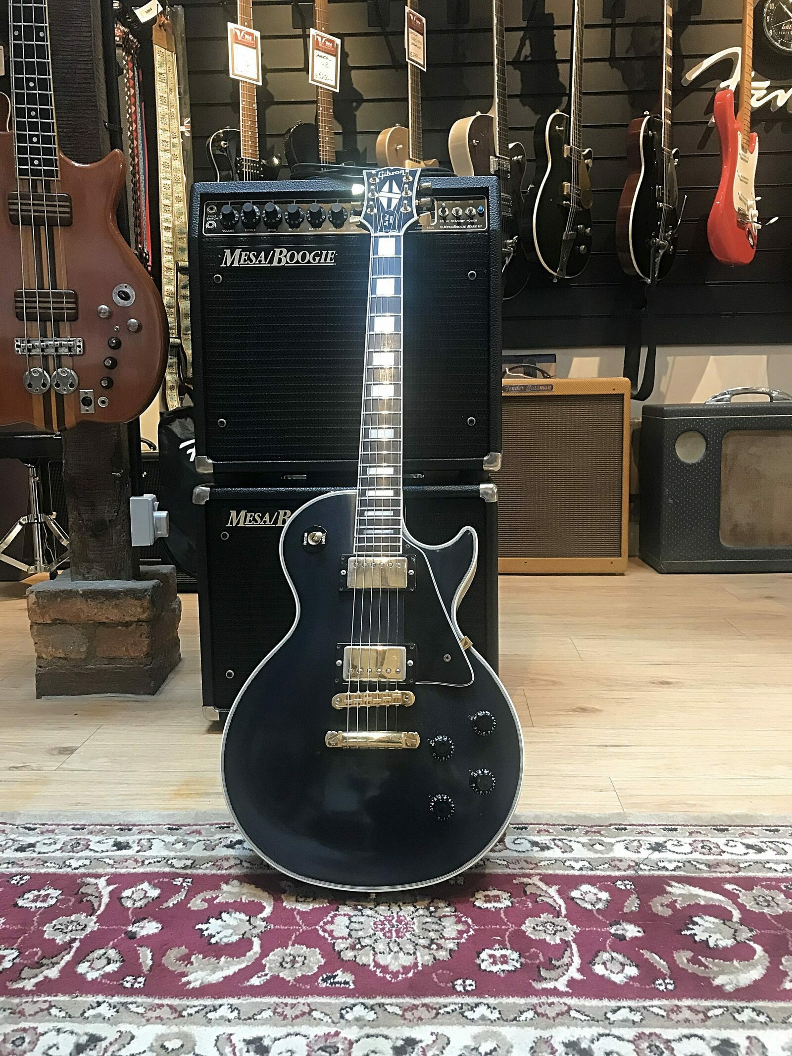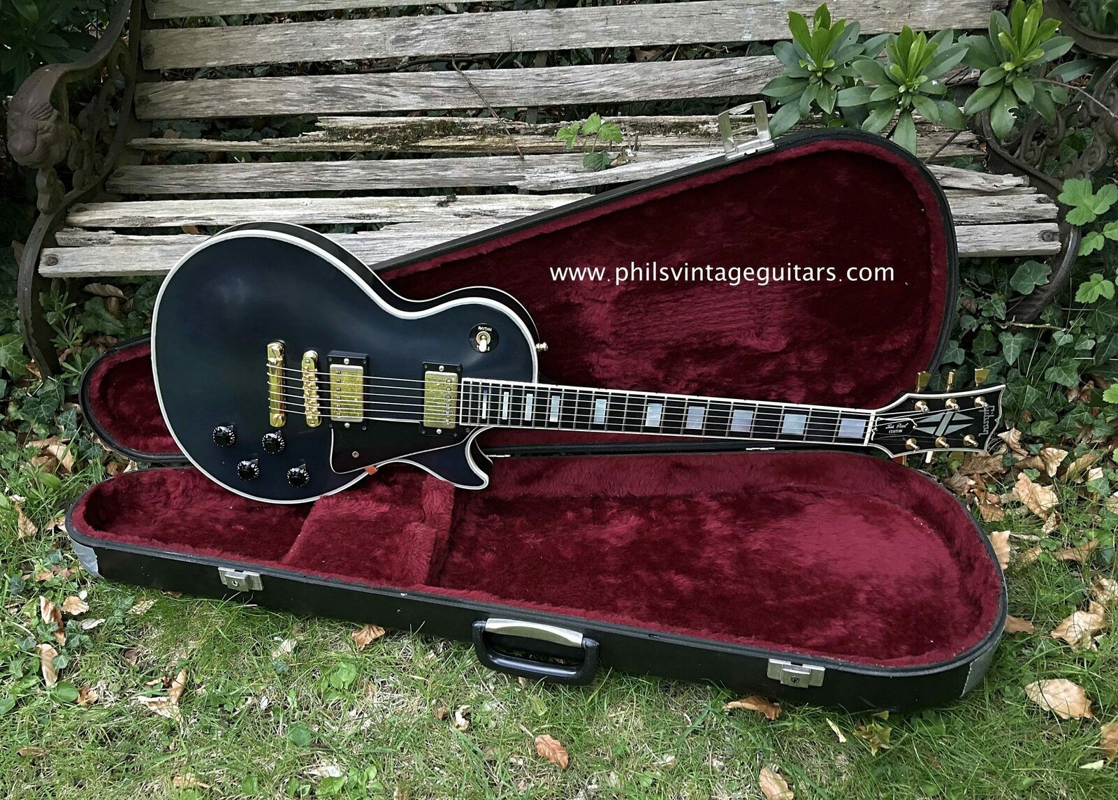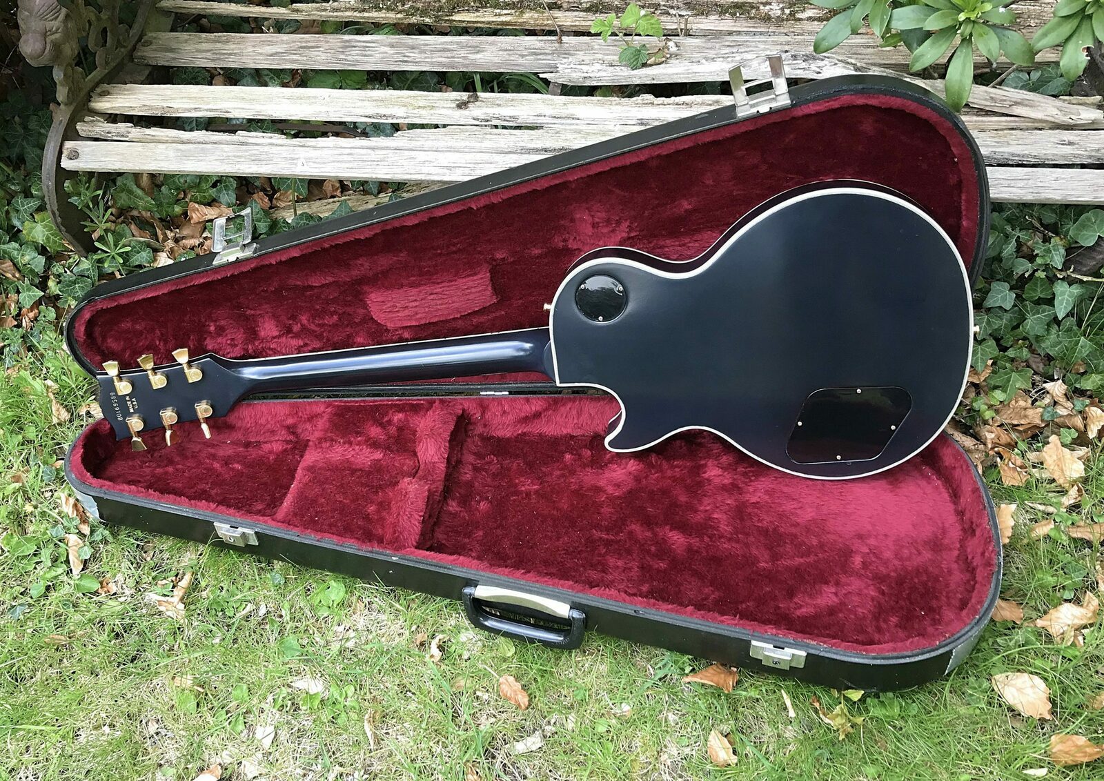 Cool one owner LP Custom that started life as a Sunburst guitar but the owner decided he preferred black and had the guitar refinished in a kind of graphite colour which we think looks rather awesome and certainly different. The factory stamped serial # has been inked in gold. Frets are original and the guitar plays smoothly without issue on the ebony board. There are no breaks or repairs other than the paint colour and the guitar weighs a usual for the time 10 lbs 7 and comes in the plastic abs case it was supplied in from new.