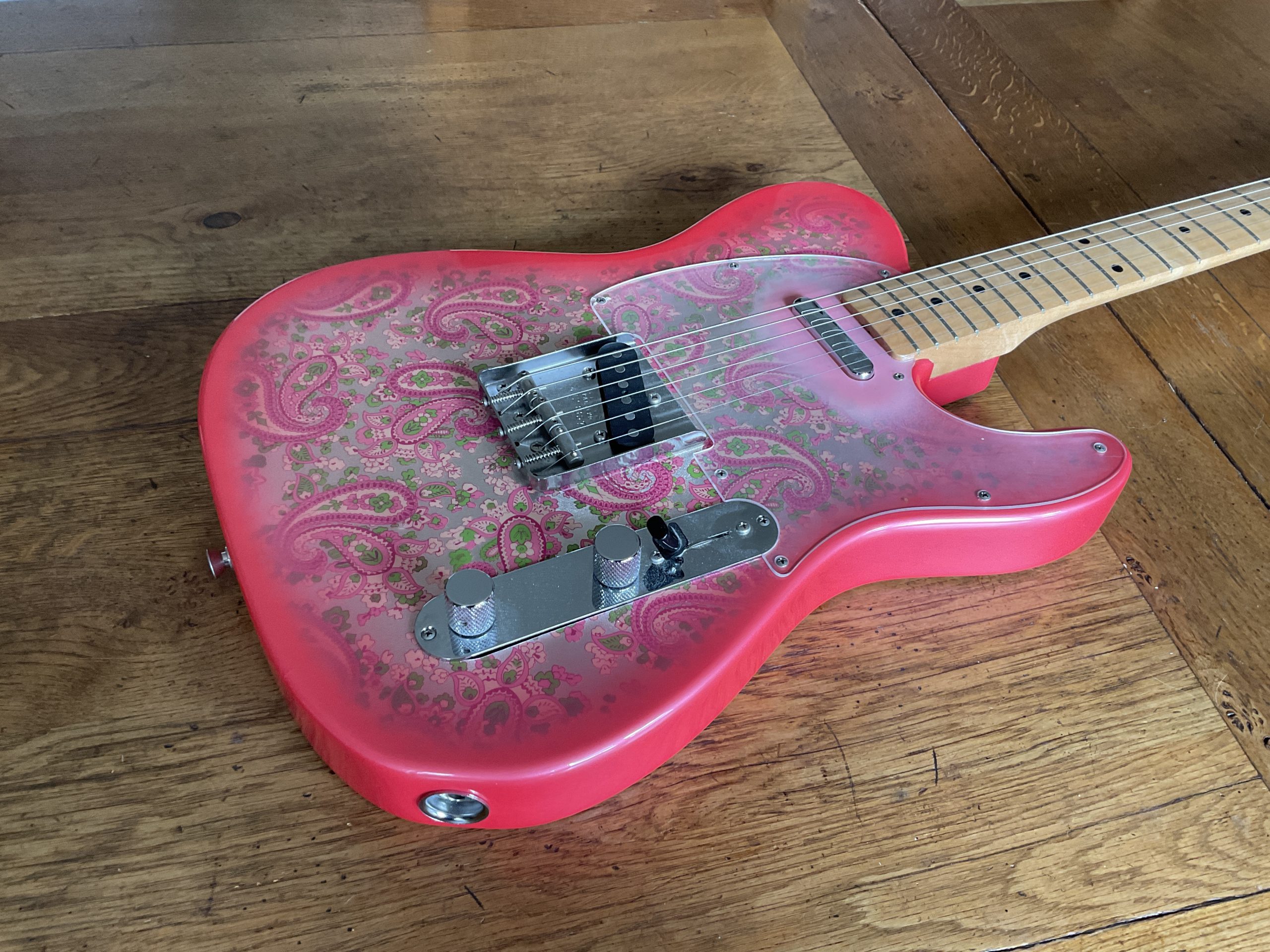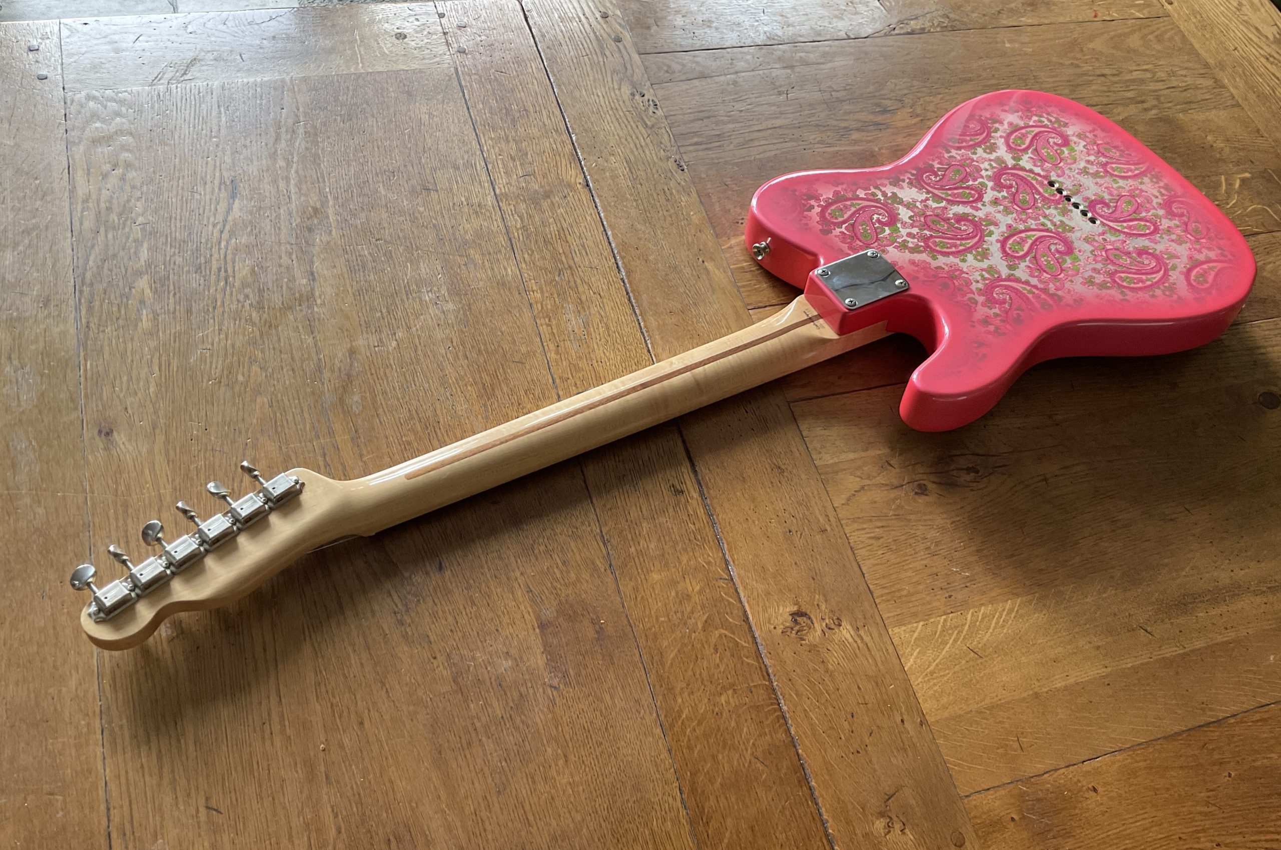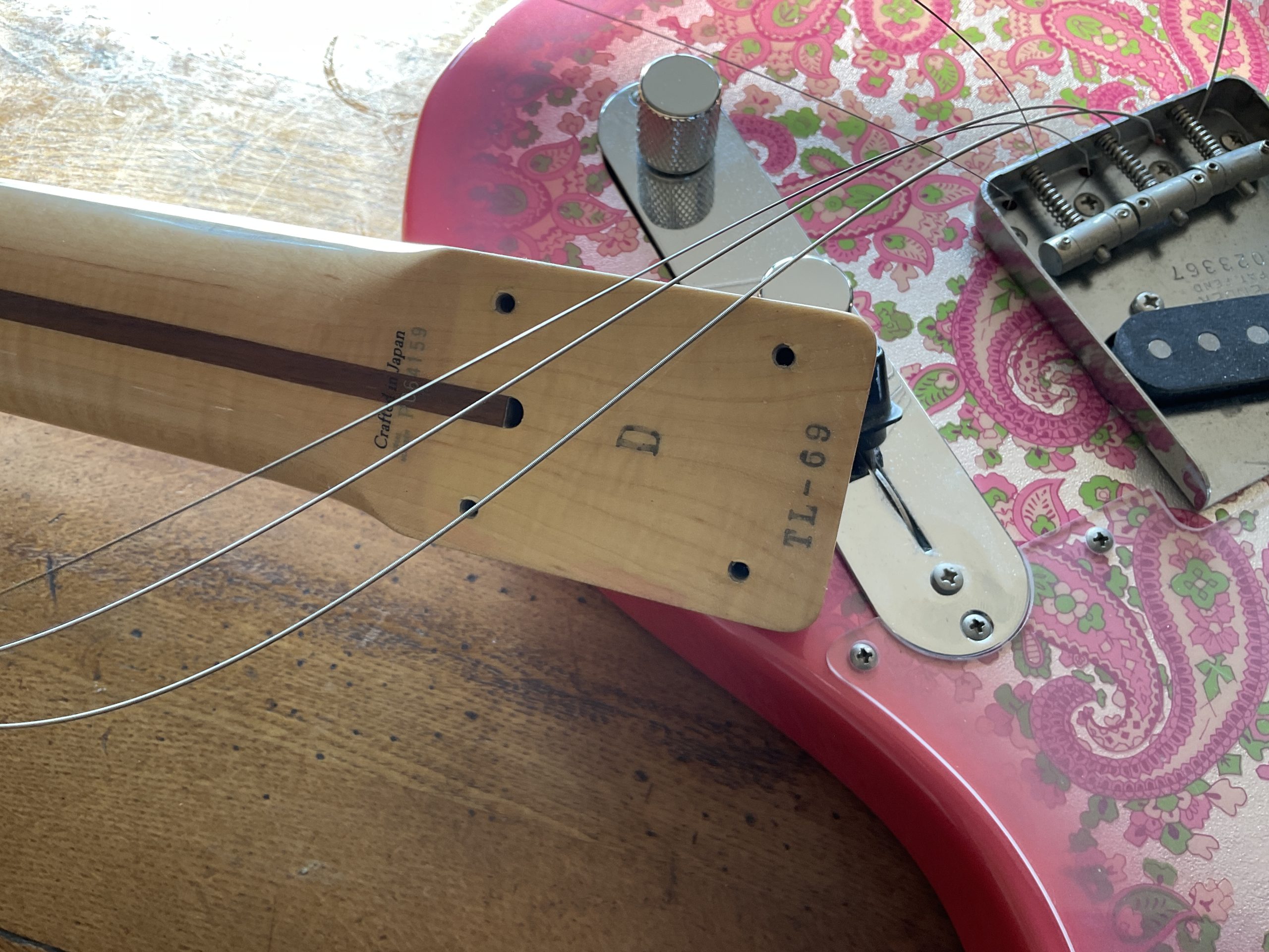 Here we have a “crafted in Japan” Pink Paisley Telecaster in superb original condition, there is virtually no wear to the guitar including the frets with the exception of a small crack to the guard around one of the screws. It weighs 8 lbs dead making it perfect for your next Vegas residency.