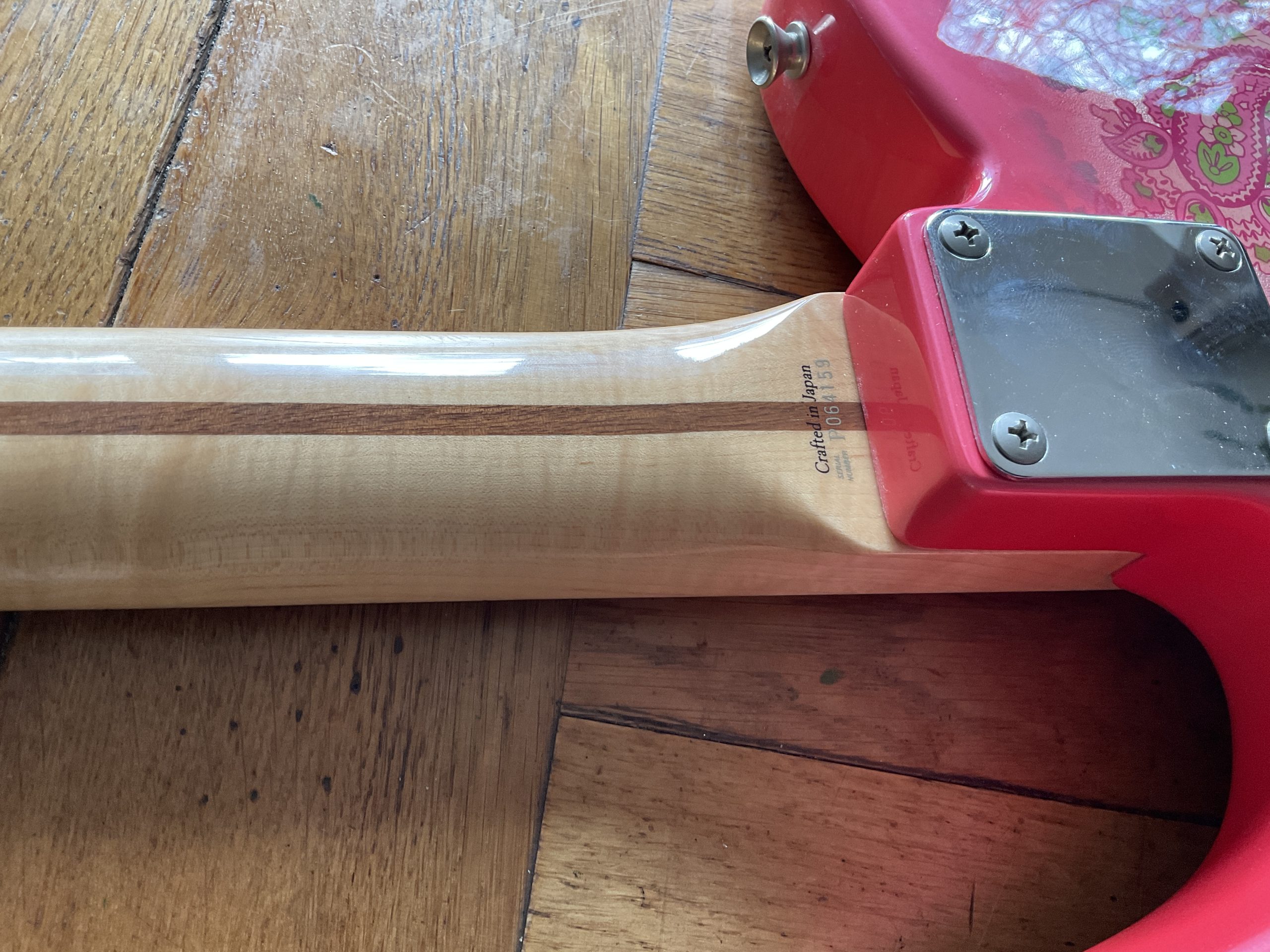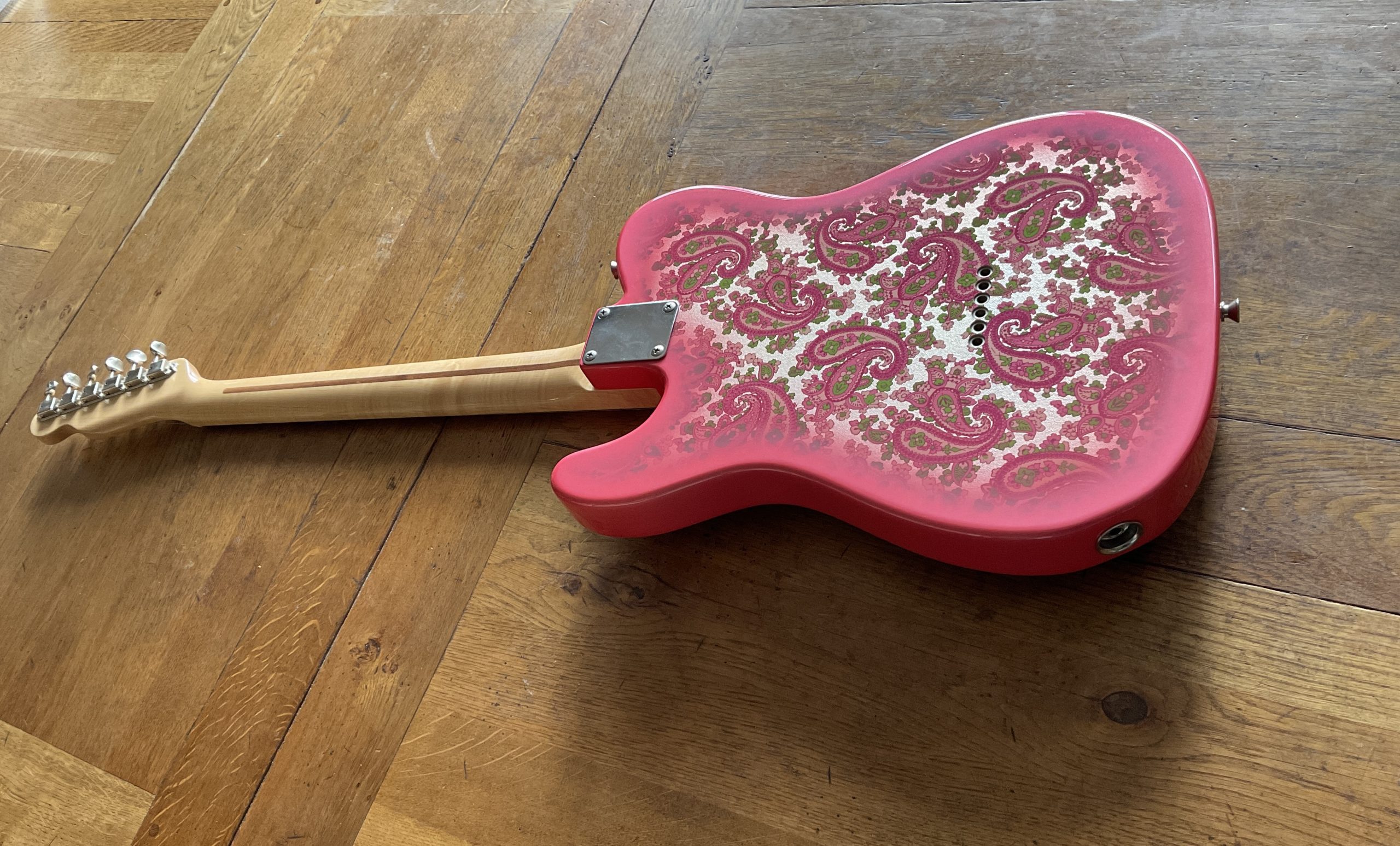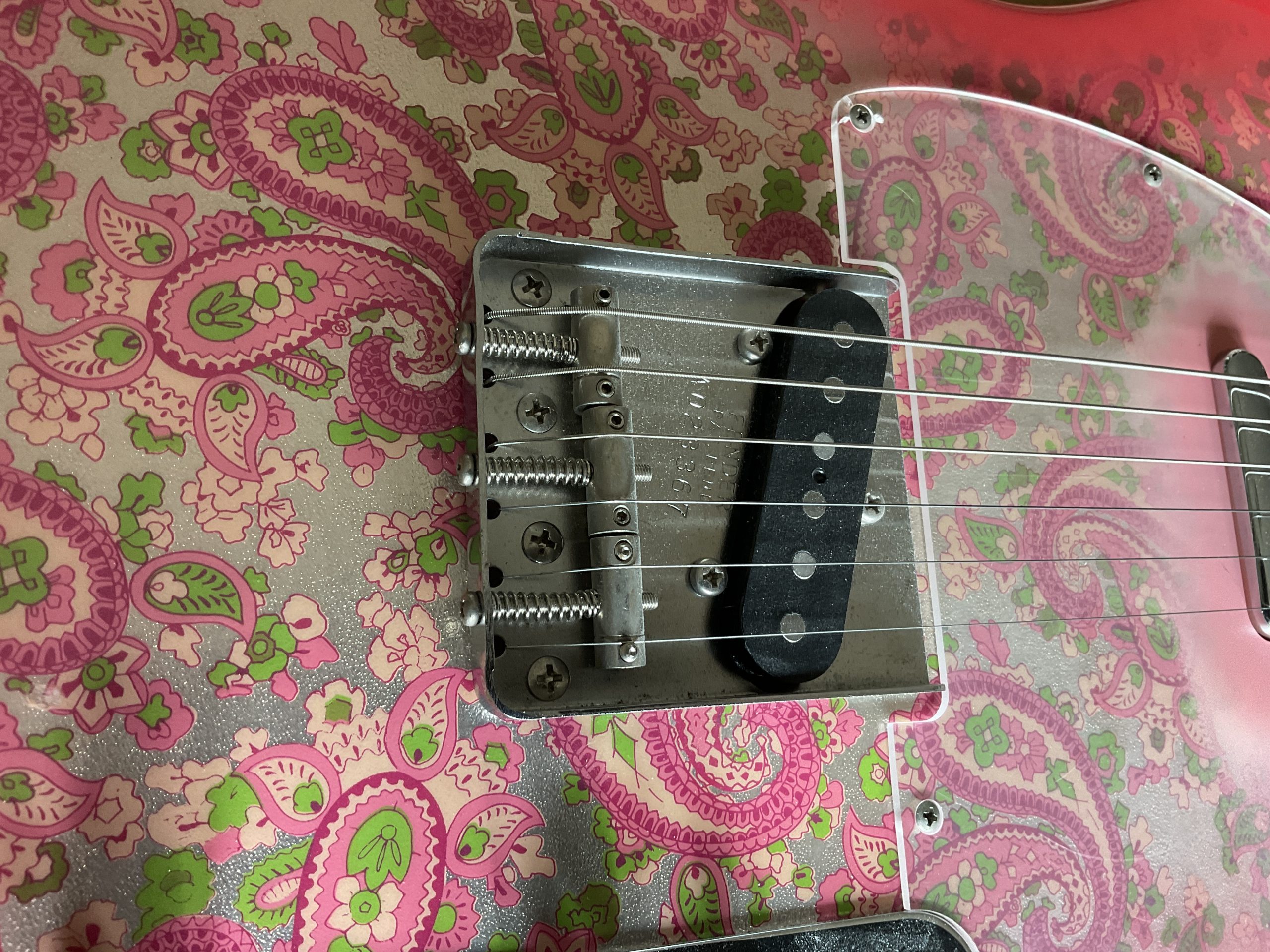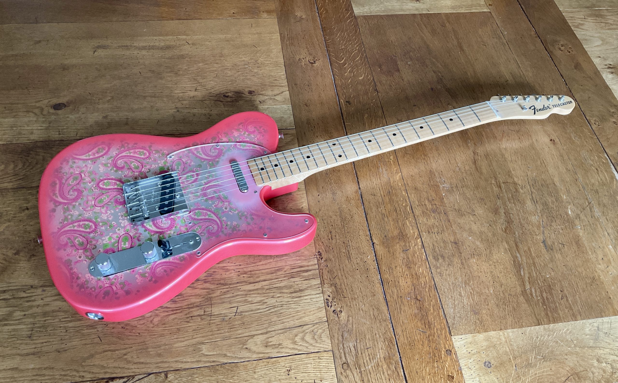 Here we have a “crafted in Japan” Pink Paisley Telecaster in superb original condition, there is virtually no wear to the guitar including the frets with the exception of a small crack to the guard around one of the screws. It weighs 8 lbs dead making it perfect for your next Vegas residency.