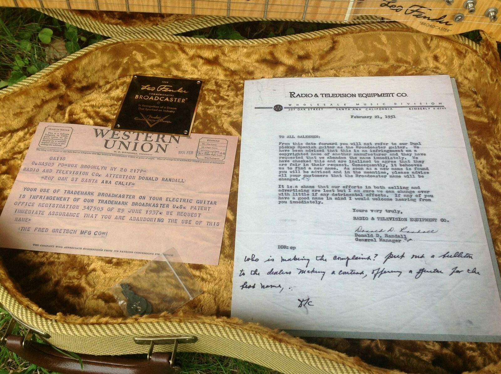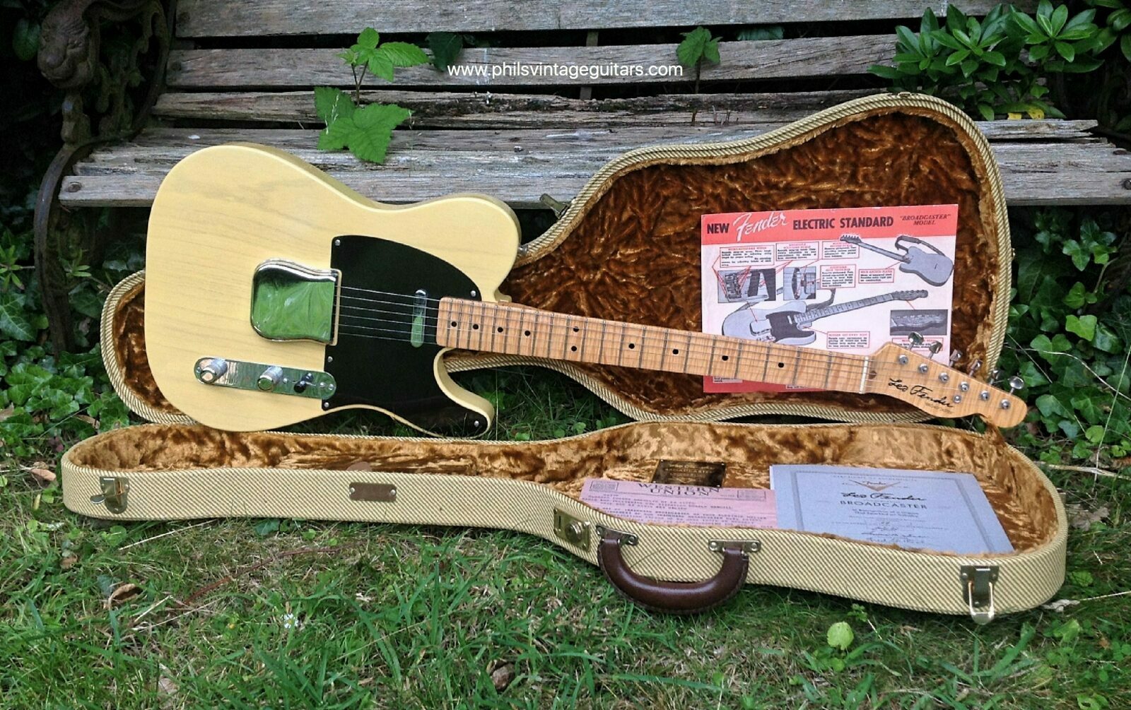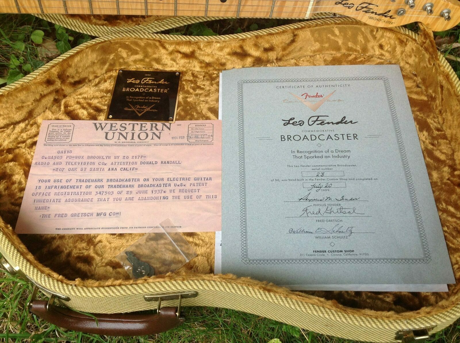 This is a very fine Fender Custom Shop Leo Fender Broadcaster Commemorative Edition #23 of 50. It is a rare Custom Shop guitar from 1999, built to 1950 Broadcaster specs with butterscotch blonde finish on a nicely grained Ash body with attractively grained Flame Maple neck. 1-5/8″ nut width with 25-1/2″ scale length. Two Fender Custom Shop single coil pickups with vintage-style wiring. Chrome hardware throughout with three-barrel bridge. There is the official Leo Fender signature on the headstock (authorised by his estate) and a lovely collection of special commemorative paperwork. The Fender Custom Shop certificate bears the signatures of Phyllis Fender (Leo’s widow), Fred Gretsch (see below for the Gretsch connection) and Fender’s William Schultz. Only fifty of these special tribute instruments were made echoing Leo’s original design and materials from 1950. Number 001 went to the Fender Museum. 002 went to Phyllis Fender 003 went to Fred Gretsch. The history of the model; the original edition of this guitar was named Esquire and featured a single pickup and no truss rod. After limited production and field testing, Fender realised the apparent need to reinforce the neck and began plans to fit the neck with a truss rod. By the time they were ready for full production, the decision was made to also include a second pickup. Eager for an entry into new markets, Fender’s head of sales named it the Broadcaster. On February 20, 1951, the company received a telegram from the Fred Gretsch Manufacturing Co. stating that use of the Broadcaster name was an infringement of Gretsch’s registered trademark used on their Broadkaster model drums, and that use of this name must cease. Fender immediately complied with the request and the Fender Broadcaster was no more. Instead it temporarily became the ‘Nocaster’ and then, permanently, the Telecaster. This example is in lovely condition and comes complete with the commemorative nameplate that was issued with USA home-market examples to go with the wall display case which was also included in America. Exported examples, like this one, did not have the wall display case. With shaped Fender tweed hard case. In addition to being a wonderful guitar, this Leo Fender Commemorative Broadcaster (number 23 of only 50 made) must also be a fine long-term investment.