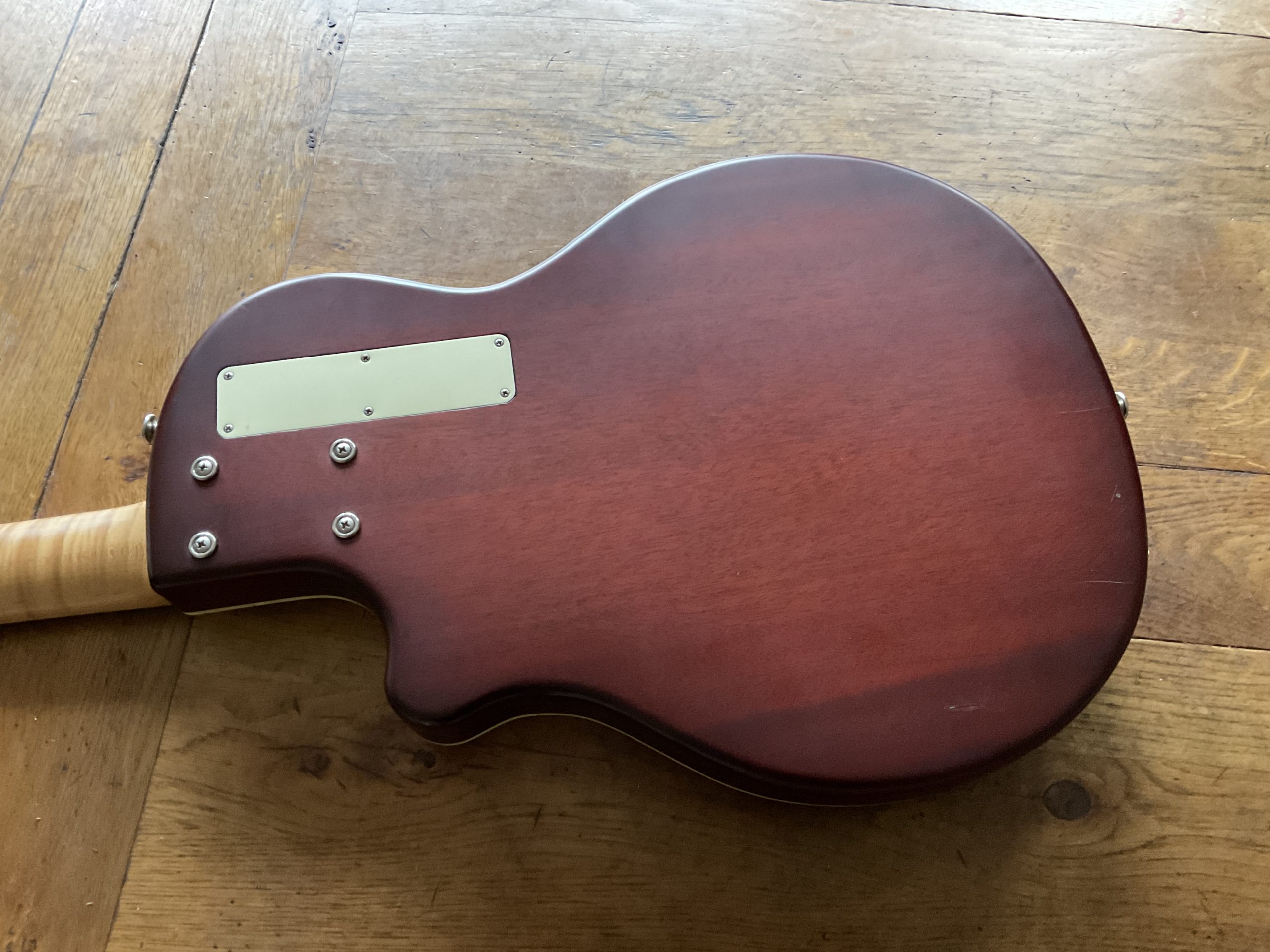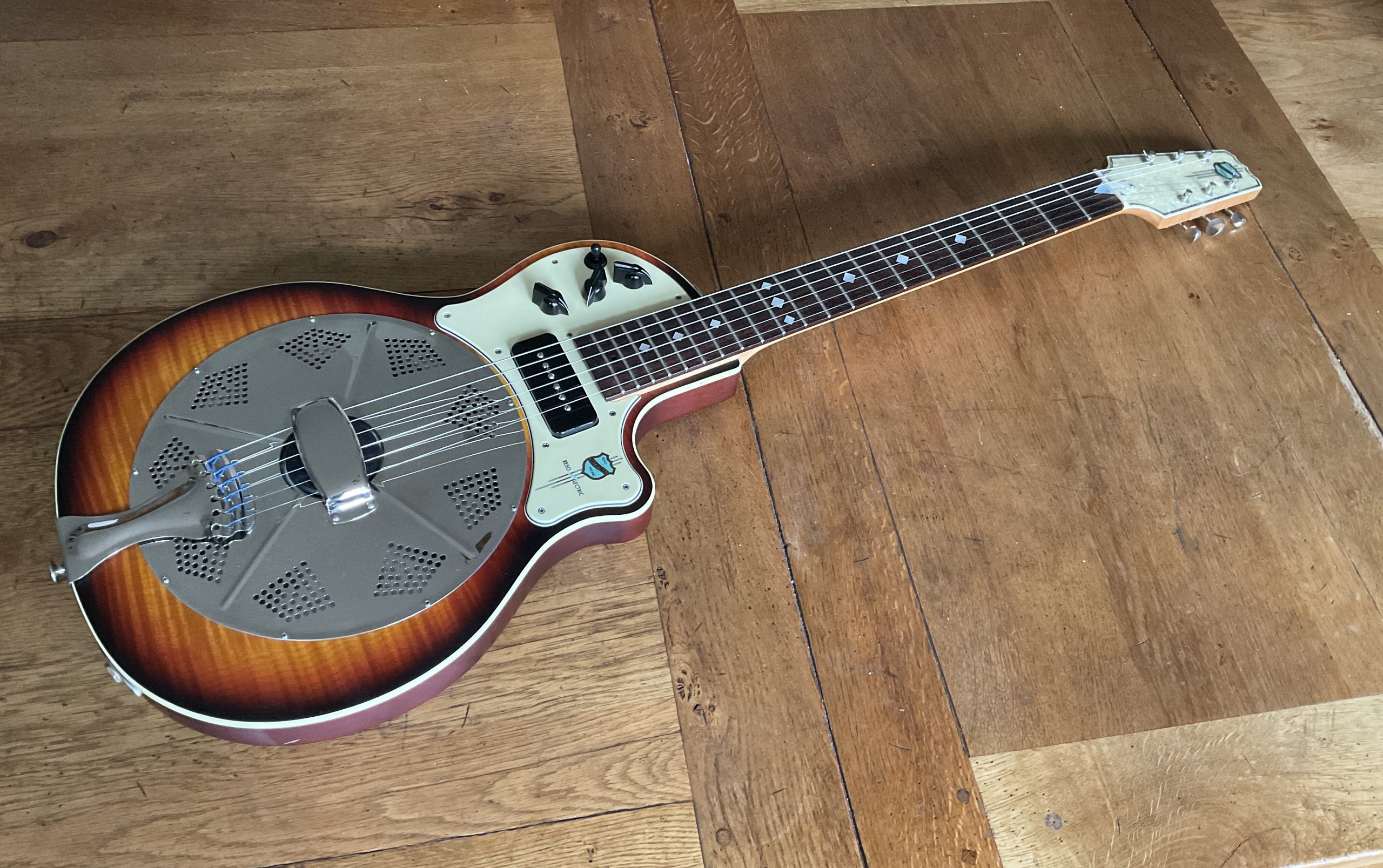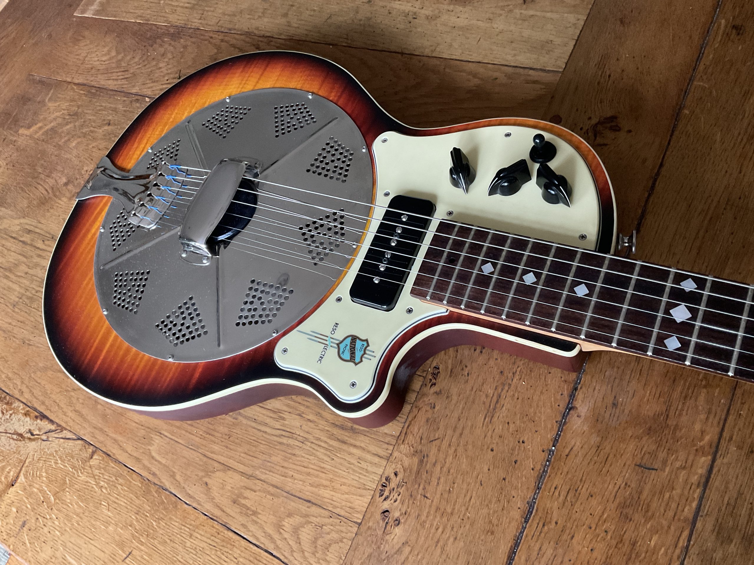 Very cool National Resolectric featuring a P90 at the neck and a Highlander IP-1X Piezo pickup in the saddle with all the associated blend options via the 3 chicken head controls. Lovely flame maple top and neck in satin finish weighing just 7 lbs 6oz. Roomy 45mm nut with a 25 3/4″ scale length. Fabulous pearloid headstock overlay and pearl diamond inlays on the rosewood board all in superb condition with no fret wear. Comes with its fitted National case.