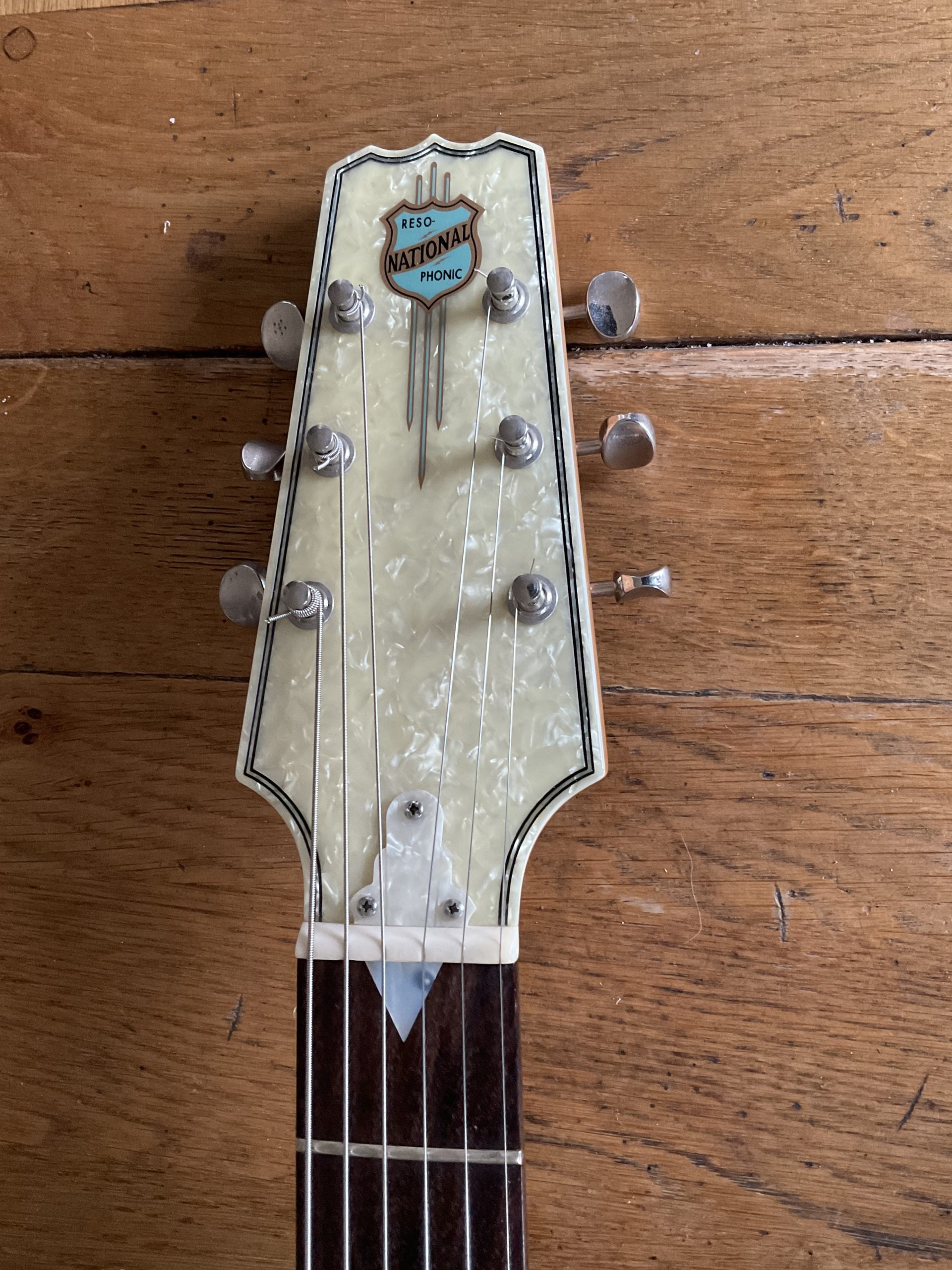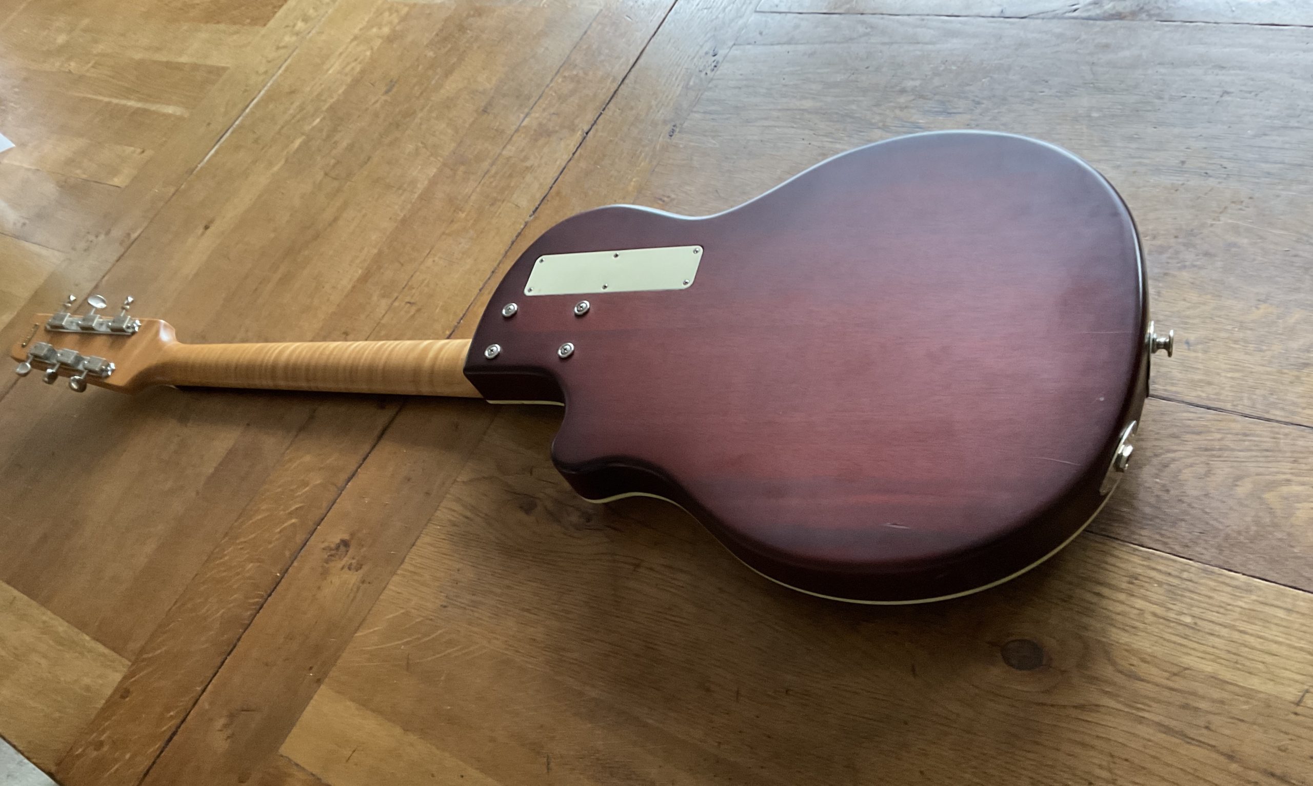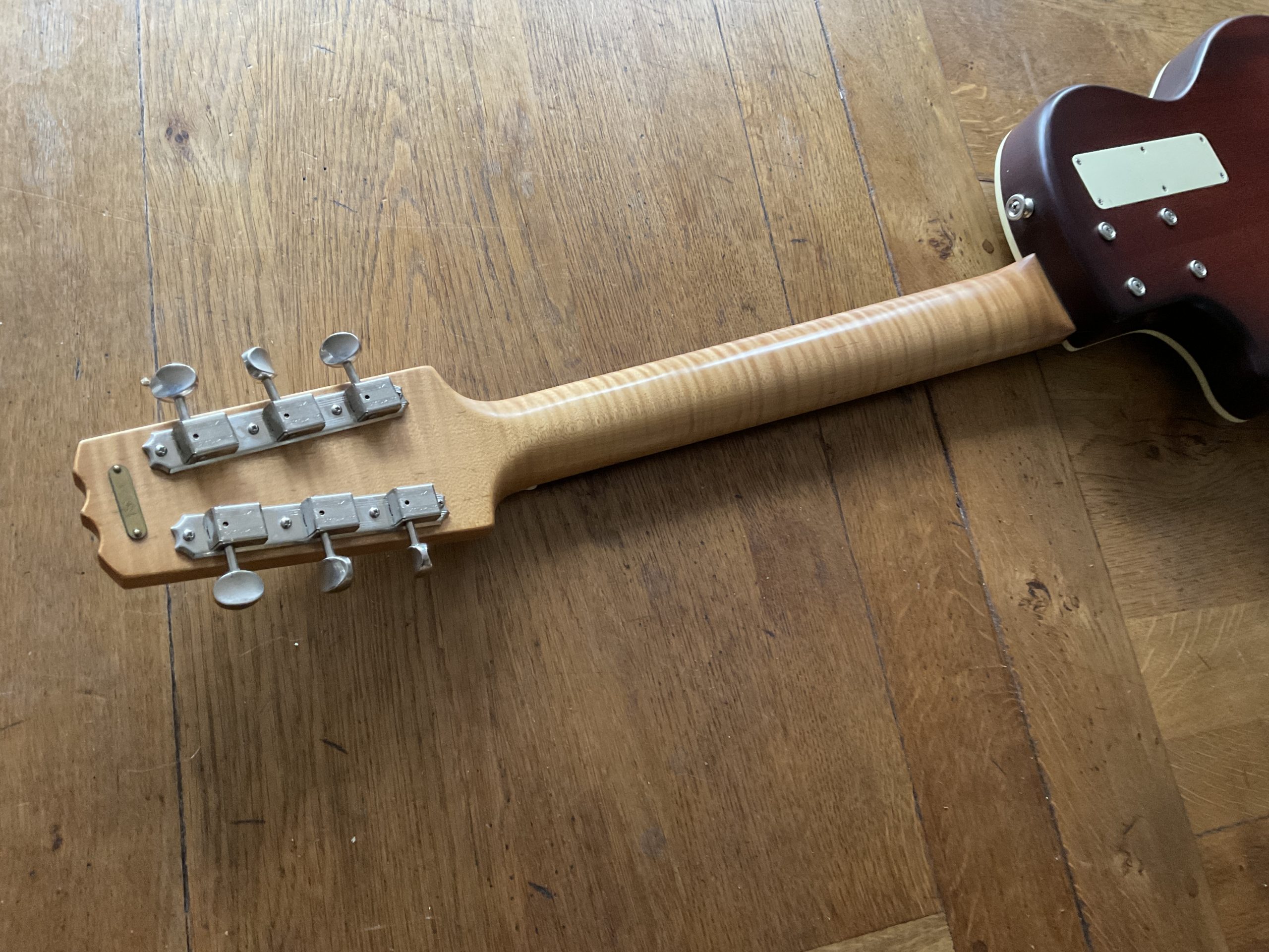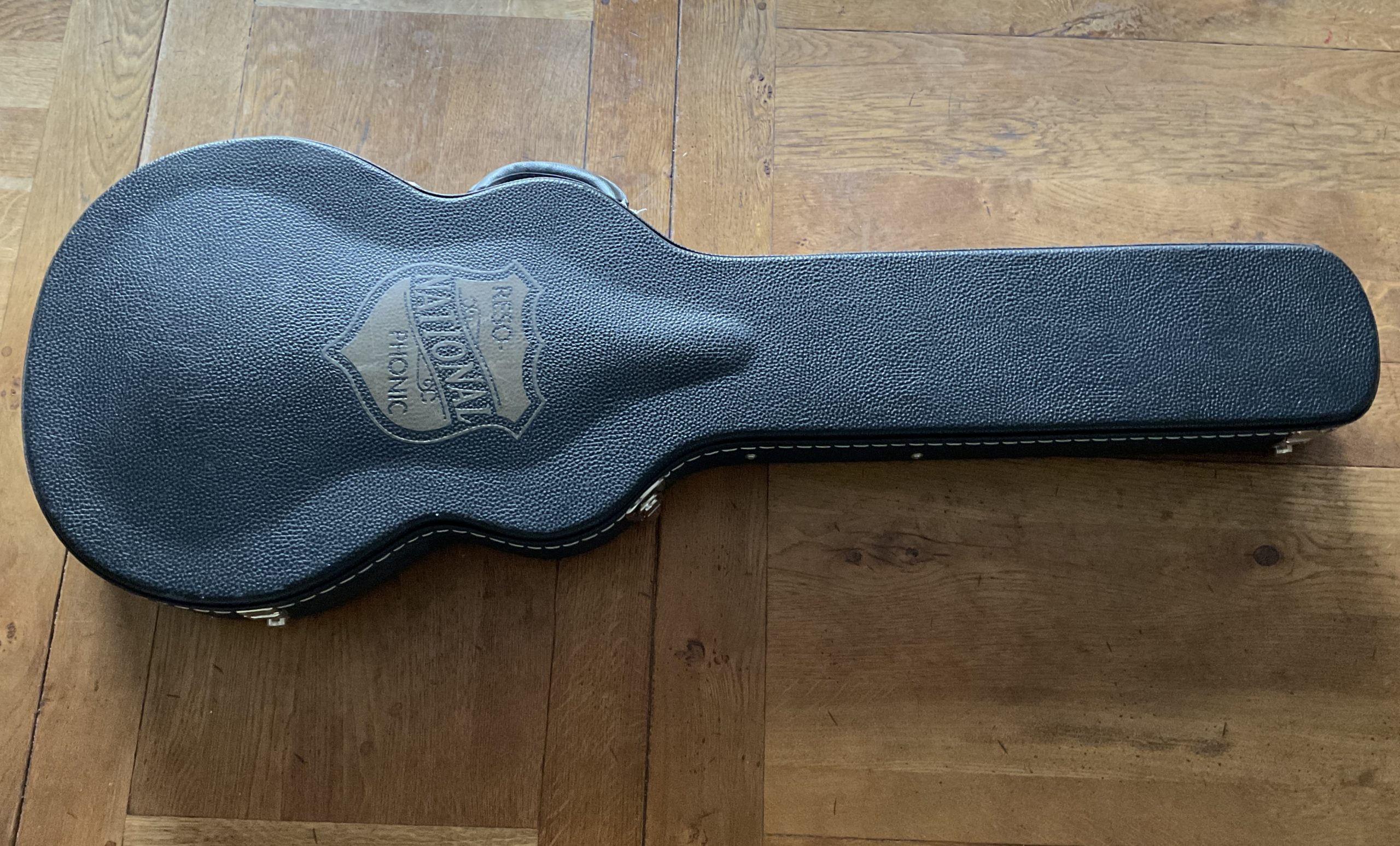 Very cool National Resolectric featuring a P90 at the neck and a Highlander IP-1X Piezo pickup in the saddle with all the associated blend options via the 3 chicken head controls. Lovely flame maple top and neck in satin finish weighing just 7 lbs 6oz. Roomy 45mm nut with a 25 3/4″ scale length. Fabulous pearloid headstock overlay and pearl diamond inlays on the rosewood board all in superb condition with no fret wear. Comes with its fitted National case.