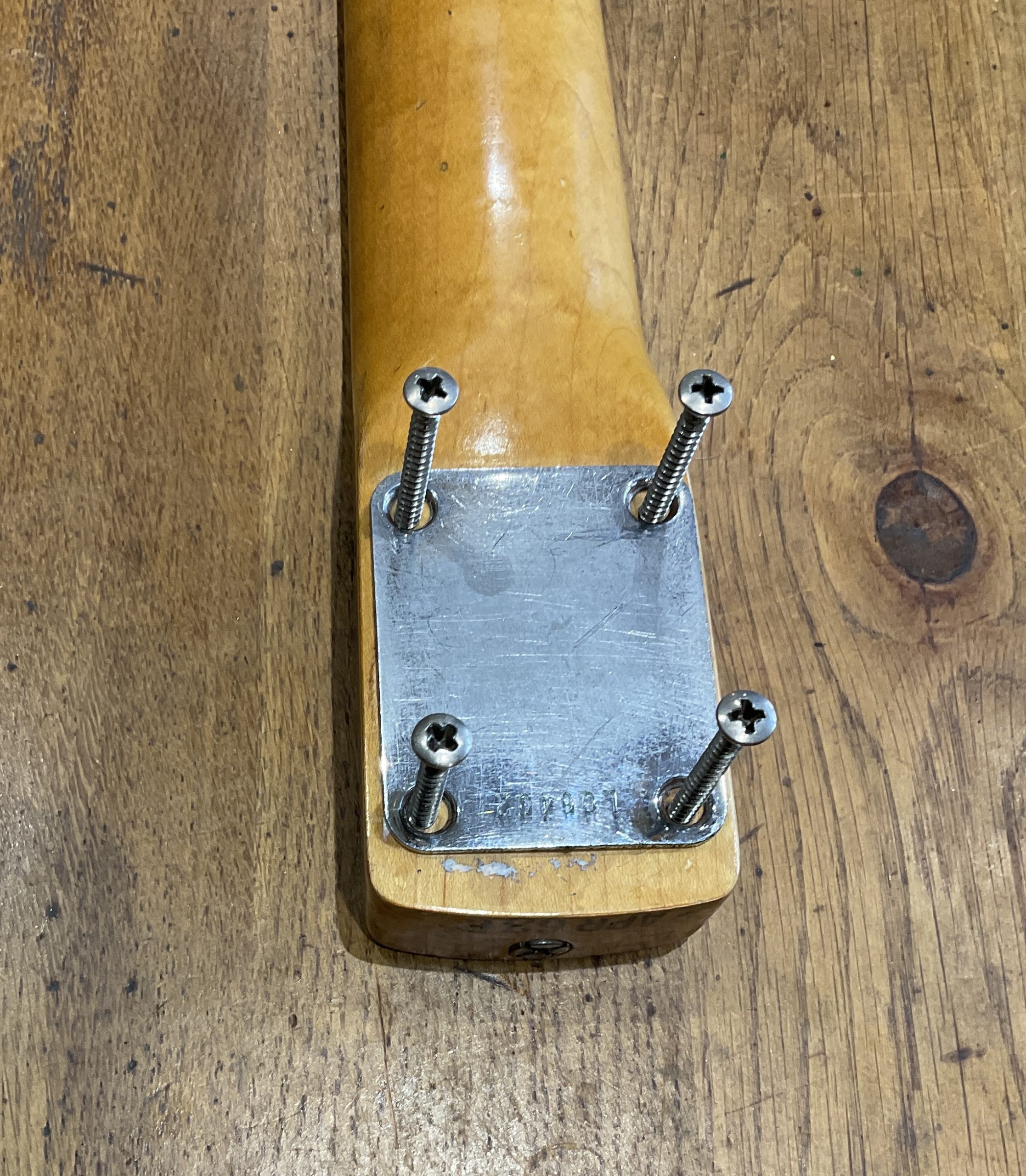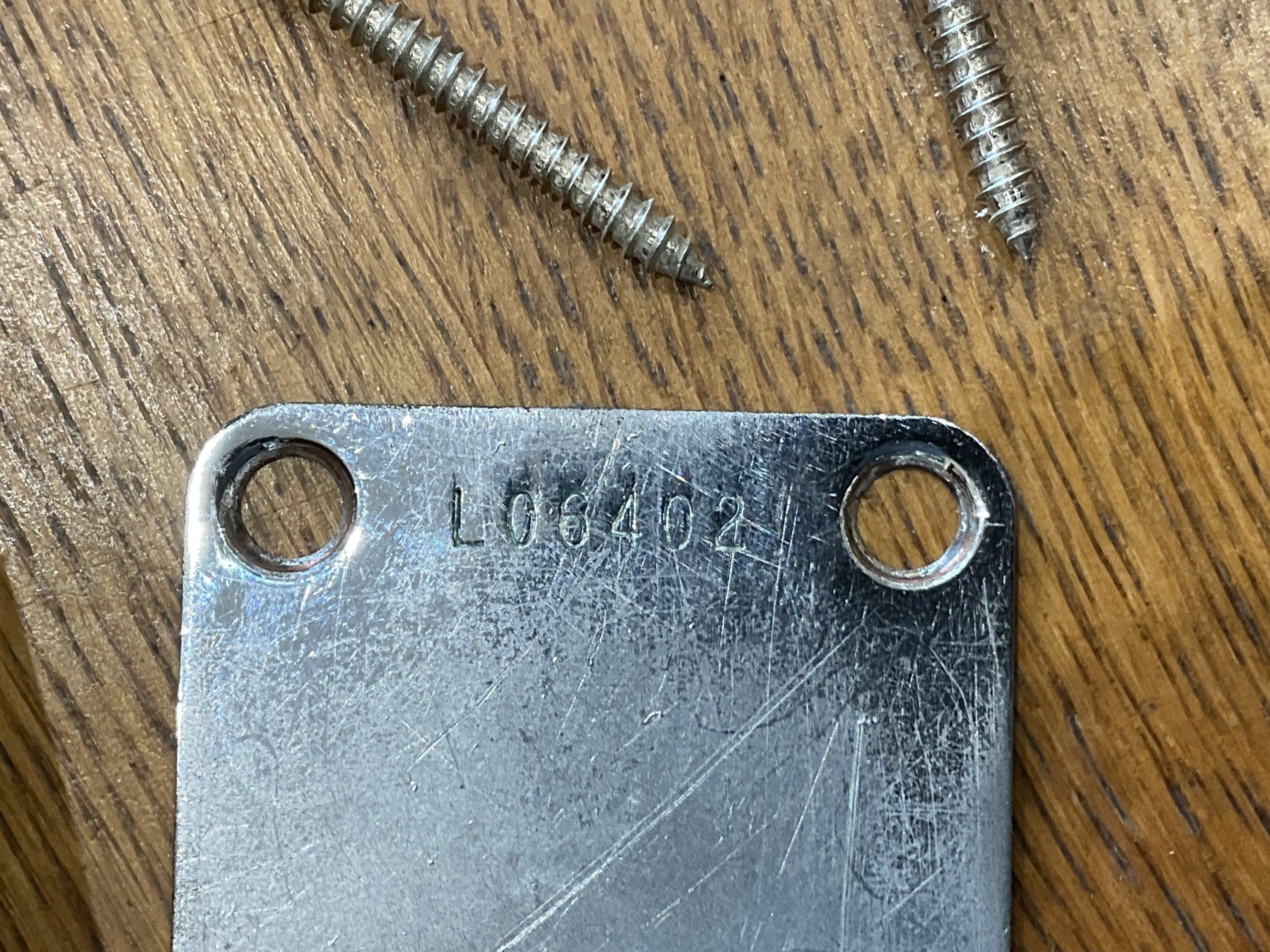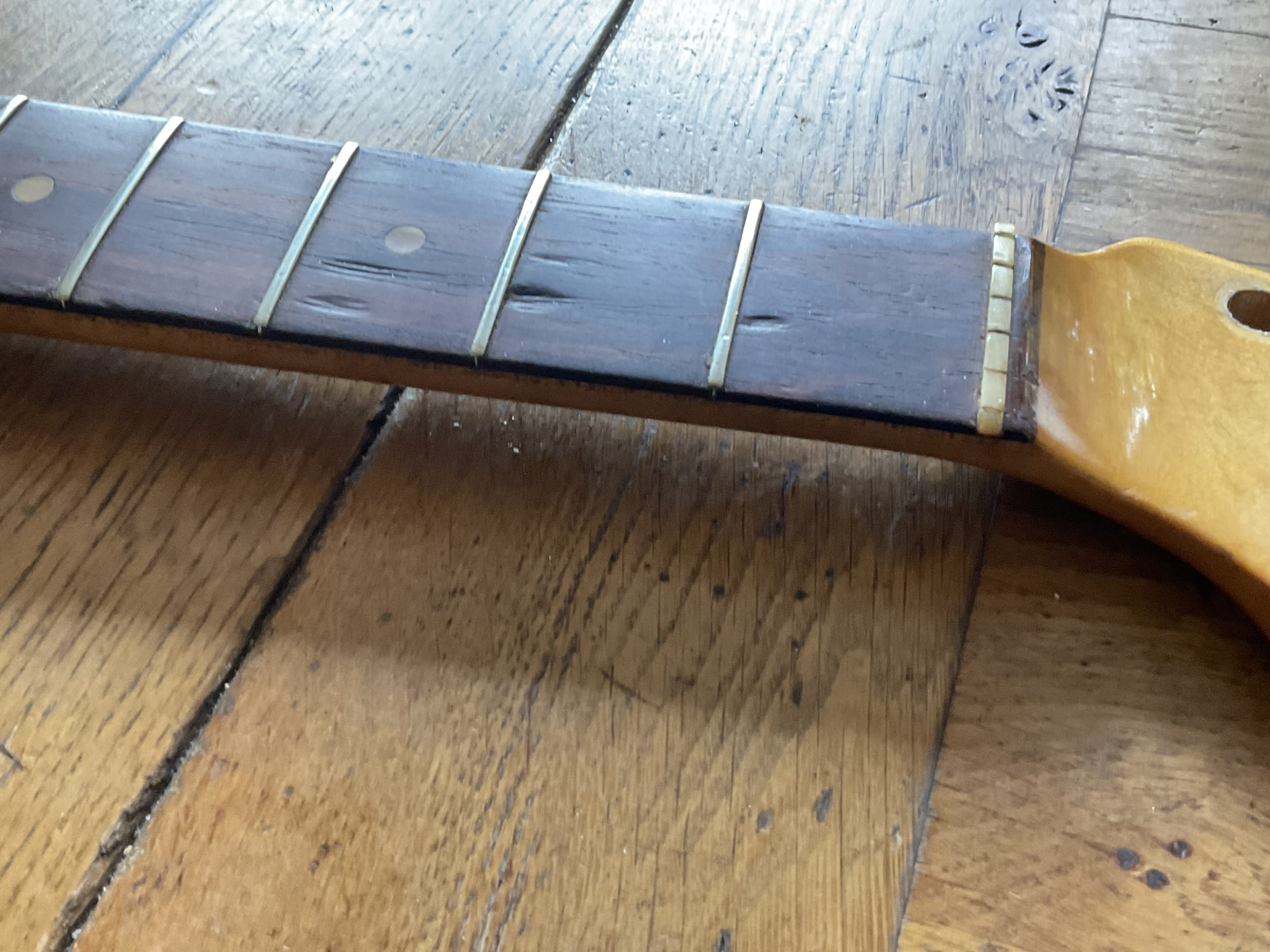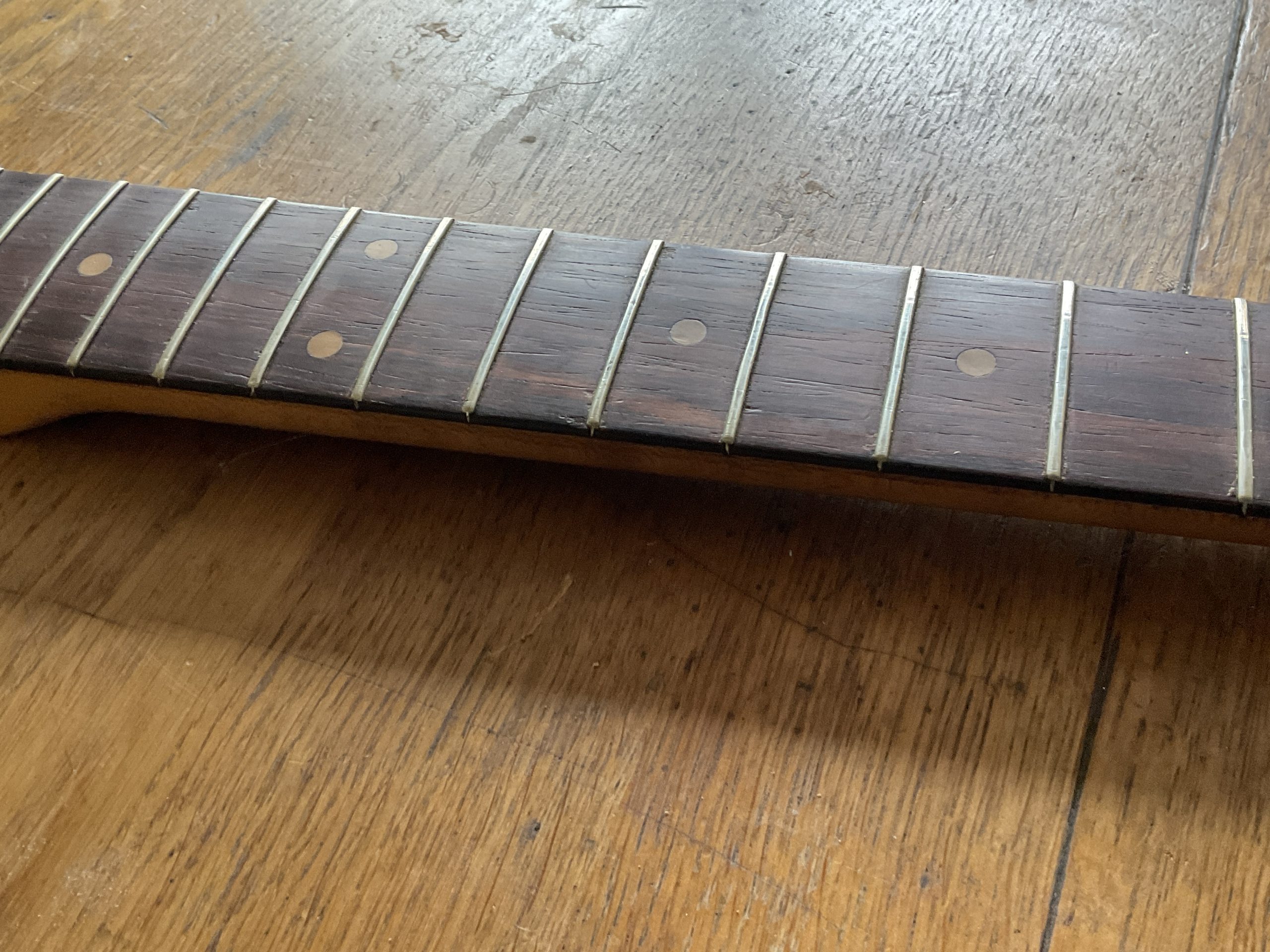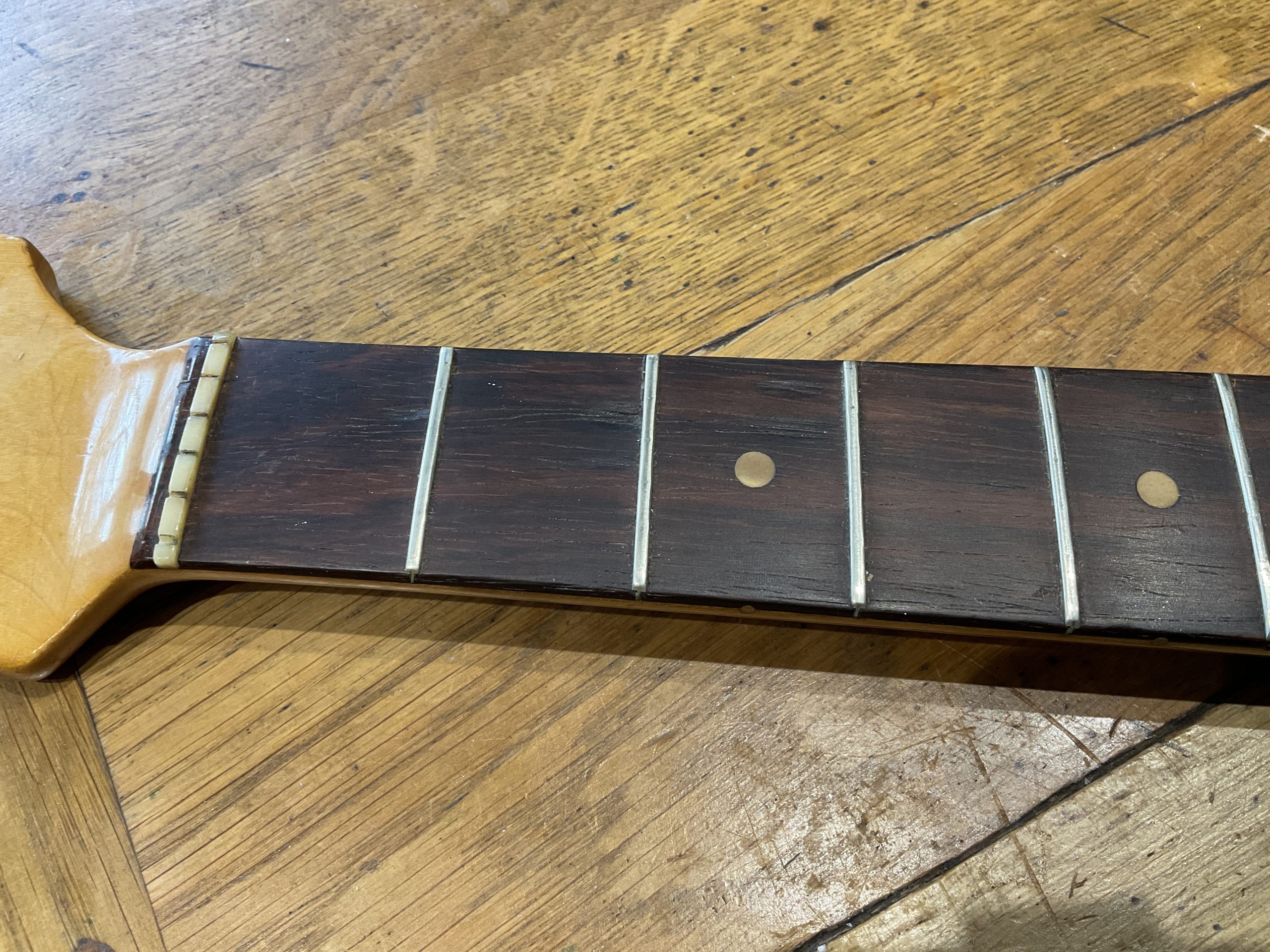 We have recently taken in a pile of vintage guitar parts, this is a great opportunity to either upgrade your guitar or make good your own pre CBS guitar. Its dated April 1963 and comes with its 1963 neck plate and screws, it’s a veneer rosewood board with clay dots and in good condition with some of the usual rutting in the first 3 positions. The neck is straight and the truss rod works well both ways, it has been lightly over sprayed in nitro over the original finish with a quality reproduction raised logo. It’s had other tuners on it but all holes are covered by standard Kluson tuners and the peg holes have not been enlarged although there is some chipping to the face of the G and B peg hole from past amateur ferrel removal. It also has 2 filled extra string tree holes with the original string tree and spacer present and the nut and frets look to be original and are in good condition, all in all a great neck ready to bolt on and play.