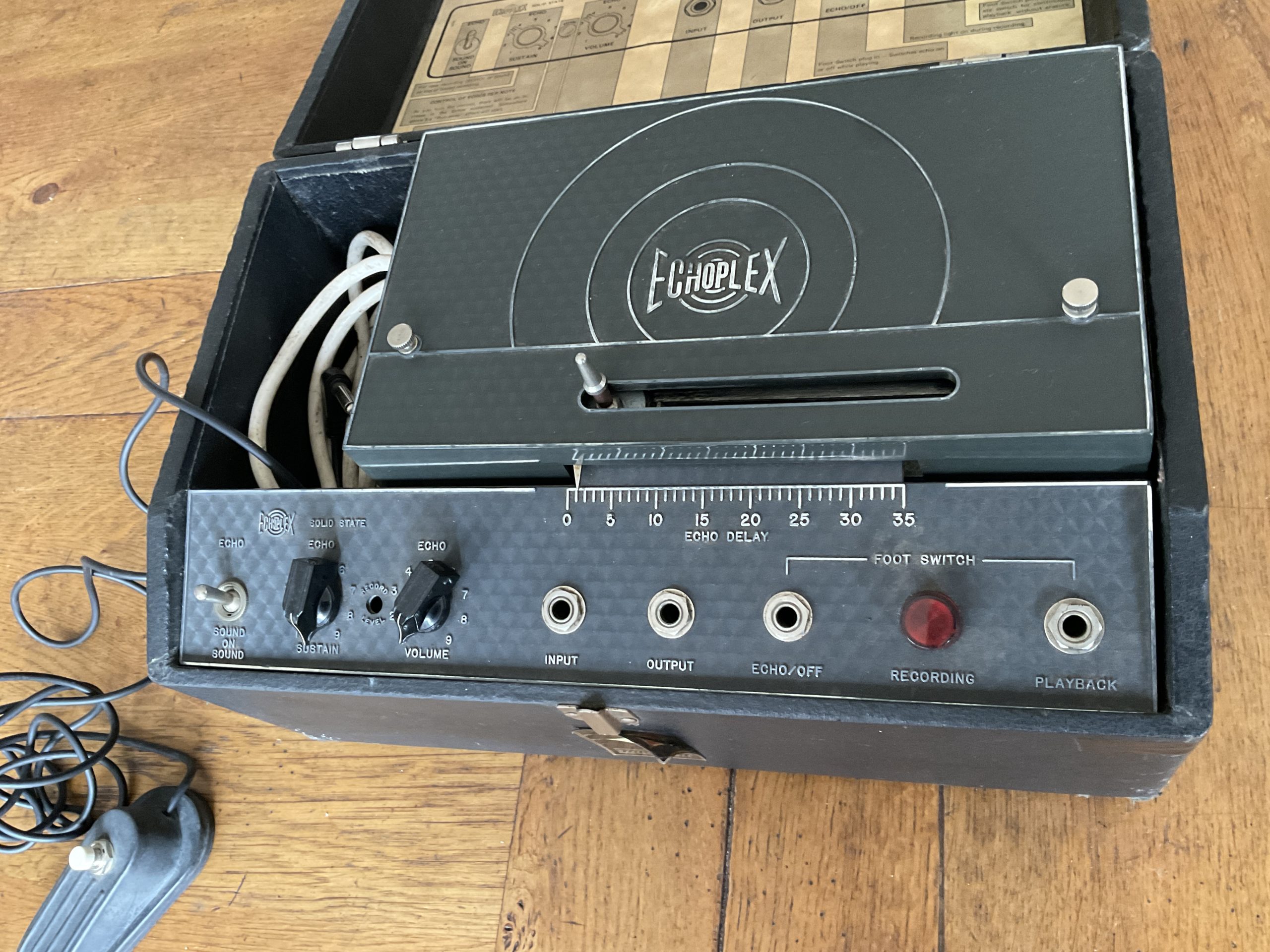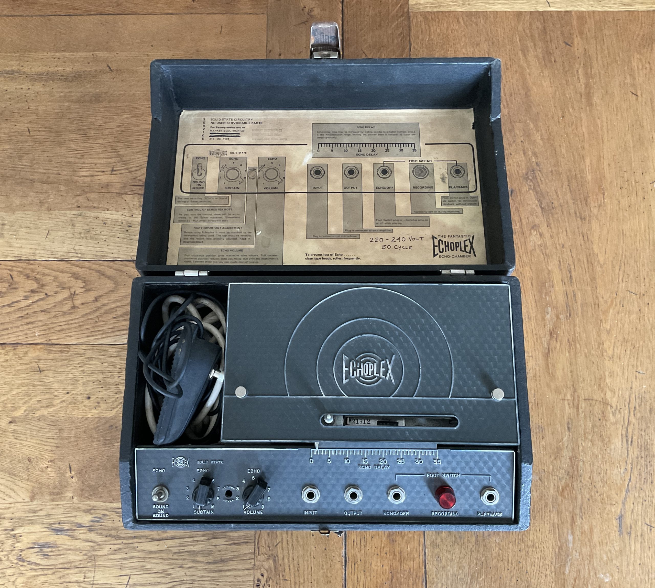 Here we have a good example of this legendary tape echo as used by countless artists including John Martyn and Robert Fripp who made good use of the “sound on sound” feature this machine offers. Its complete and working well and has had a new tape cassette fitted and comes with two new spares. It has its foot switch and this unit looks to be a factory 240v version which negates having to use an external 240v-110v step down transformer. One of the potentiometers is dated 1974 which fits the serial number range.